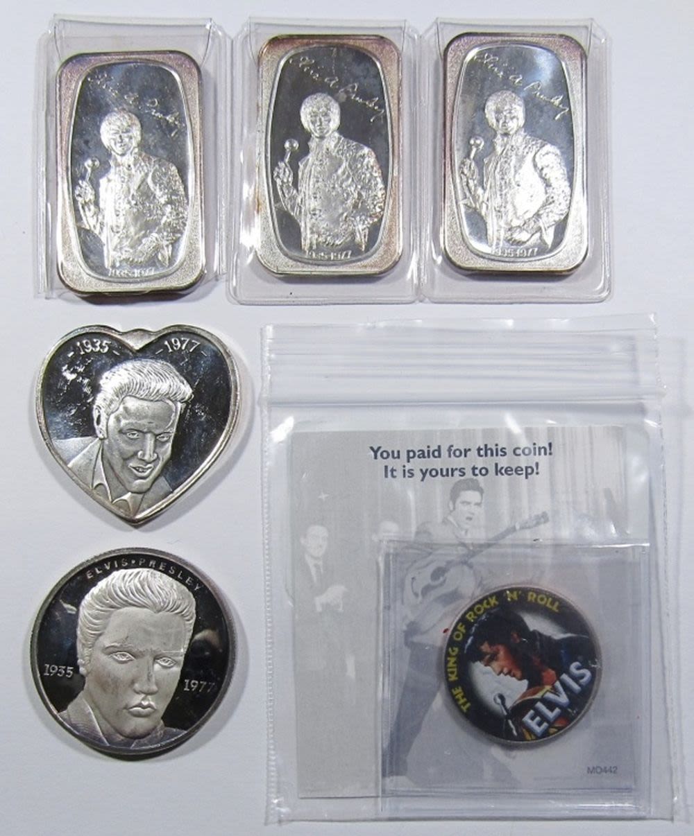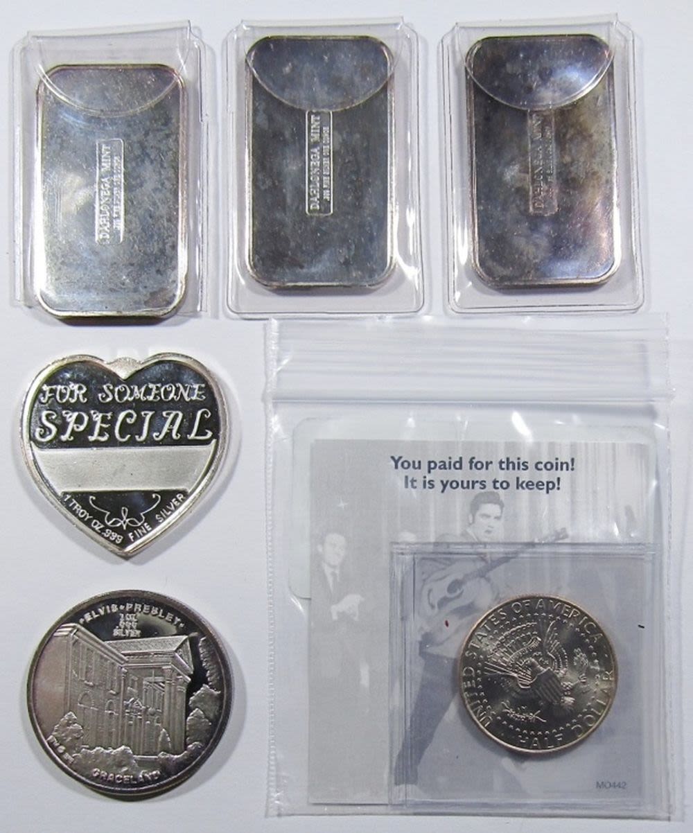 THREE 1oz SILVER BARS, ONE 1oz SILVER HEART, ONE 1oz SILVER ROUND, AND ONE COLORIZED 2013 KENNEDY HALF DOLLAR.