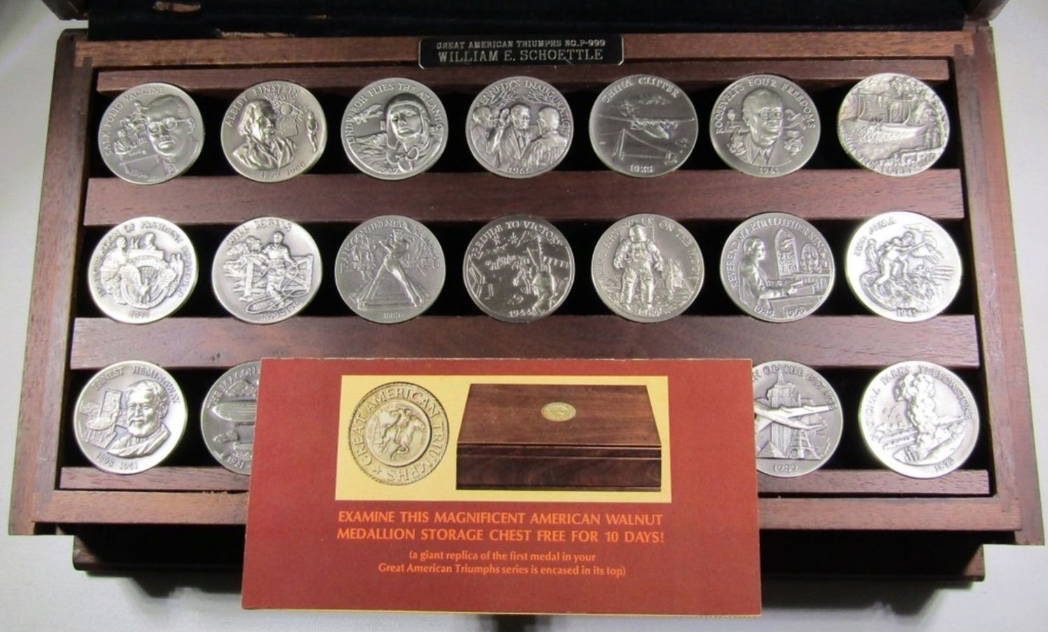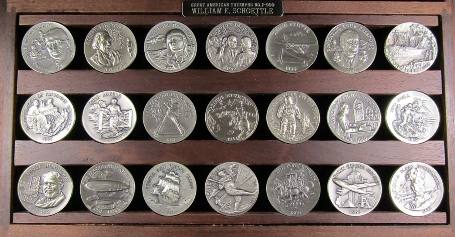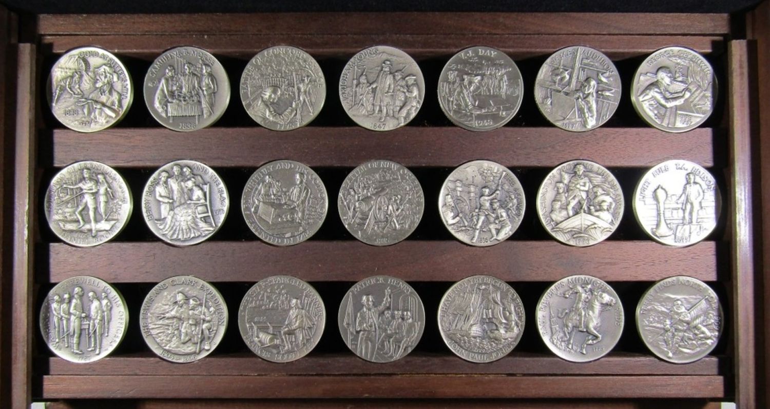 60 STERLING SILVER MEDALS, IN WALNUT STORAGE CHEST, THE LONGINES SYMPHONETTE SOCIETY. APPROX TOTAL WEIGHT 67.4 TROY OZ .925 SILVER. ONE MEDAL INCLUDES 2 DIAMOND CHIPS.