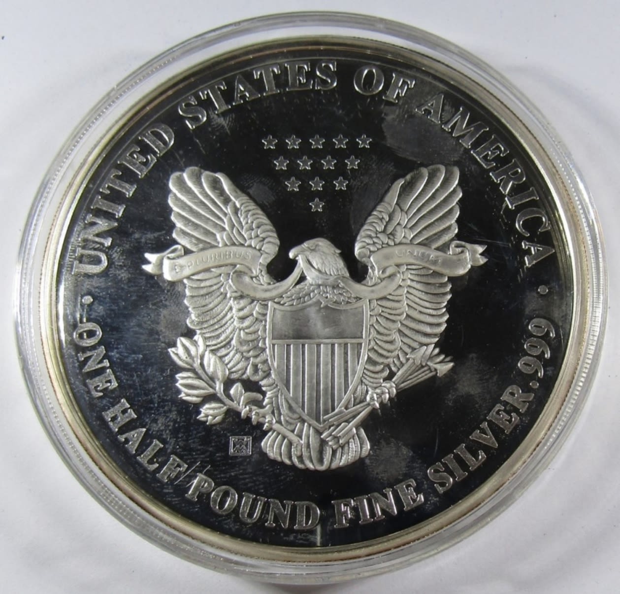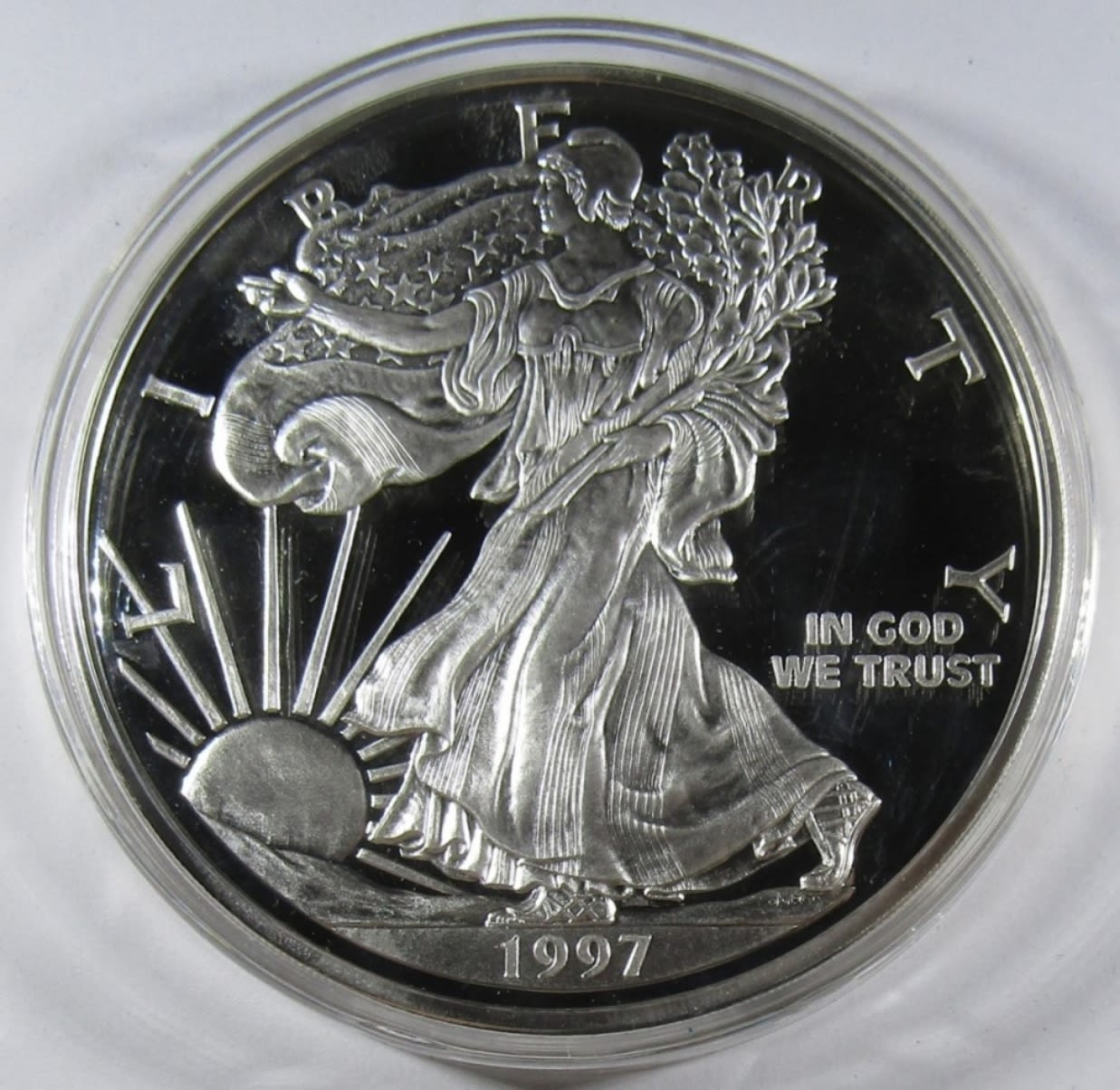 8 TROY OZ SILVER PROOF REPLICA OF 1997 SILVER EAGLE, IN BOX WITH COA. WASHINGTON MINT.