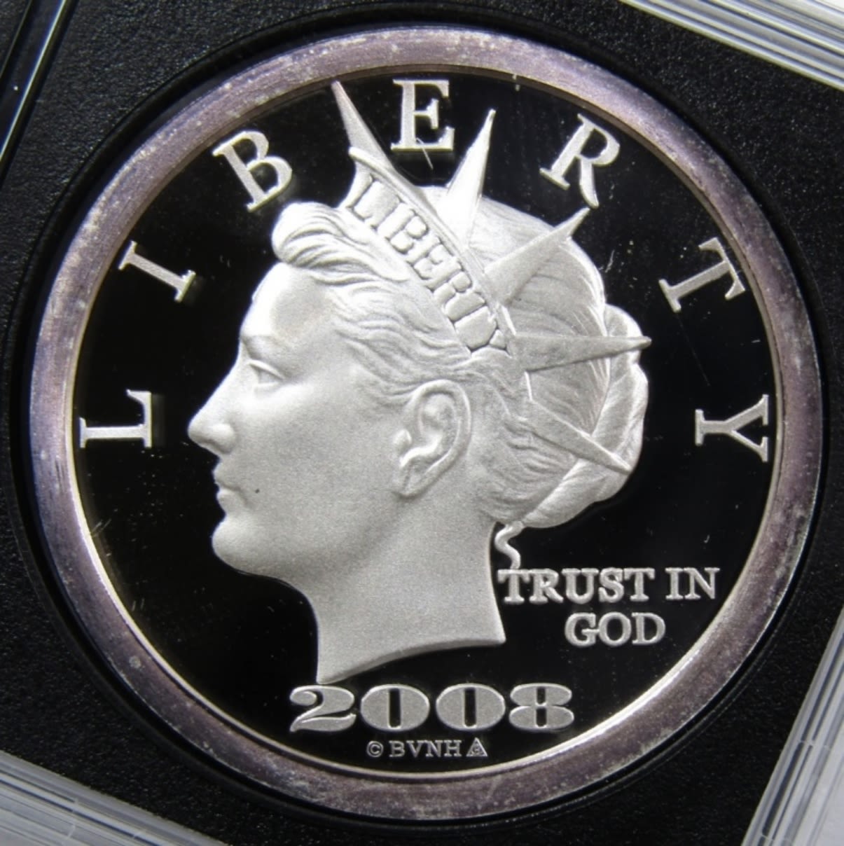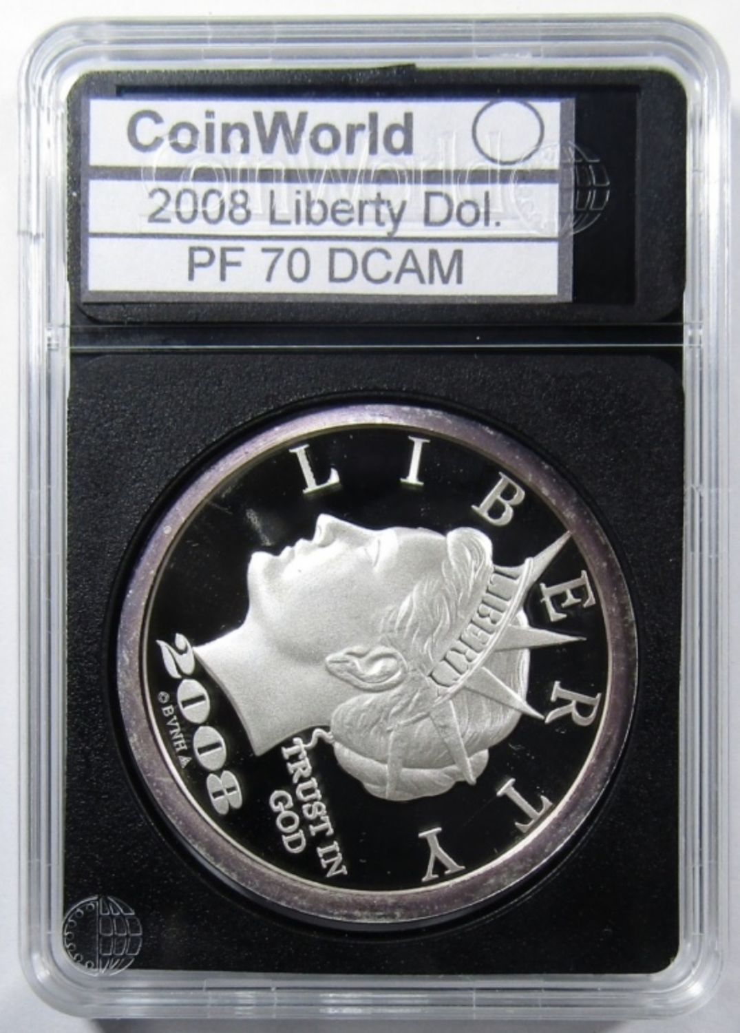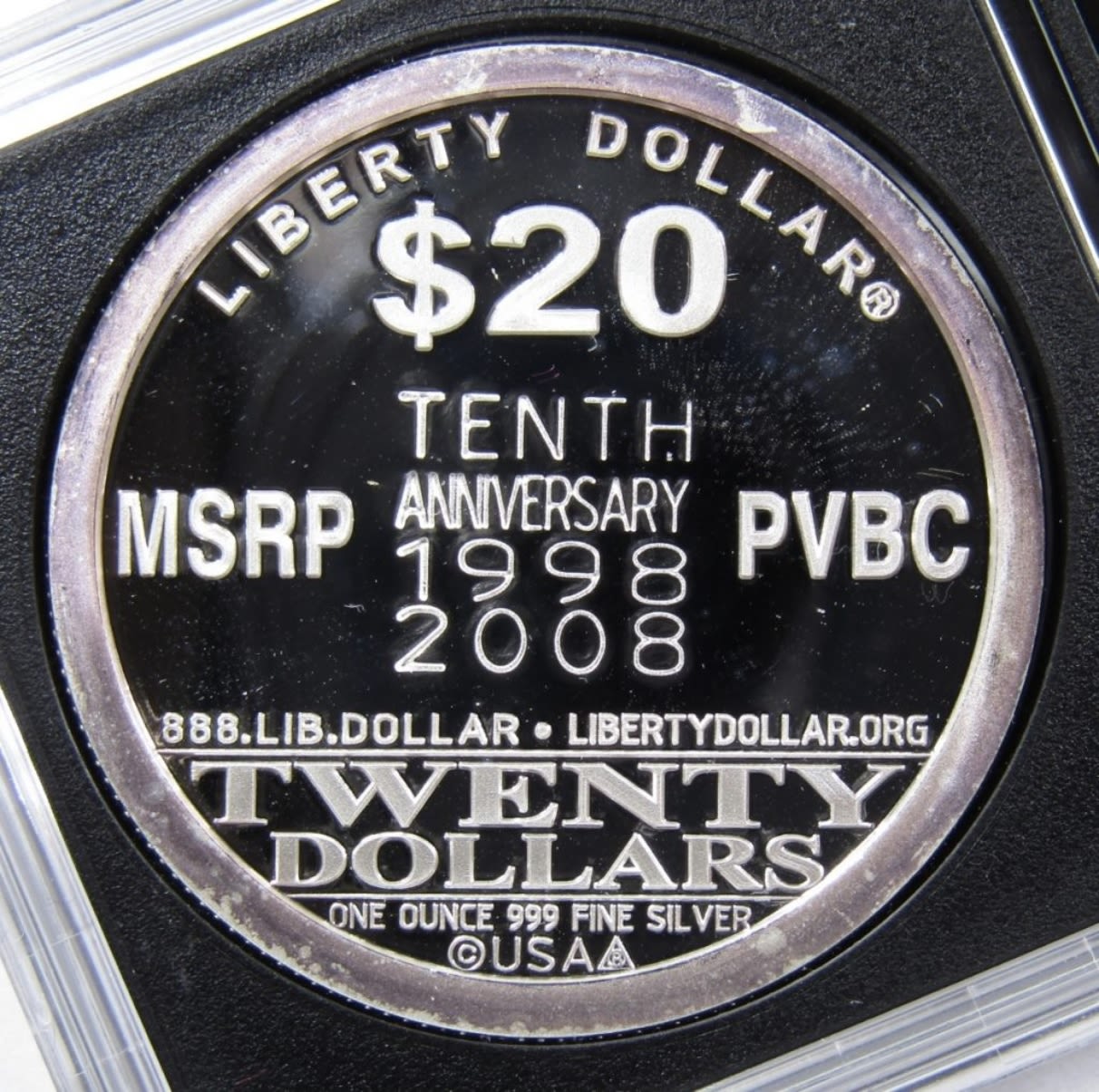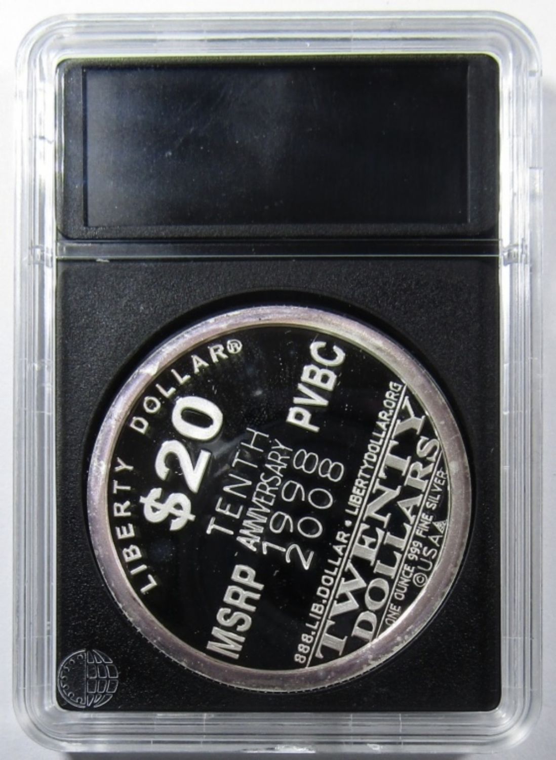 TENTH ANNIVERSARY “$20 LIBERTY DOLLAR” SILVER ROUND IN PLASTIC SLAB.