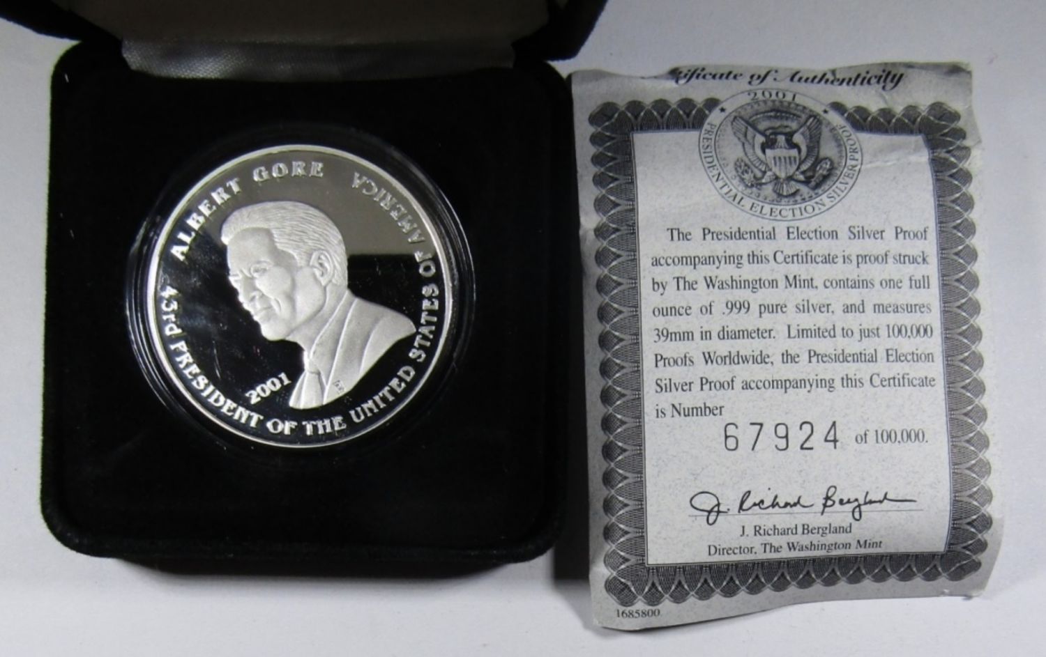 ALBERT GORE & GEORGE W BUSH, 43rd ELECTION PROOF COIN, THE WASHINGTON MINT. WITH VELVET CASE & COA.