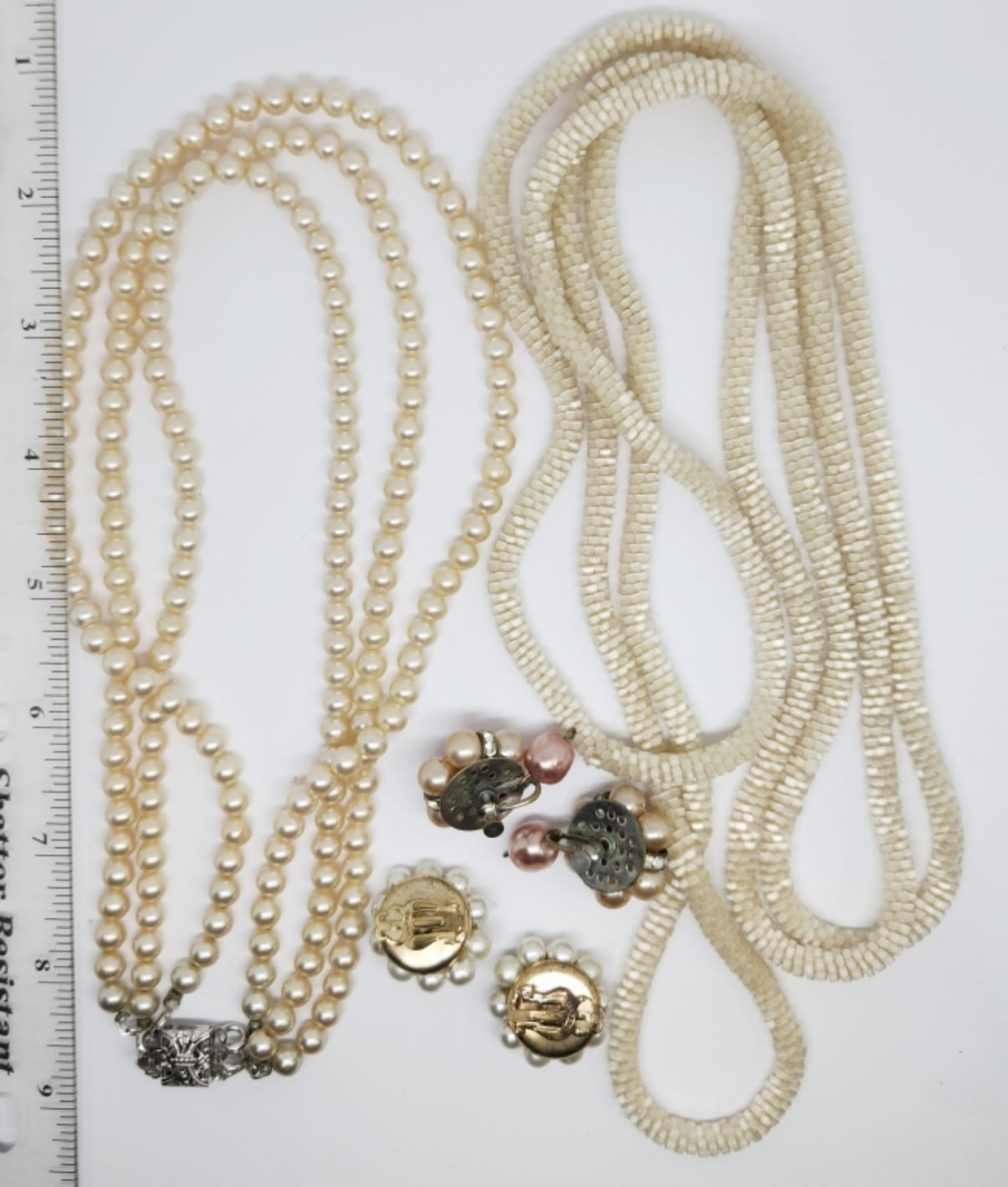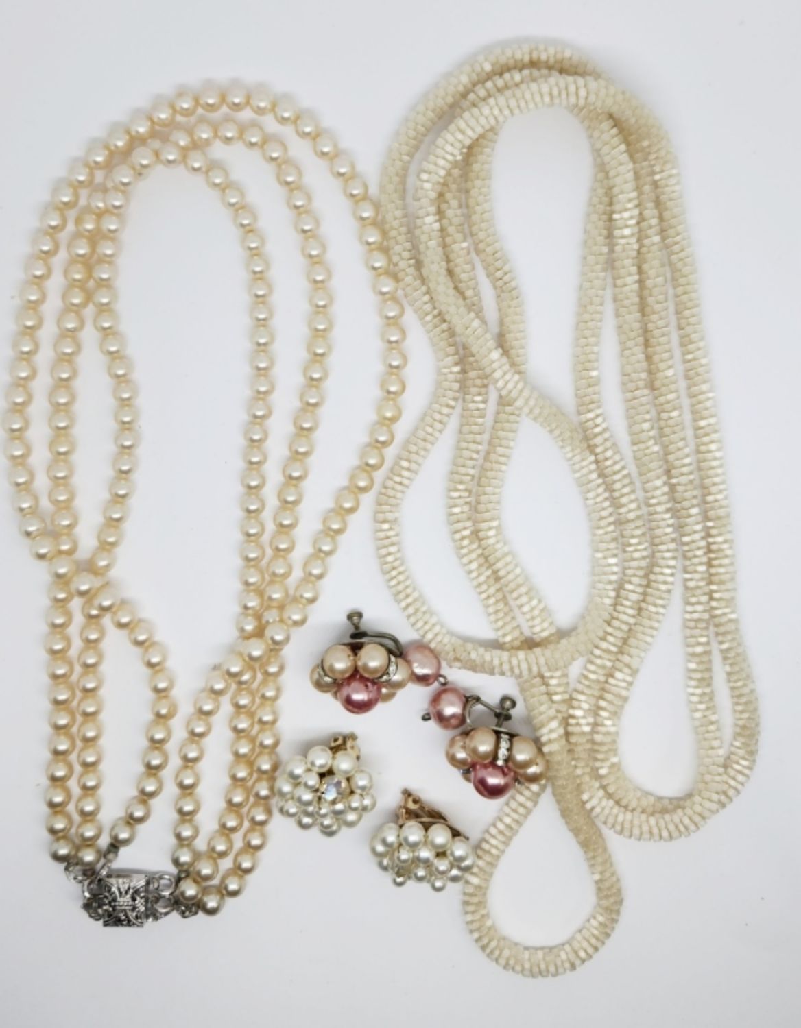 (1)MARKED JAPAN (1)70 INCH ROPE STYLE NECKLACE & (1)16 INCH TRIPLE LAYERED FAUX PEARL NECKLACE