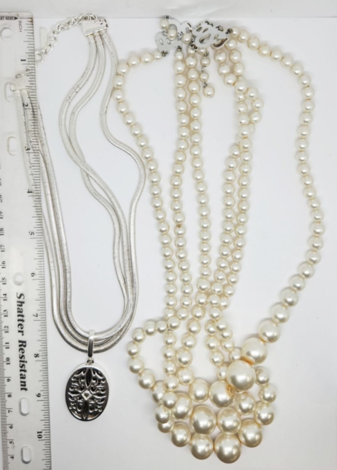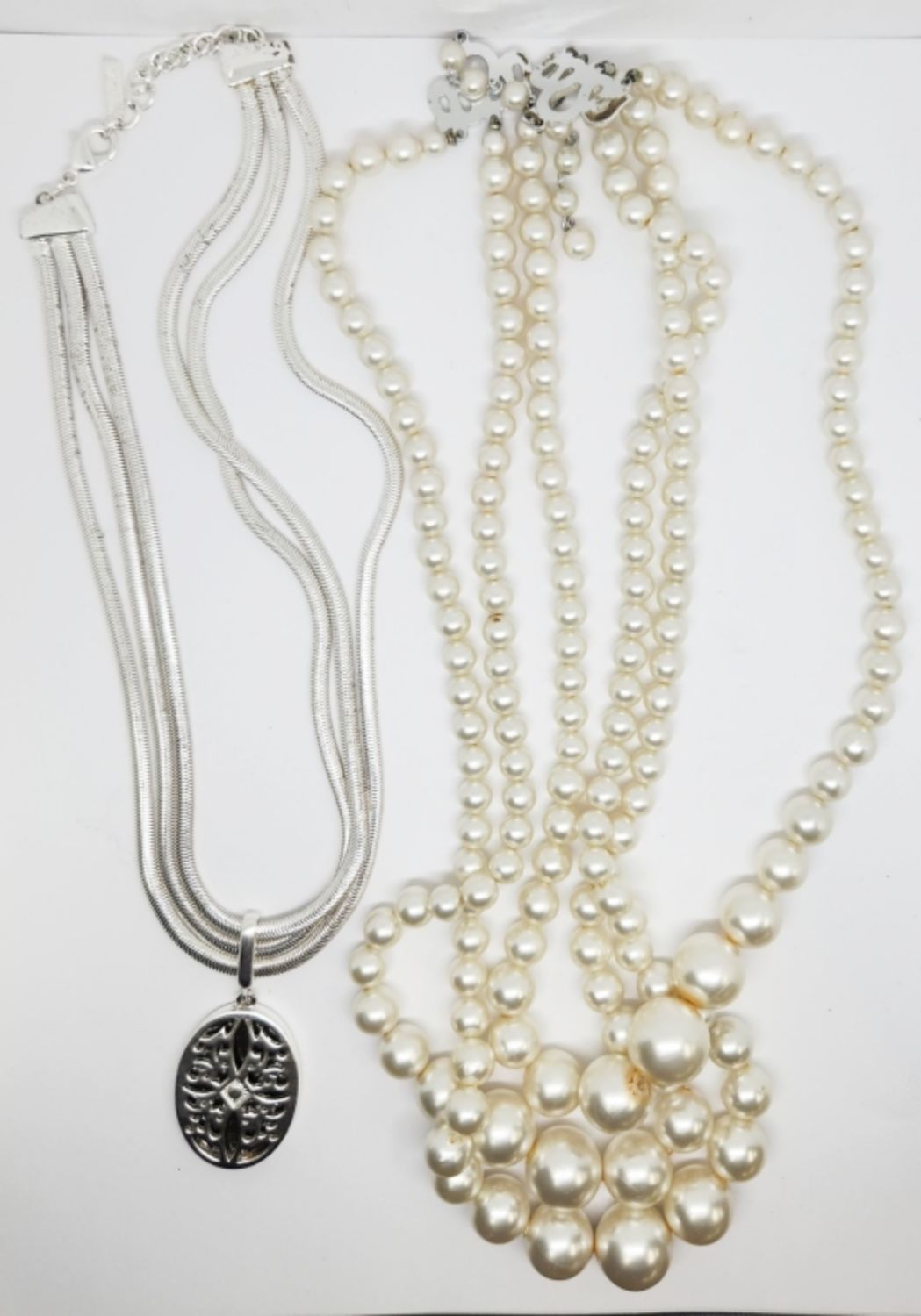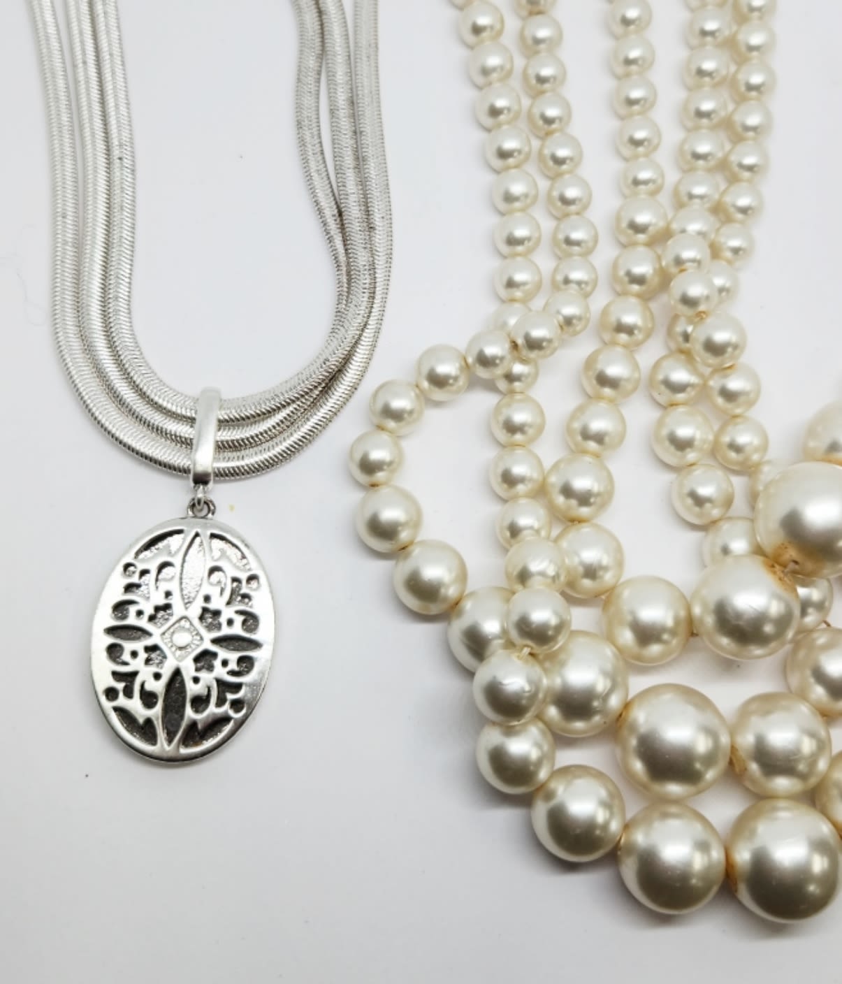 TONED TRIPLE STRANDED NECKLACE WITH PENDANT PLUS (1)25 INCH JAPAN TRIPLE LAYERED CRÈME BEADED NECKLACE