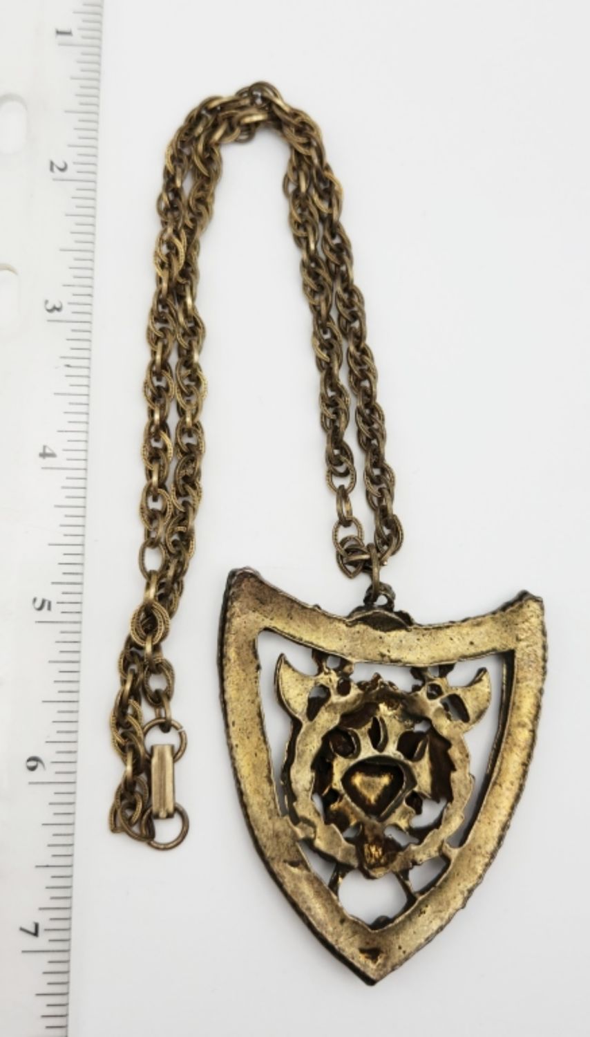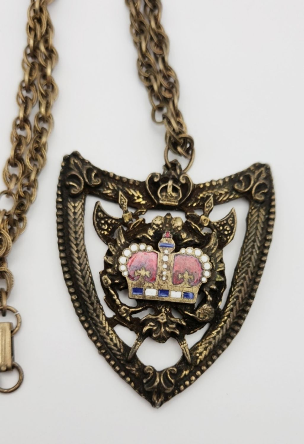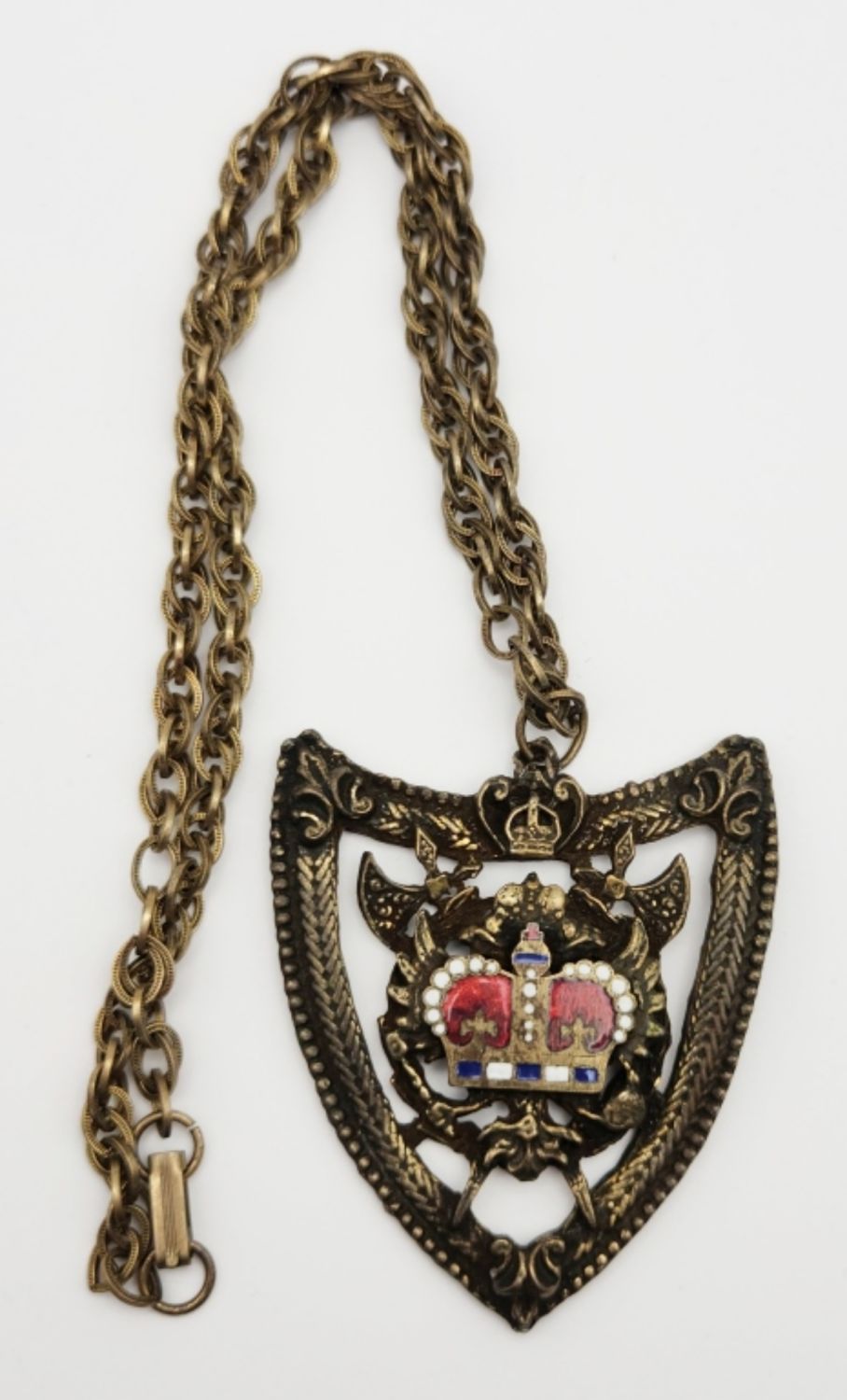 CROWN/AXE PENDANT-CROWN HAS RED,BLUE, AND WHITE ENAMEL-NECKLACE MEASURES 18.5 INCHES