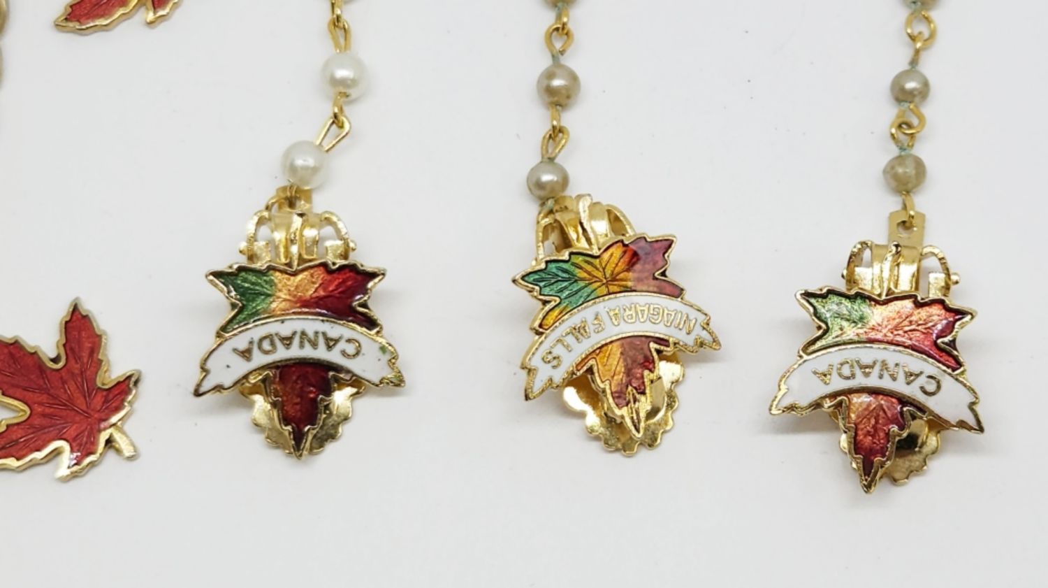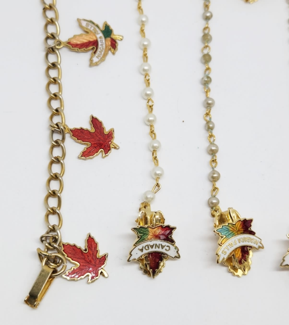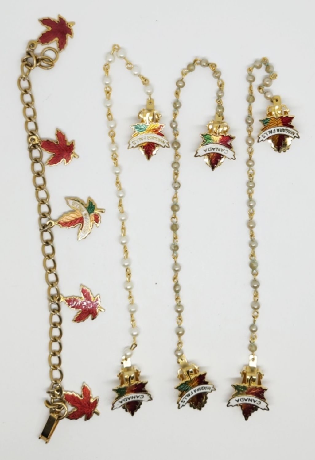 ENAMEL LEAF JEWELRY LOT: (3)COLLAR PINS & (1)CHARM BRACELET