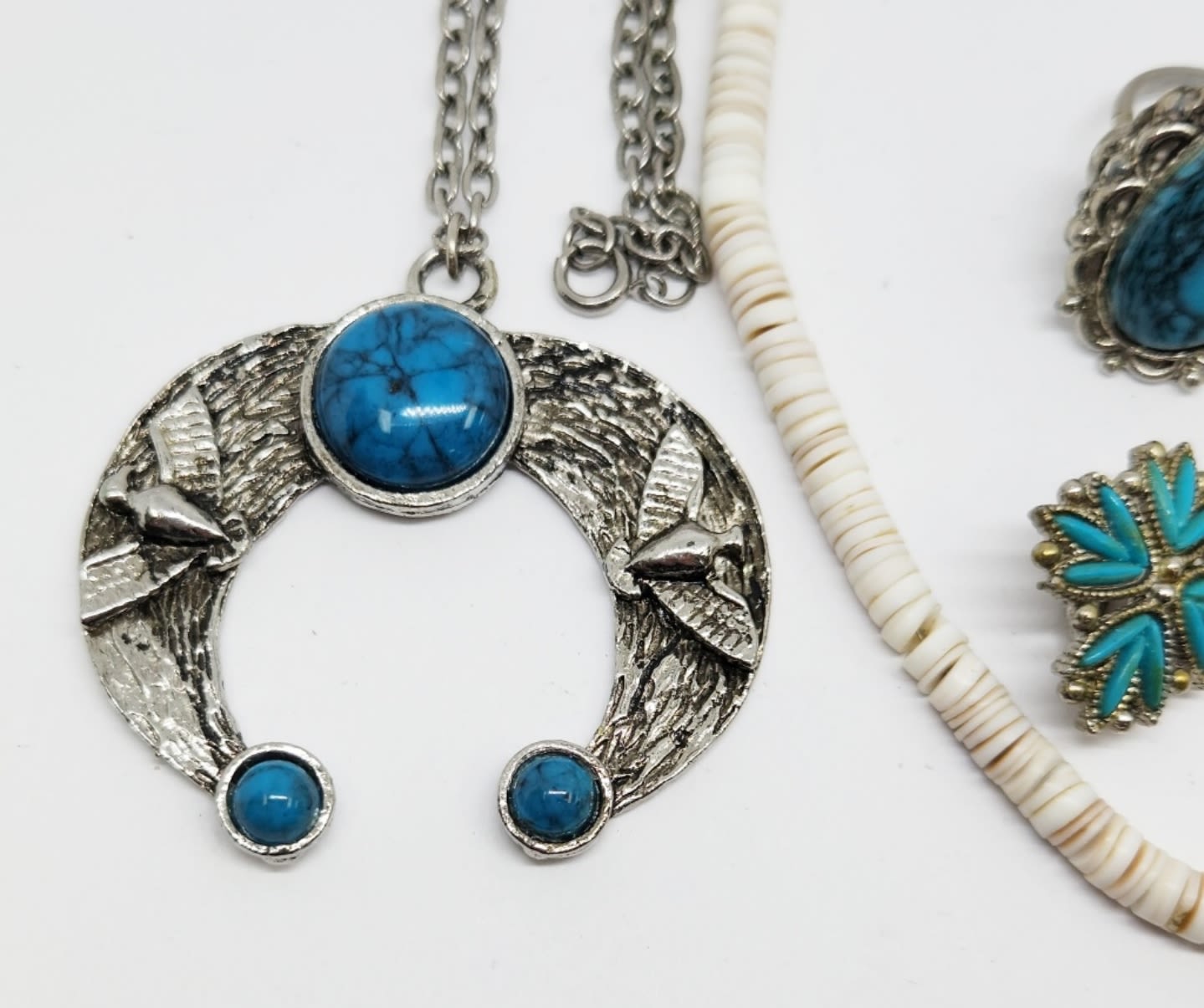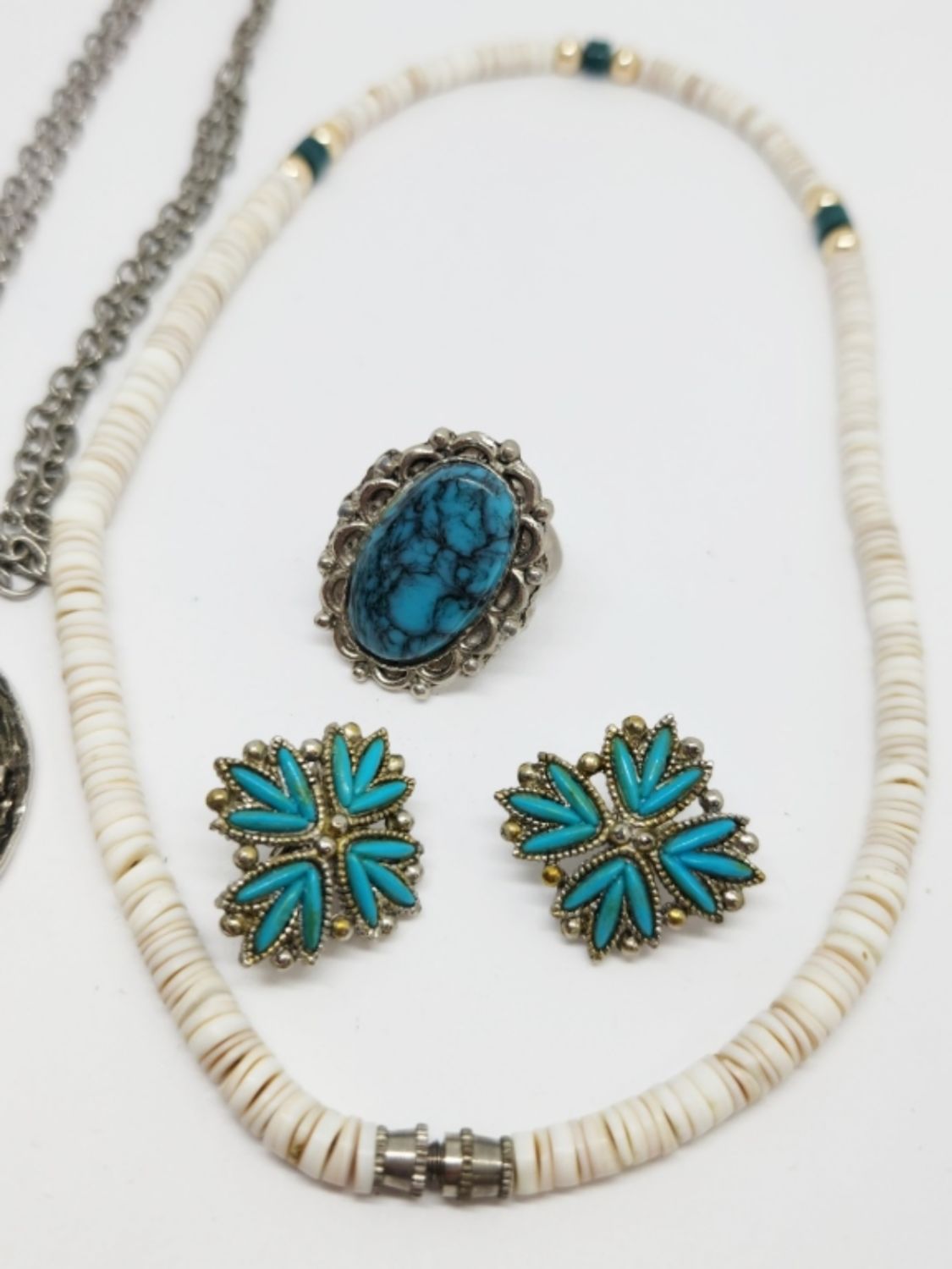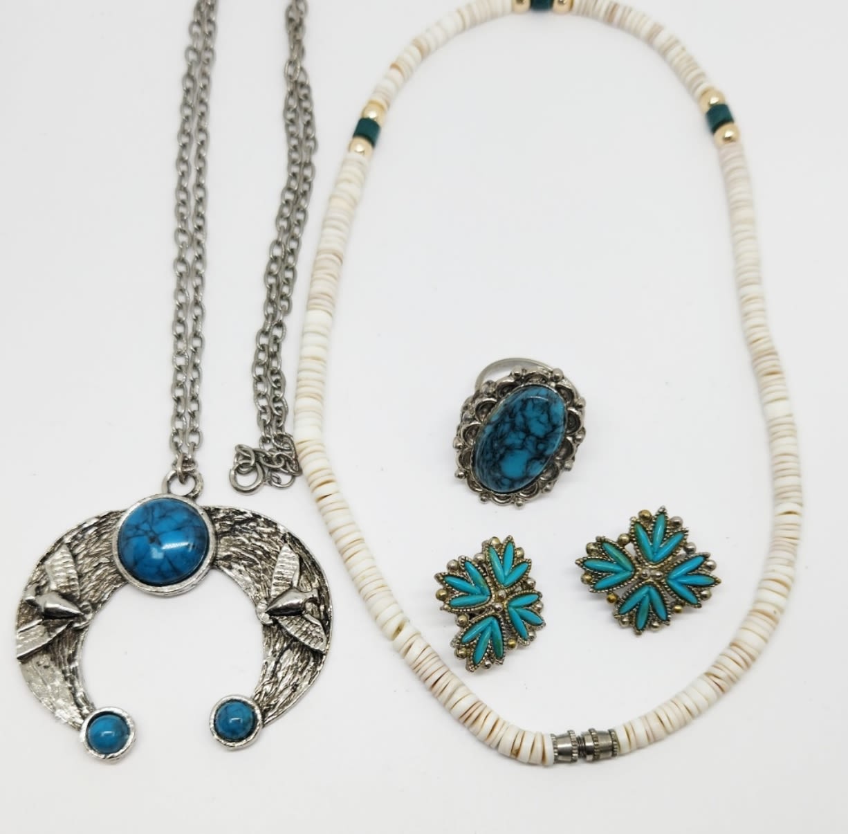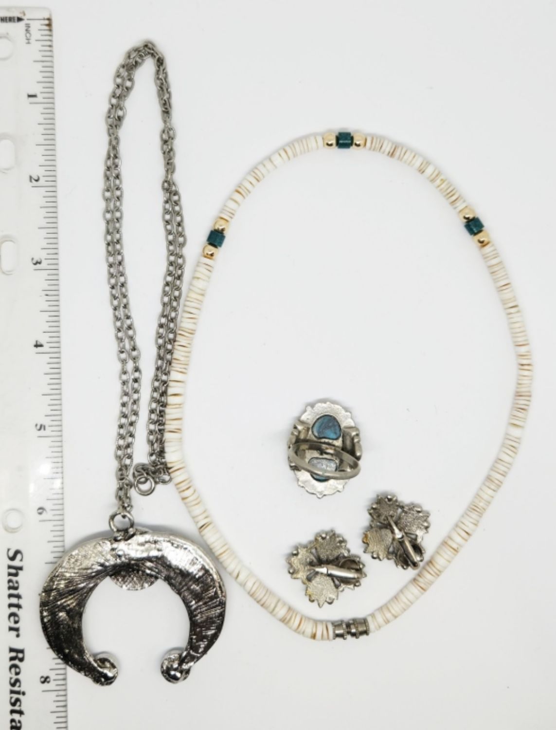 BLOSSOM NECKLACE (1)PUKA SHELL NECKLACE (1)PAIR OF CLIP ON EARRINGS & (1)RING