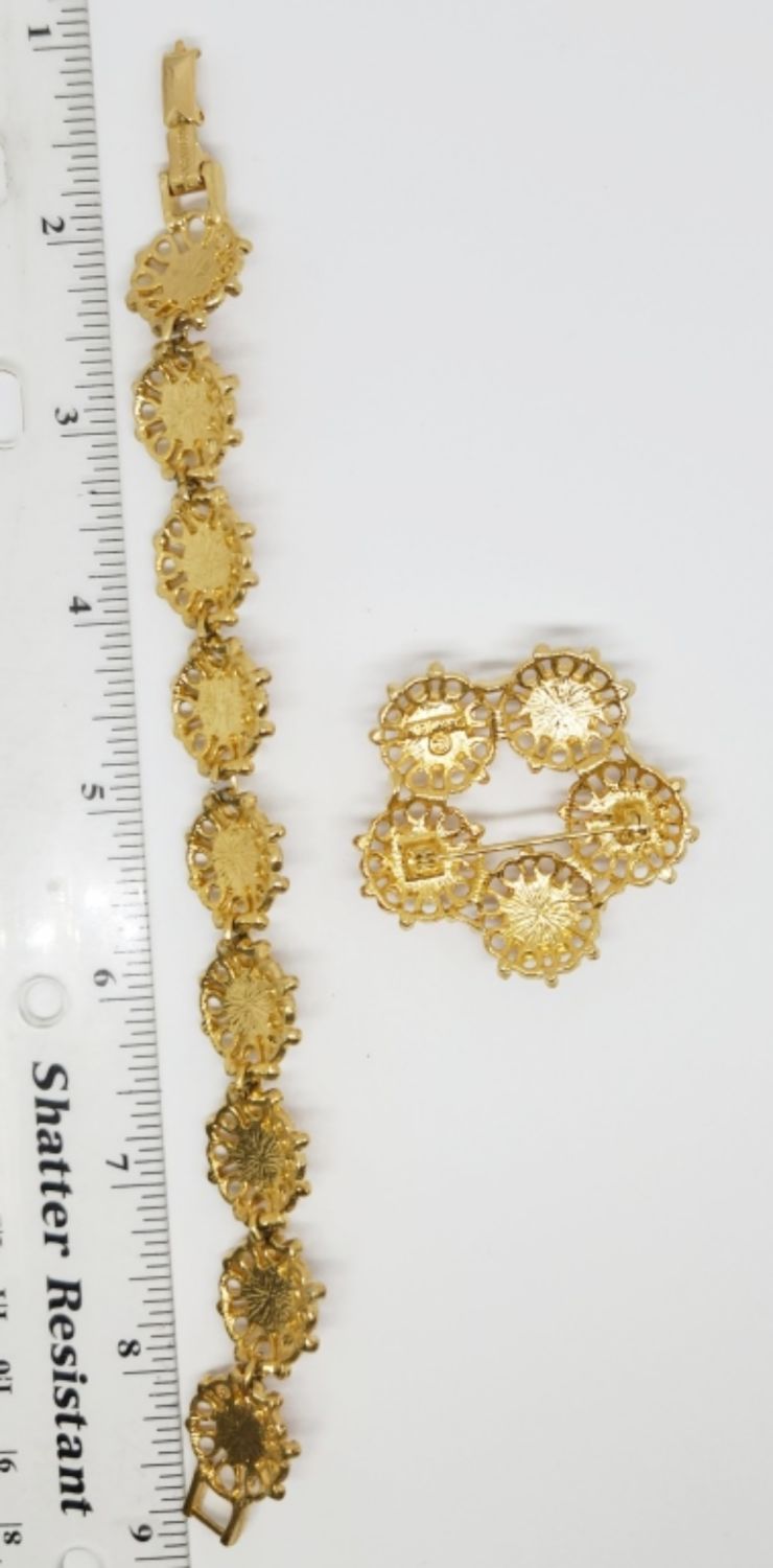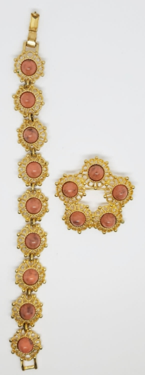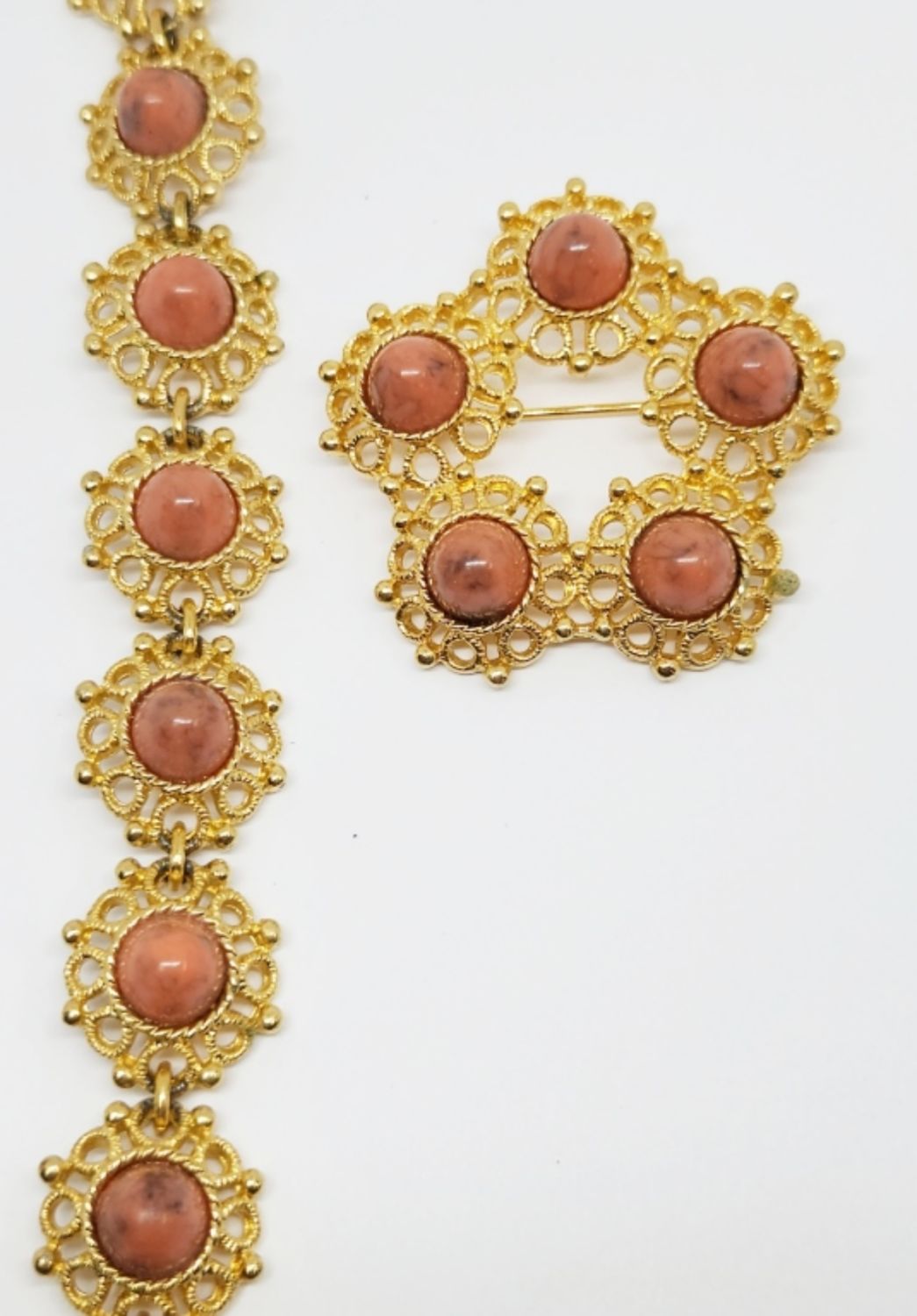 BRACELET WITH PEACH MARBLE LUCITE & MATCHING BROOCH