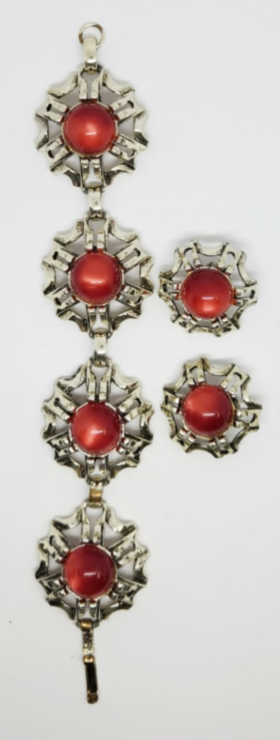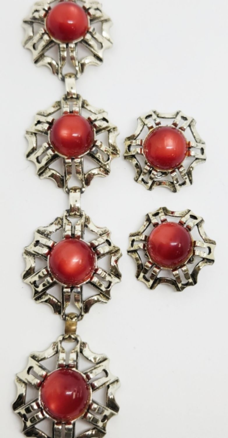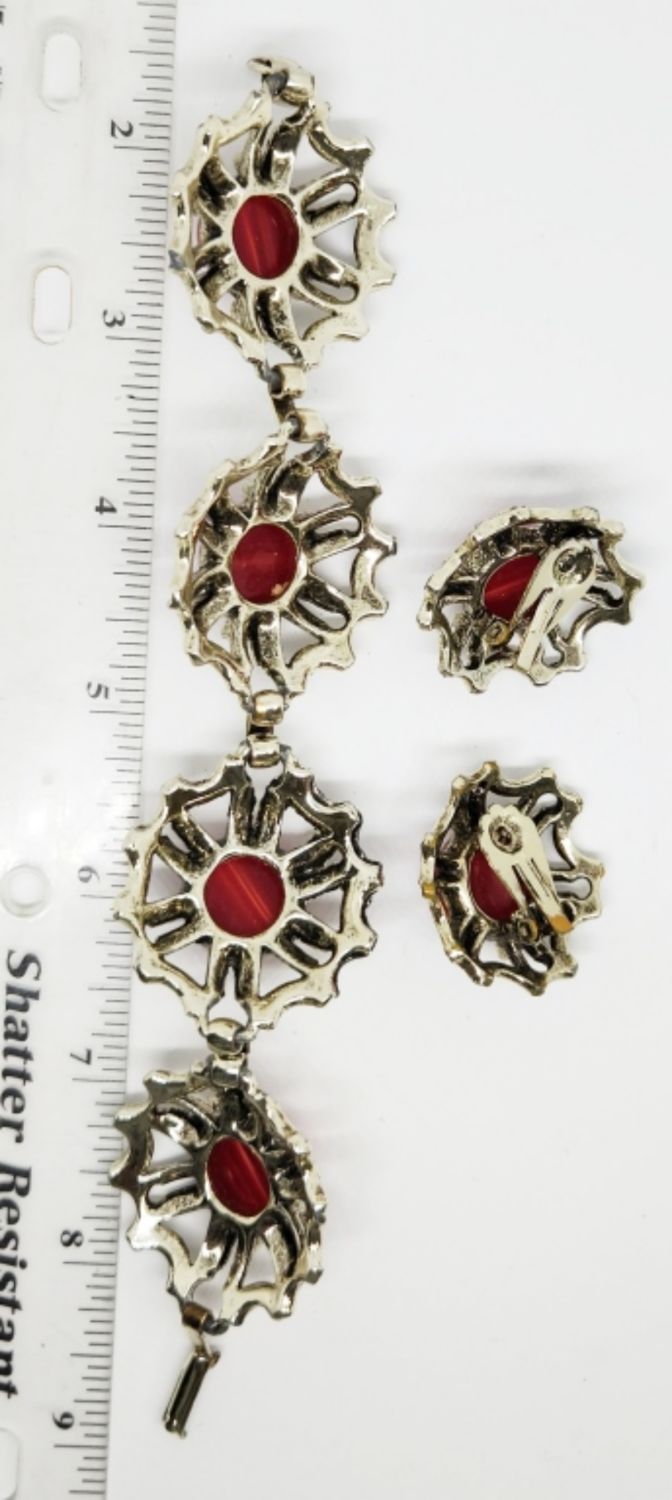 WITH RED LUCITE WITH MATCHING PAIR OF CLIP ON EARRINGS-BRACELET MEASURES 7 INCHES