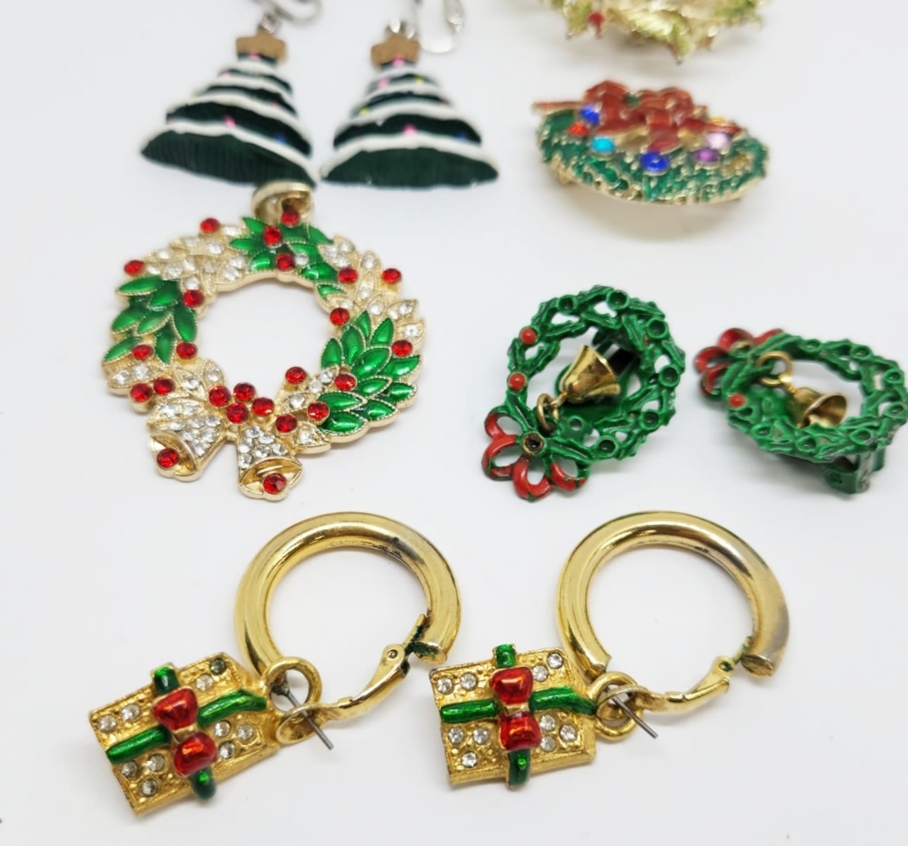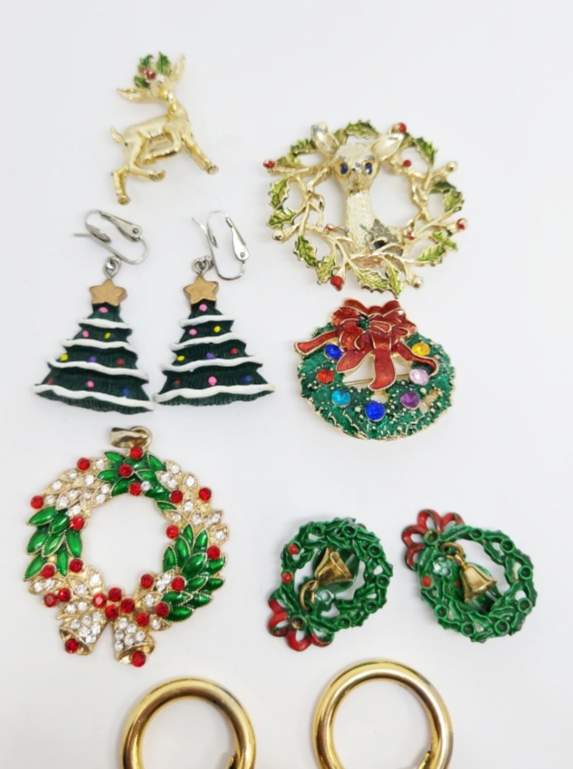 (1)PENDANT & (3)PAIRS OF EARRINGS-TREES-WREATH-REINDEER-ENAMEL-RHINEST ONES