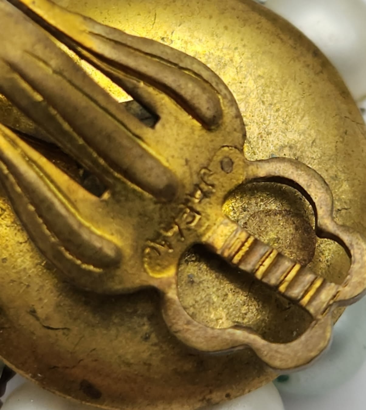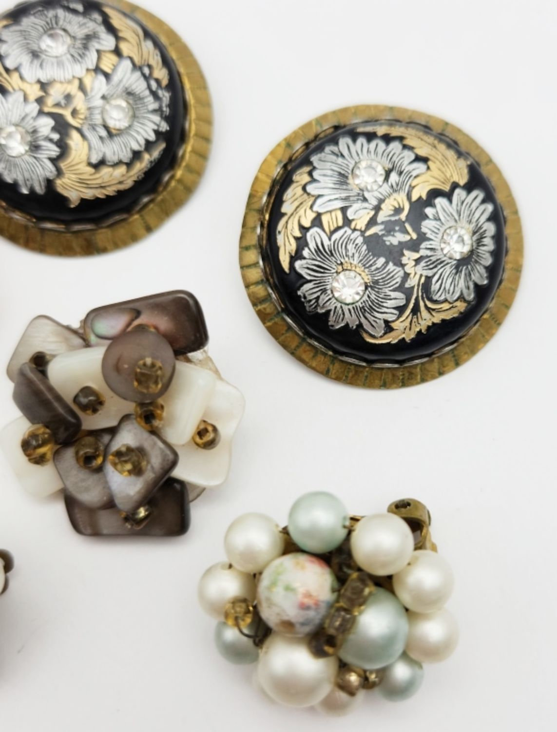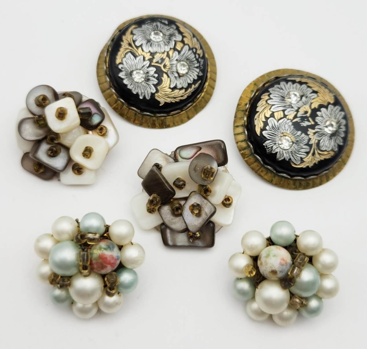 (1)CIRCULAR WITH ENAMEL FLOWER DESIGN WITH RHINESTONES & (2)PAIRS OF JAPAN BEADED