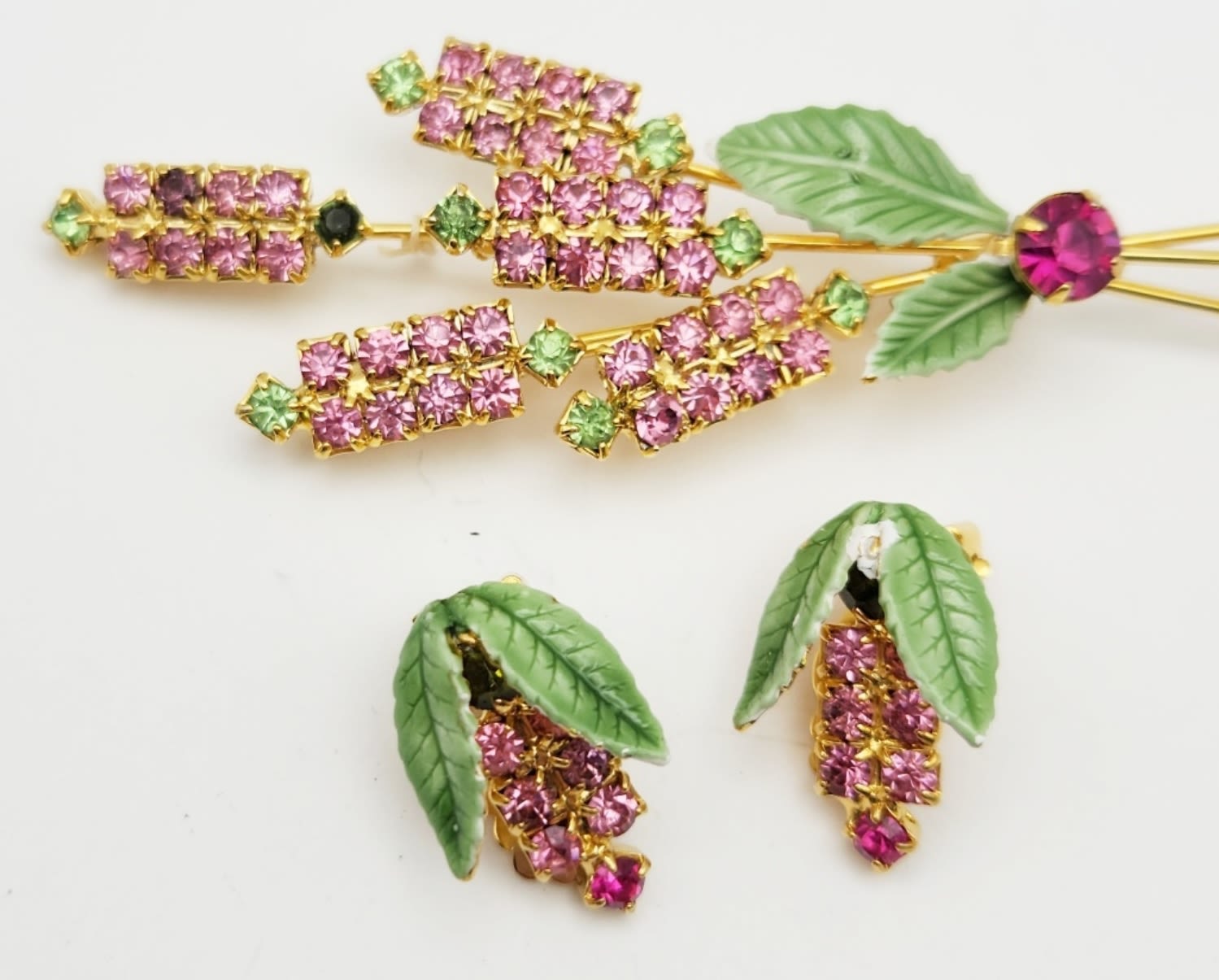 PINK AND GREEN RHINESTONES-GREEN ENAMEL WITH MATCHING PAIR OF CLIP ON EARRINGS