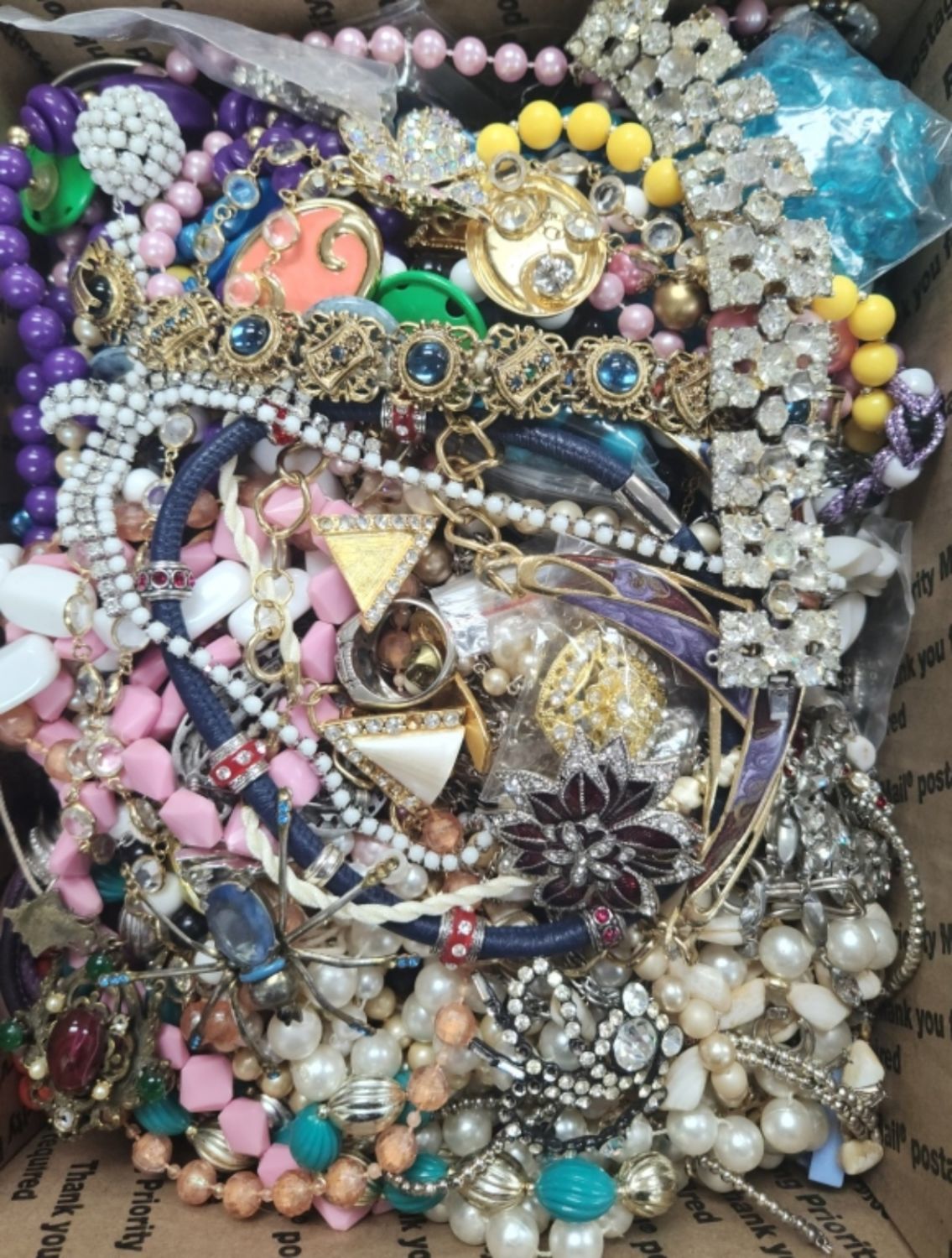EACH LOT is UNIQUE! ABSOLUTELY A TREASURE HUNT – SOME PIECES MISSING STONES or NEEDING REPAIRED – GREAT FOR THE PINTEREST / CRAFT PERSON. MANY ITEMS NAMED – MEDIUM FLAT RATE BOX FULL (Shipping is MED. FLAT RATE COST)