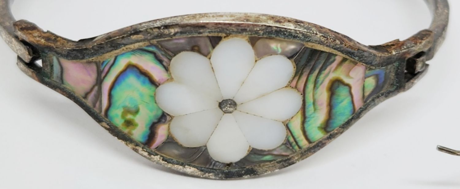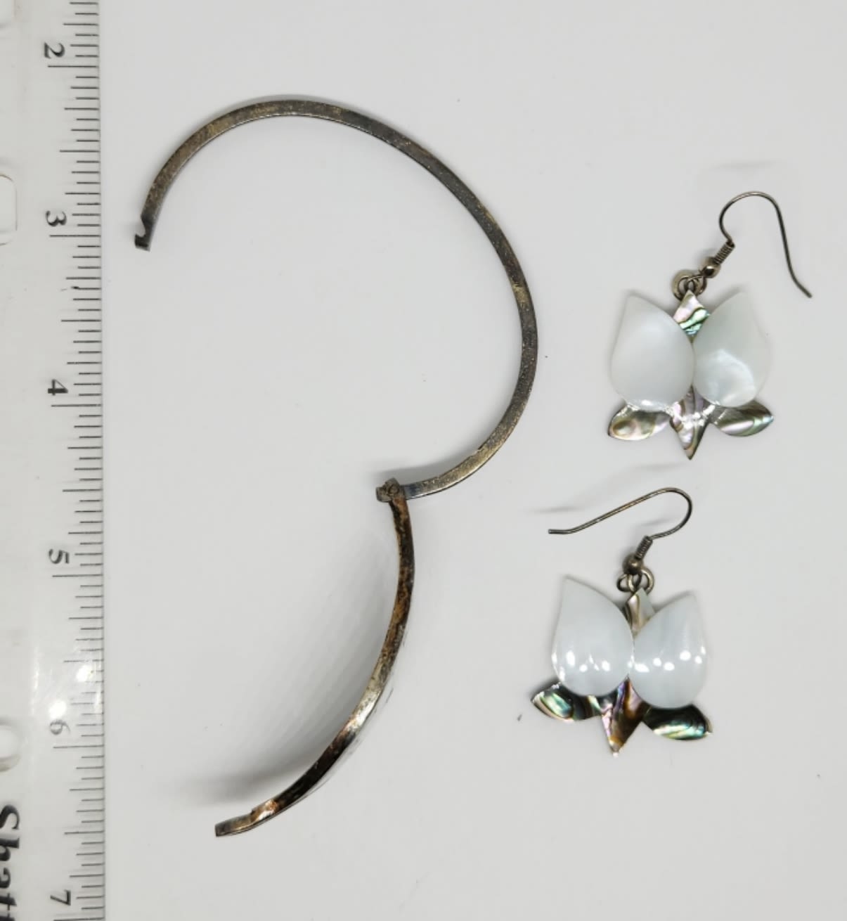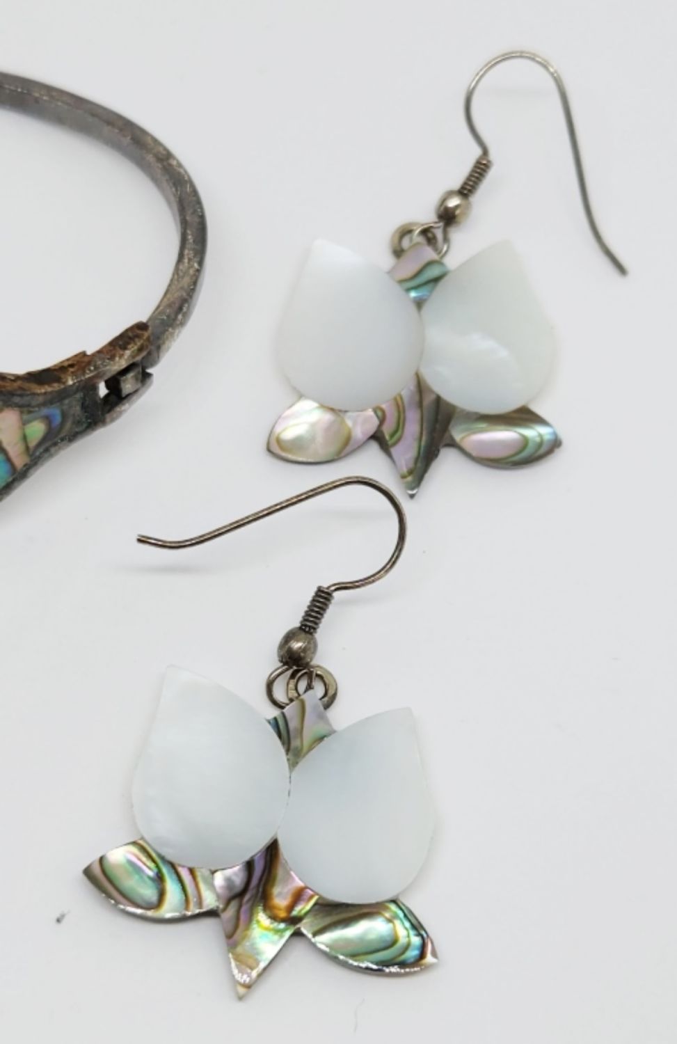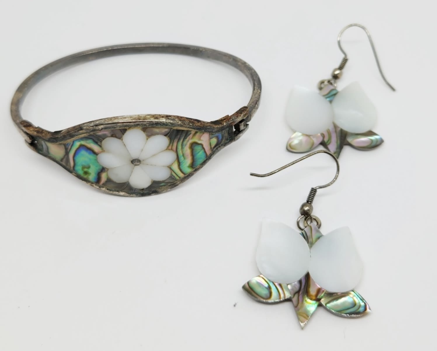WITH ABILONE AND MOTHER OF PEARL INLAY FLOWER DESIGN & (1)PAIR OF PIERCED DANGLY EARRINGS WITH MOTHER OF PEARL AND ABILONE INLAY FLOWER DESIGN-COULD BE WORN AS A SET!
