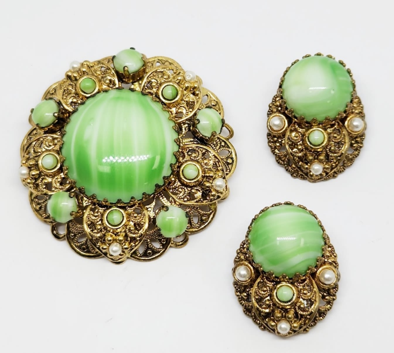 BROOCH WITH LIME GREEN MARBLE LUCITE AND FAUX PEARL ACCENTS PLUS MATCHING PAIR OF CLIP ON EARRINGS