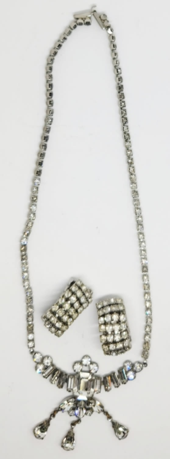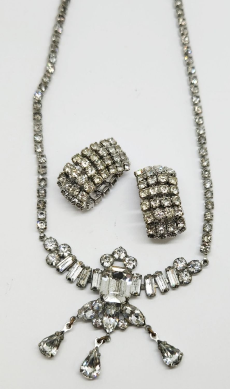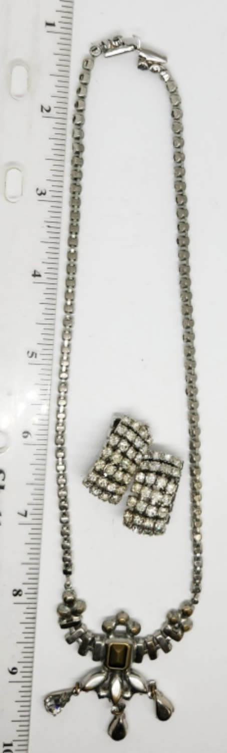 WITH BONUS PAIR OF PAT PEND CLIP ON HOOP RHINESTONE EARRINGS-NECKLACE MEASURES 17 INCHES