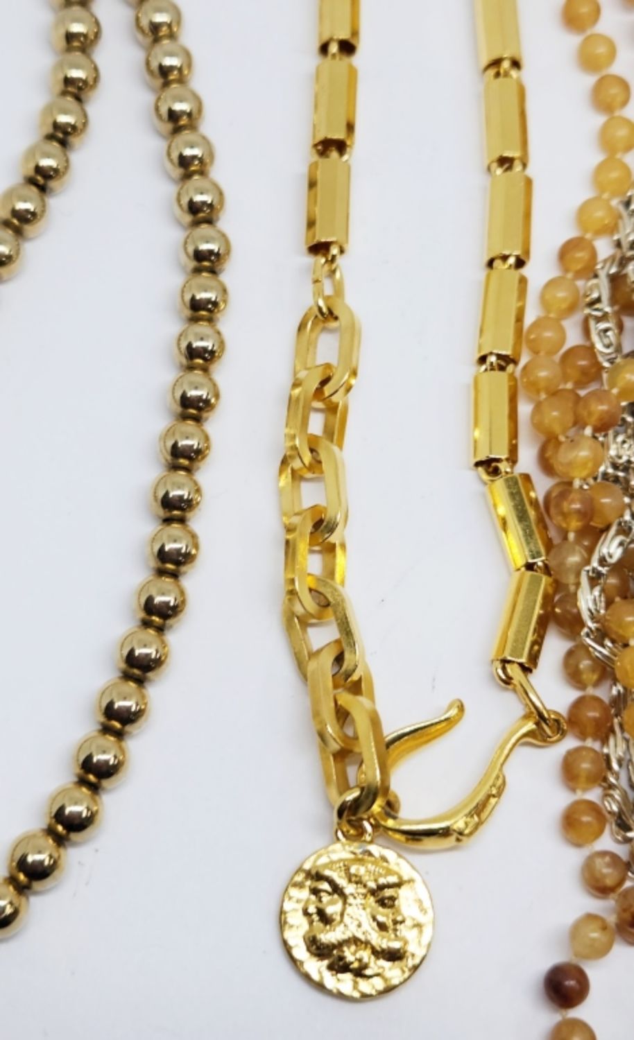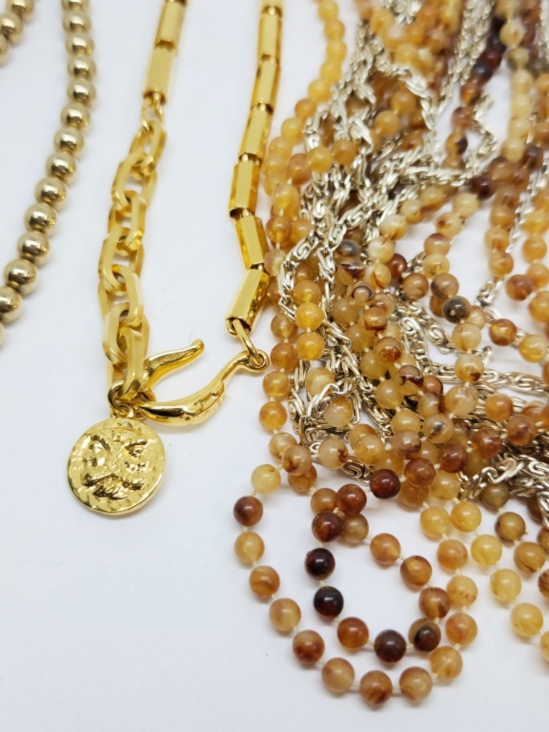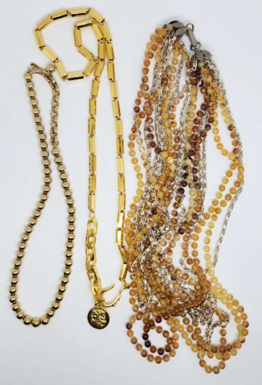 LINKED WITH CHARM 22 INCHES (1)MULTI STRANDED WITH AMBER/BROWN BEADS 20 INCHES & (1)GOLD TONED BEADED 15 INCHES