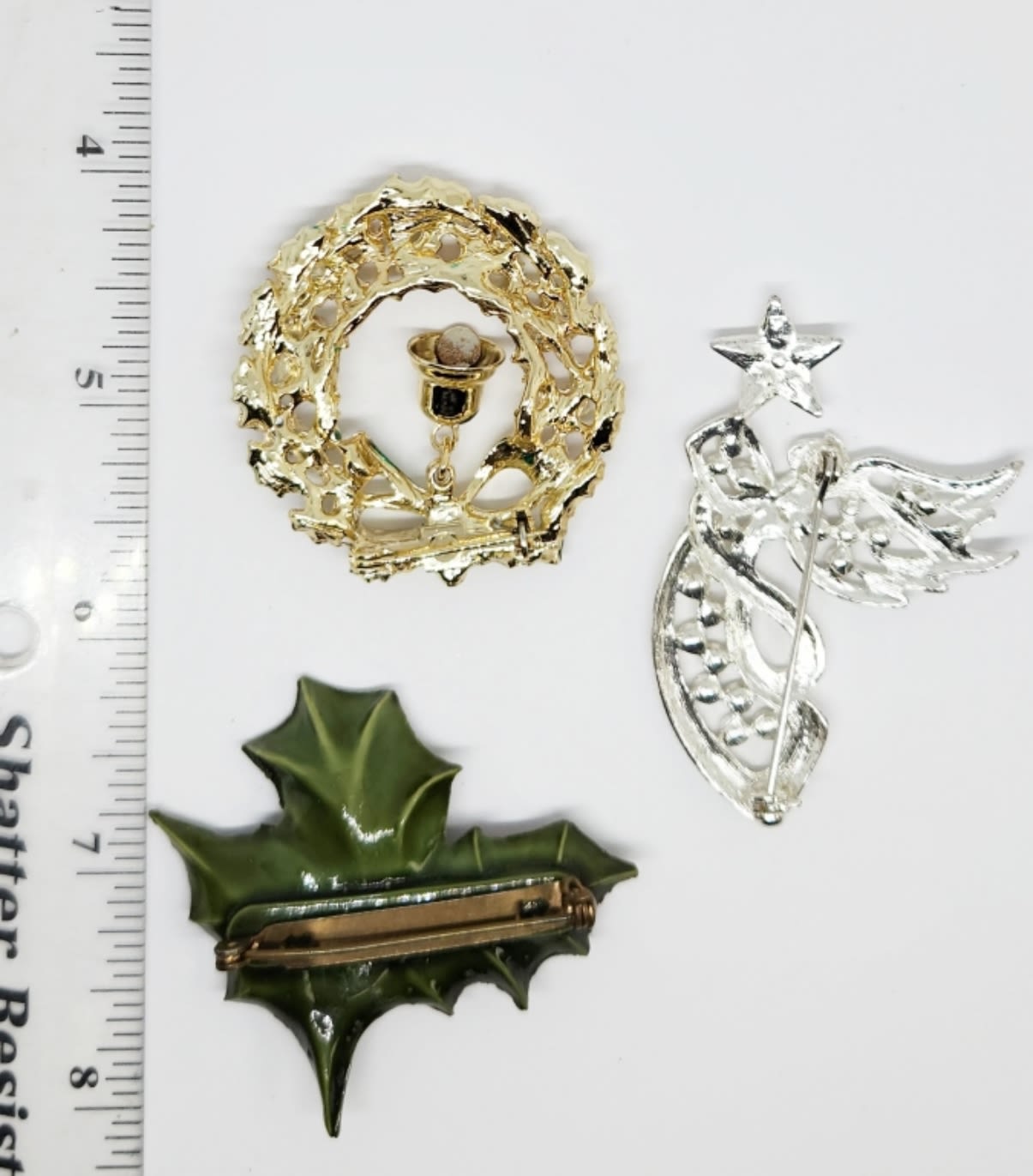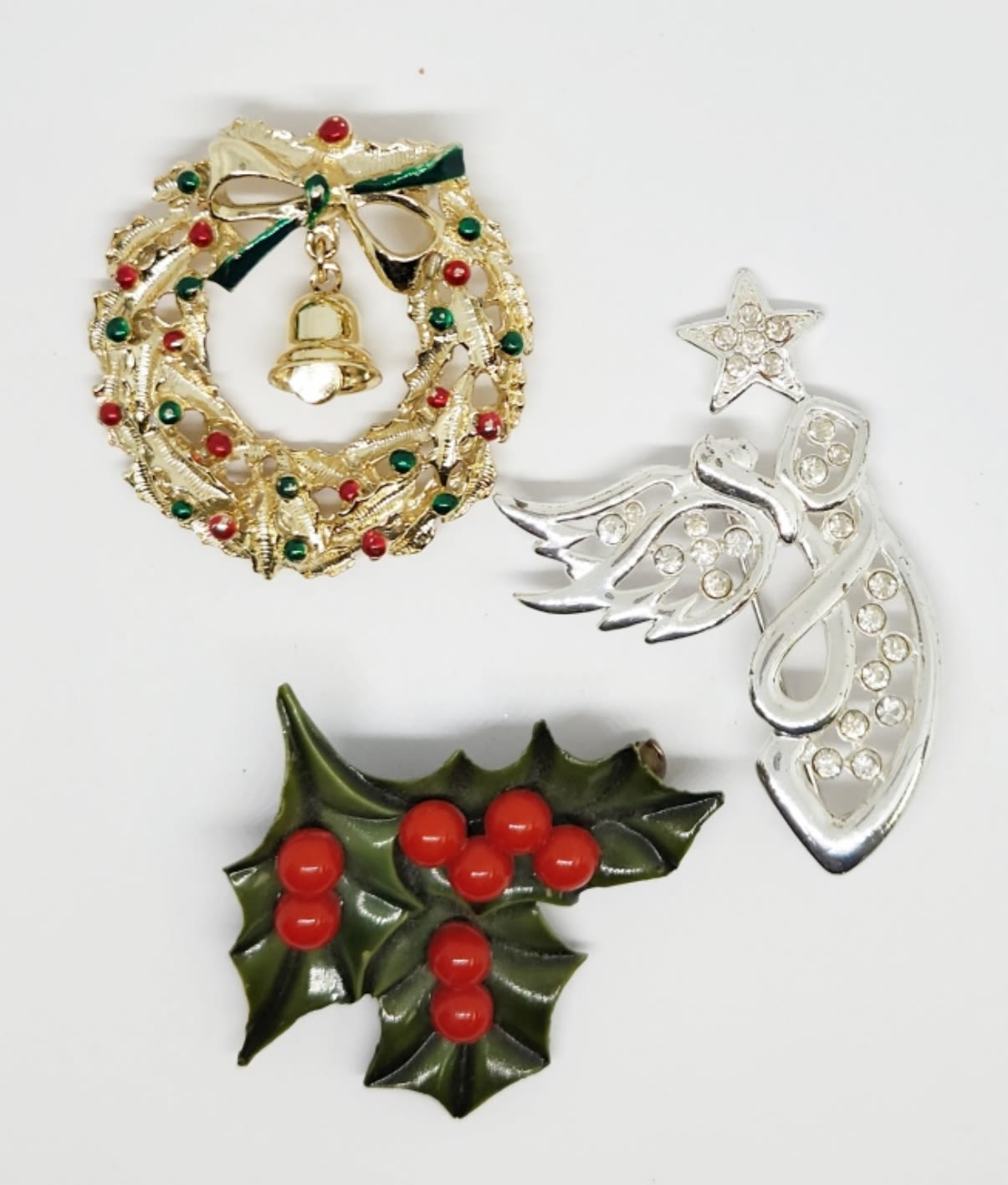 (1)ANGEL WITH RHINESTONES (1)GOLD TONED WREATH WITH BELL CHARM GREEN AND RED ENAMEL & (1)LUCITE POINSETTA
