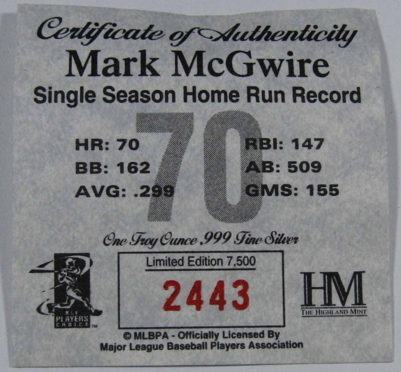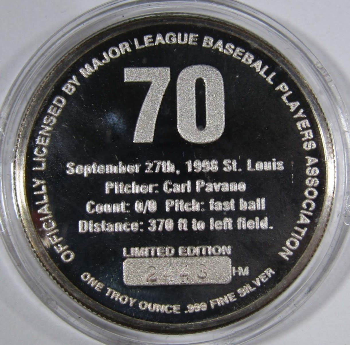 SINGLE SEASON HOME RUN RECORD, THE HIGHLAND MINT, IN VELVET BOX WITH COA.