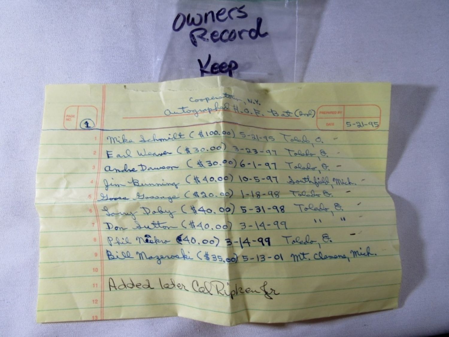 includes MIKE SCHMIDT, EARL WEAVER, ANDRE DAWSON, JIM BUNNING, GOOSE GOSSAGE, LARRY DOBY, DON SUTTON, PHIL NIEKRO, BILL MAZEROSKI, CAL RIPKEN JR – NO COA (has owners record of Dates & Cost of signings)