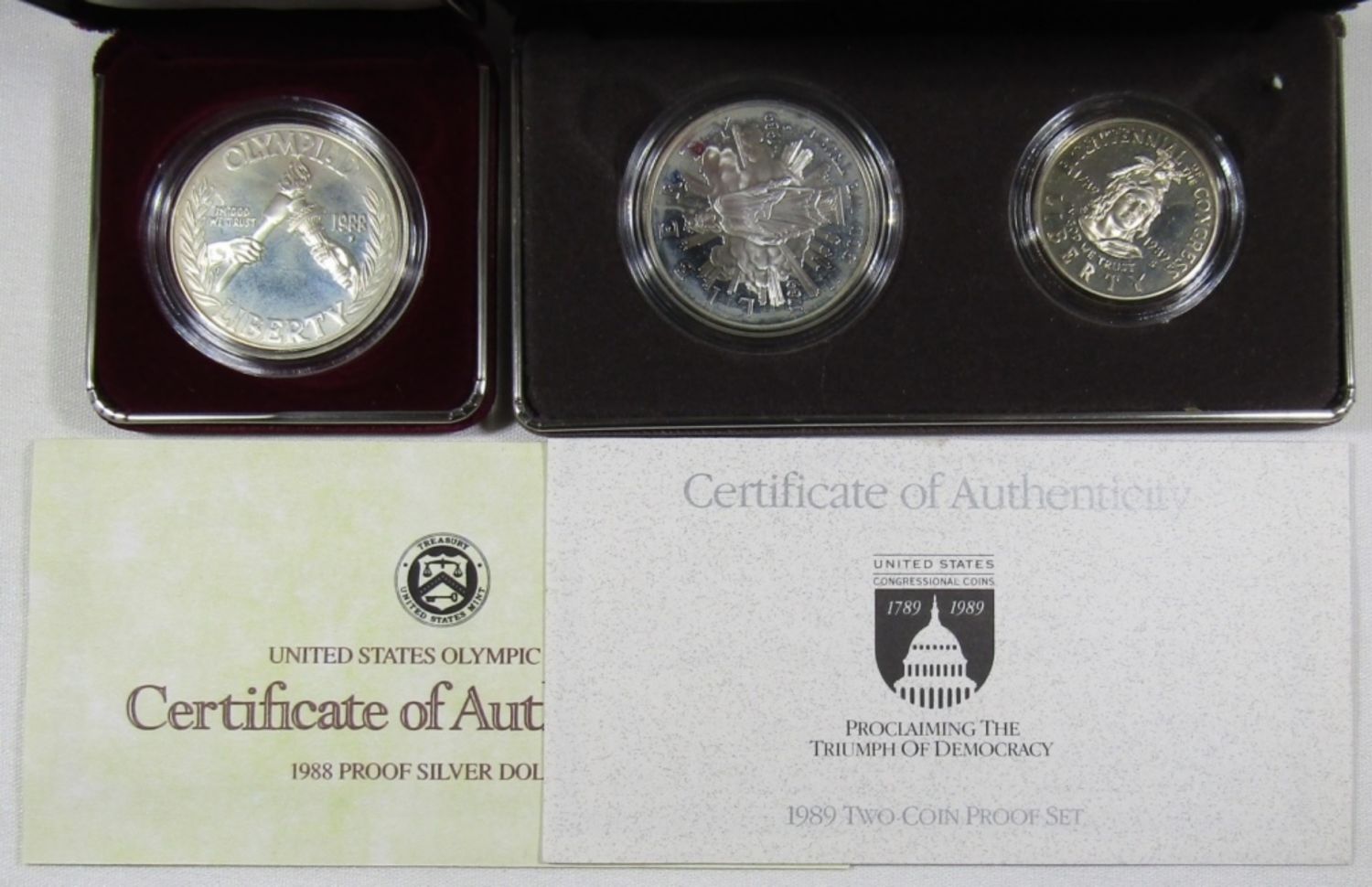 1988 U.S OLYMPIC PROOF $1 COIN AND TWO 1989 PROOF CONGRESSIONAL COINS $1 & .50c