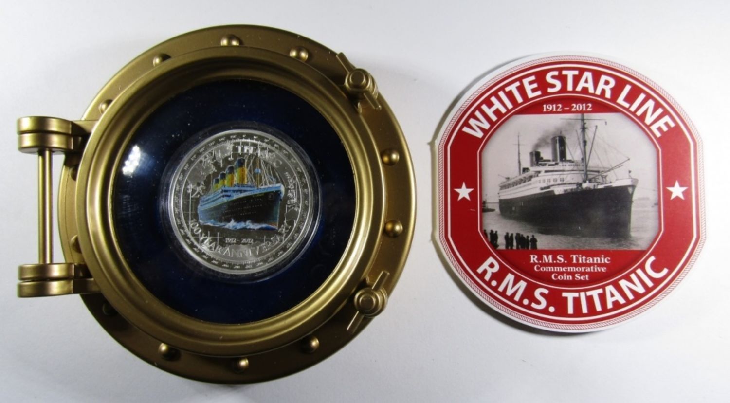 NIUE 1oz SILVER COLORIZED R.M.S. TITANIC 100 YEAR ANNIVERSARY COMMEMORATIVE COIN SET, IN OGP WITH BOX, DISPLAY CASE, AND COA.
