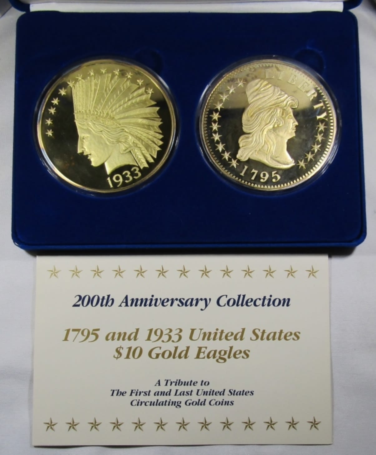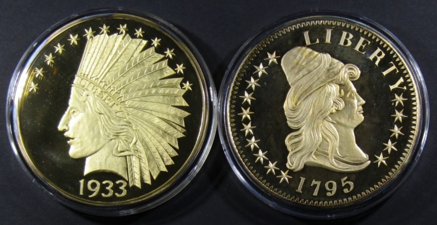 TWO 16 TROY OZ SILVER ROUNDS LAYERED IN 24K GOLD, 200TH ANNIVERSARY COLLECTION 1795 AND 1933 US $10 GOLD EAGLE REPLICAS, IN CASE WITH COA.