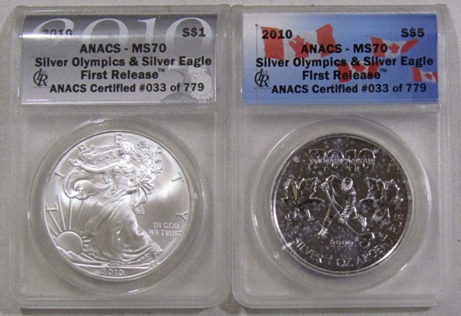 SET OF TWO 1oz SILVER COINS ANACS MS-70 FIRST RELEASES, SILVER OLYMPICS & SILVER EAGLE. IN DISPLAY CASE