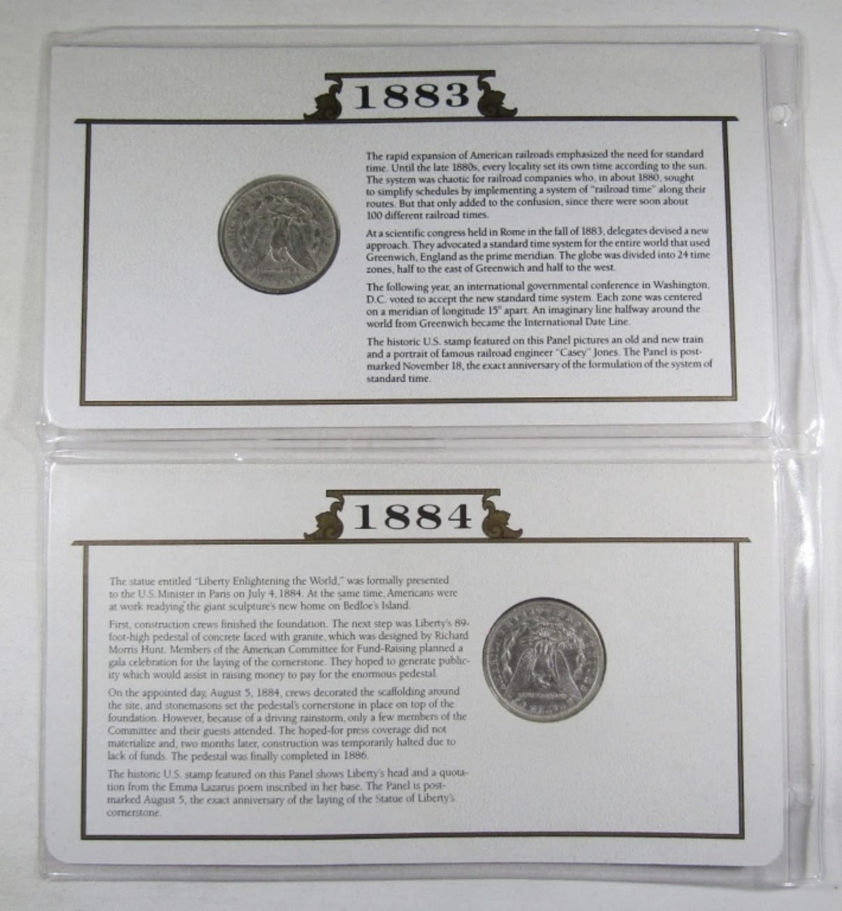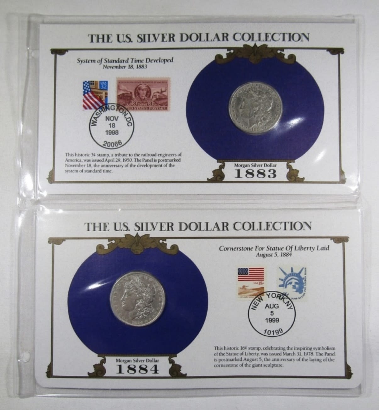 SILVER DOLLARS COMBINED WITH HISTORIC STAMPS AND POST MARKS. FROM POSTAL COMMEMORATIVE SOCIETY THE US SILVER DOLLAR COLLECTION.