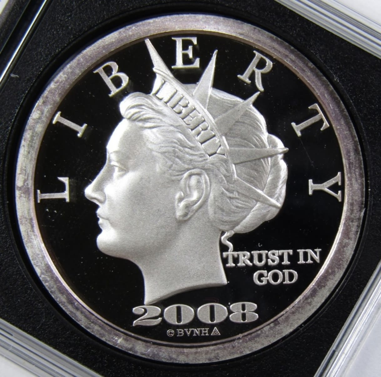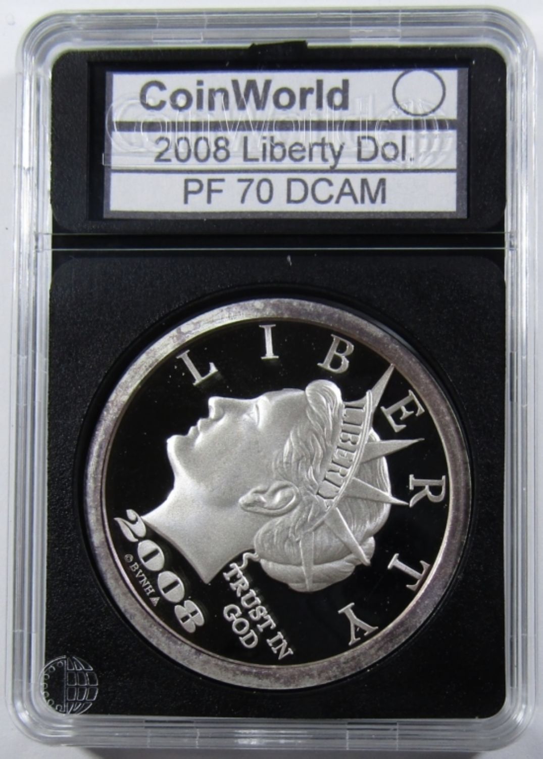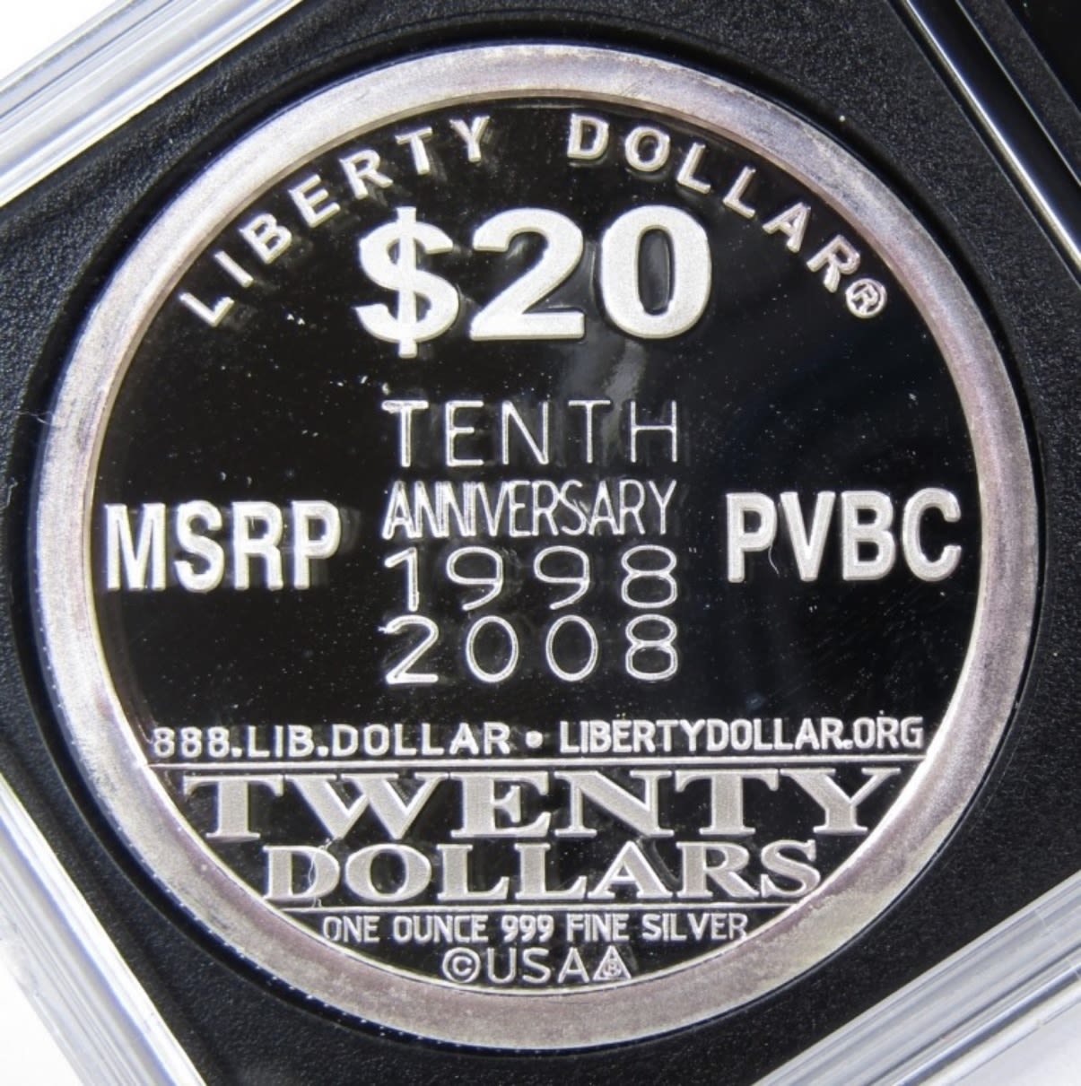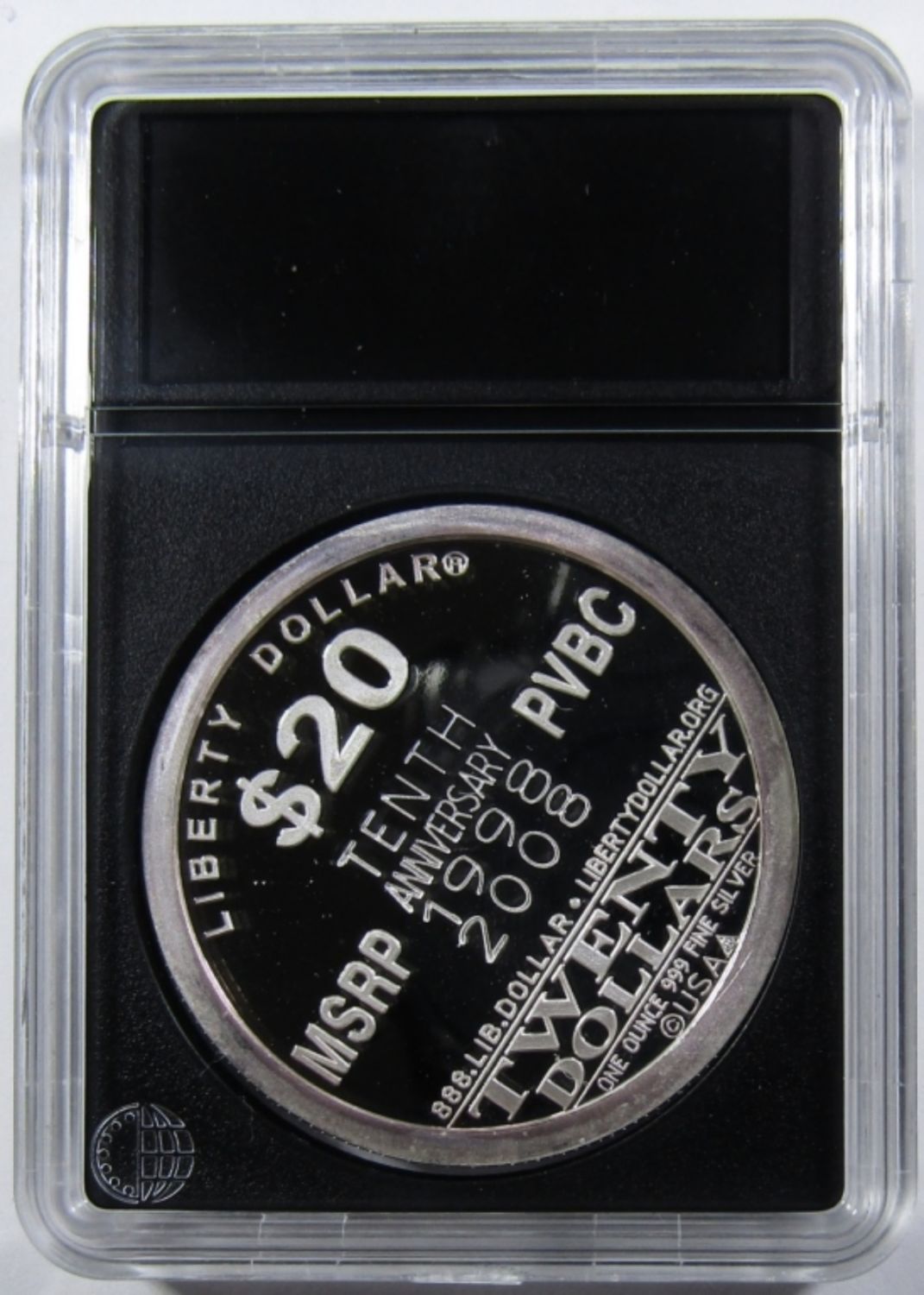 TENTH ANNIVERSARY “$20 LIBERTY DOLLAR” SILVER ROUND IN PLASTIC SLAB.