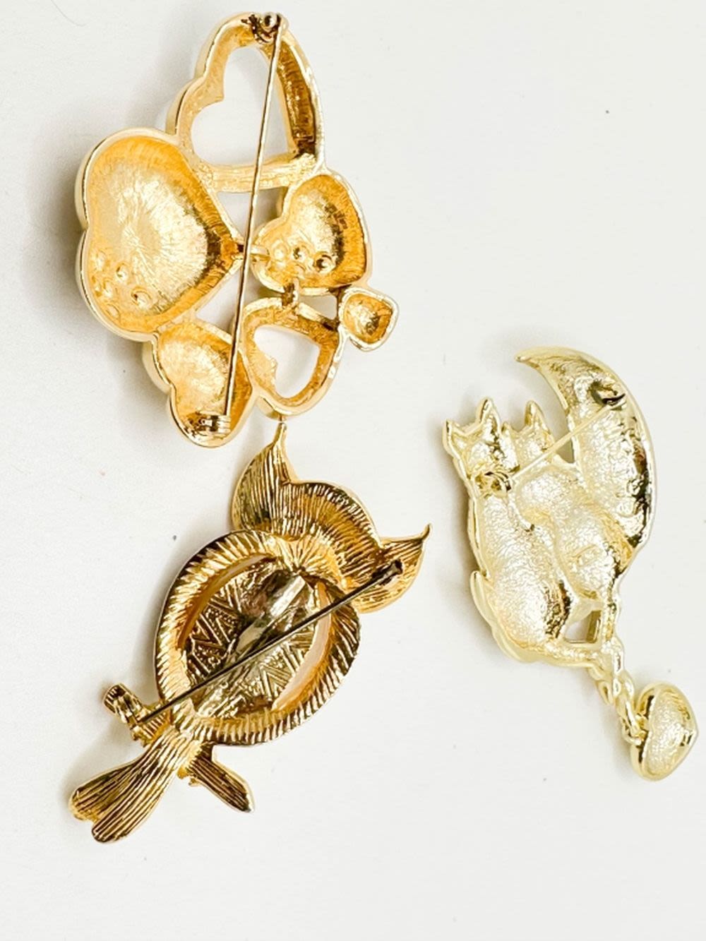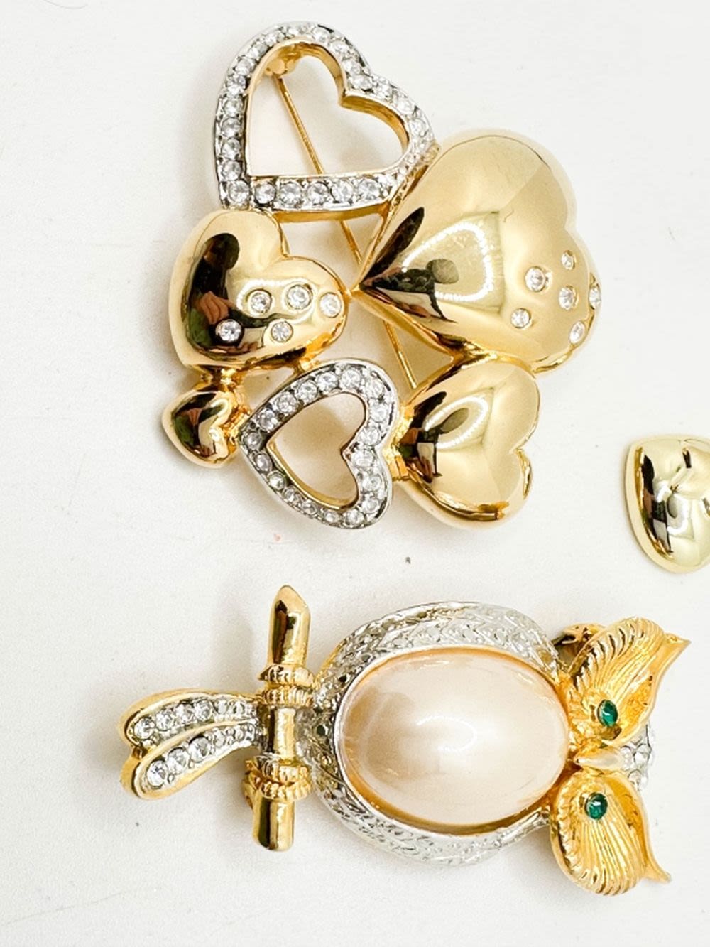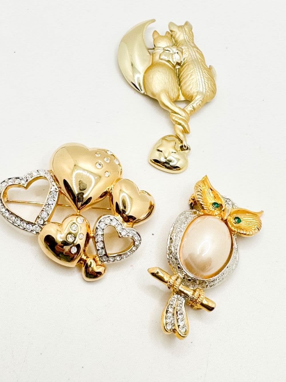 OWL WITH GREEN STONE EYES AND CLEAR STONES, HEARTS ASSORTMENT WITH STONES AND CATS WITH DANGLE BROOCHES ALL IN GOLD TONE