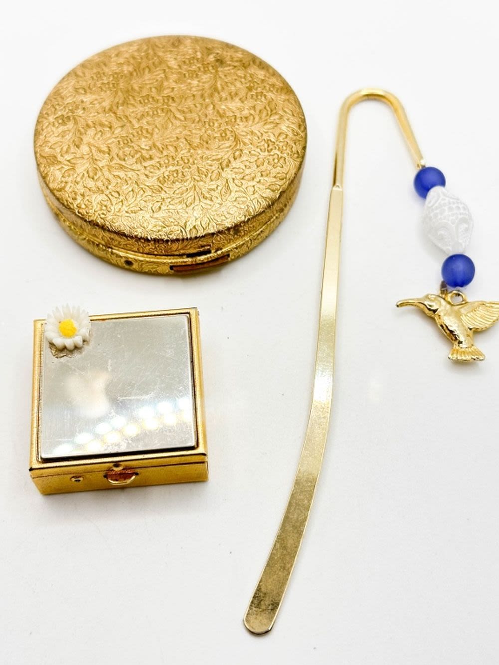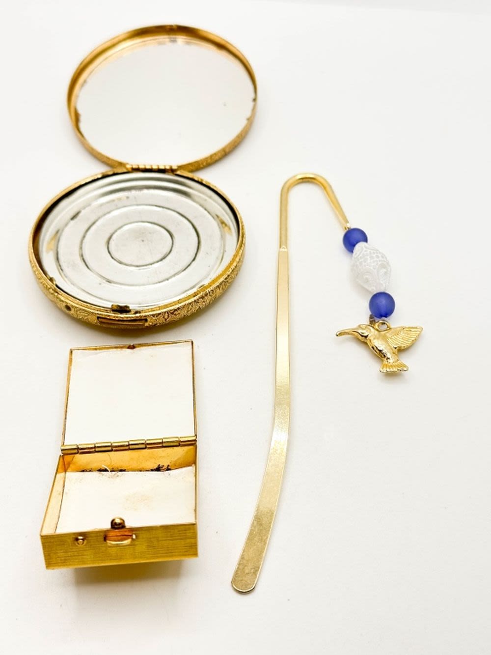 2 VINTAGE COMPACTS WITH MIRRORS AND BOOKMARK WITH DANGLES