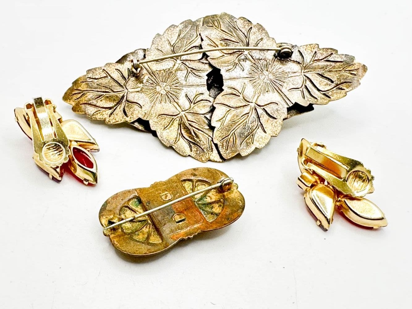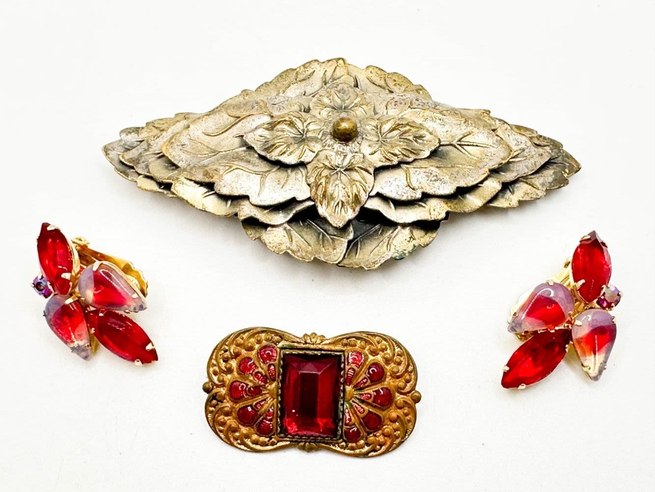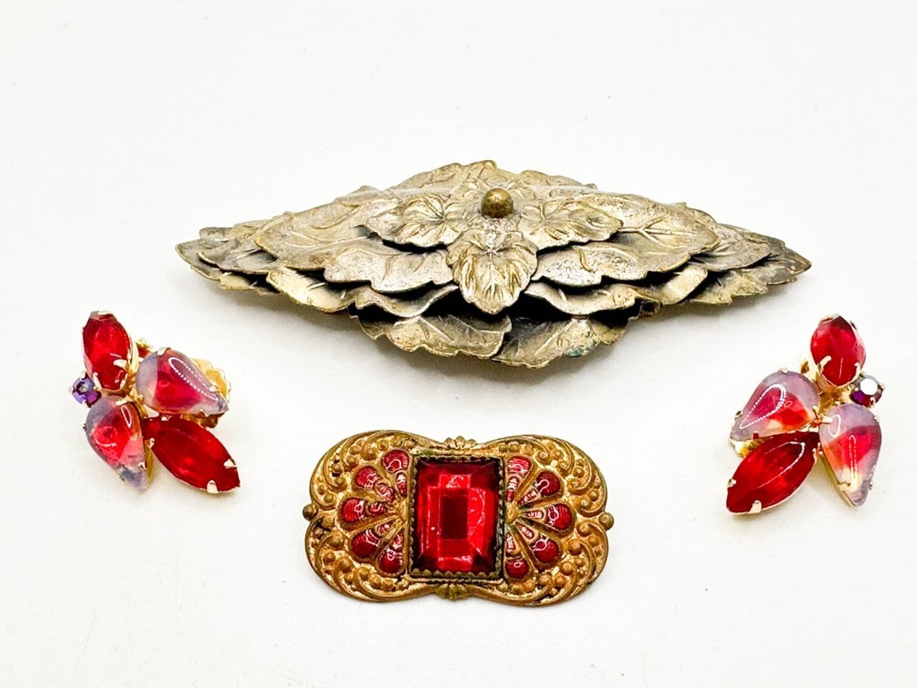 C CLASP RED STONE BROOCH, OTHER ANTIQUE? BROOCH, RED EARRINGS STONE SET