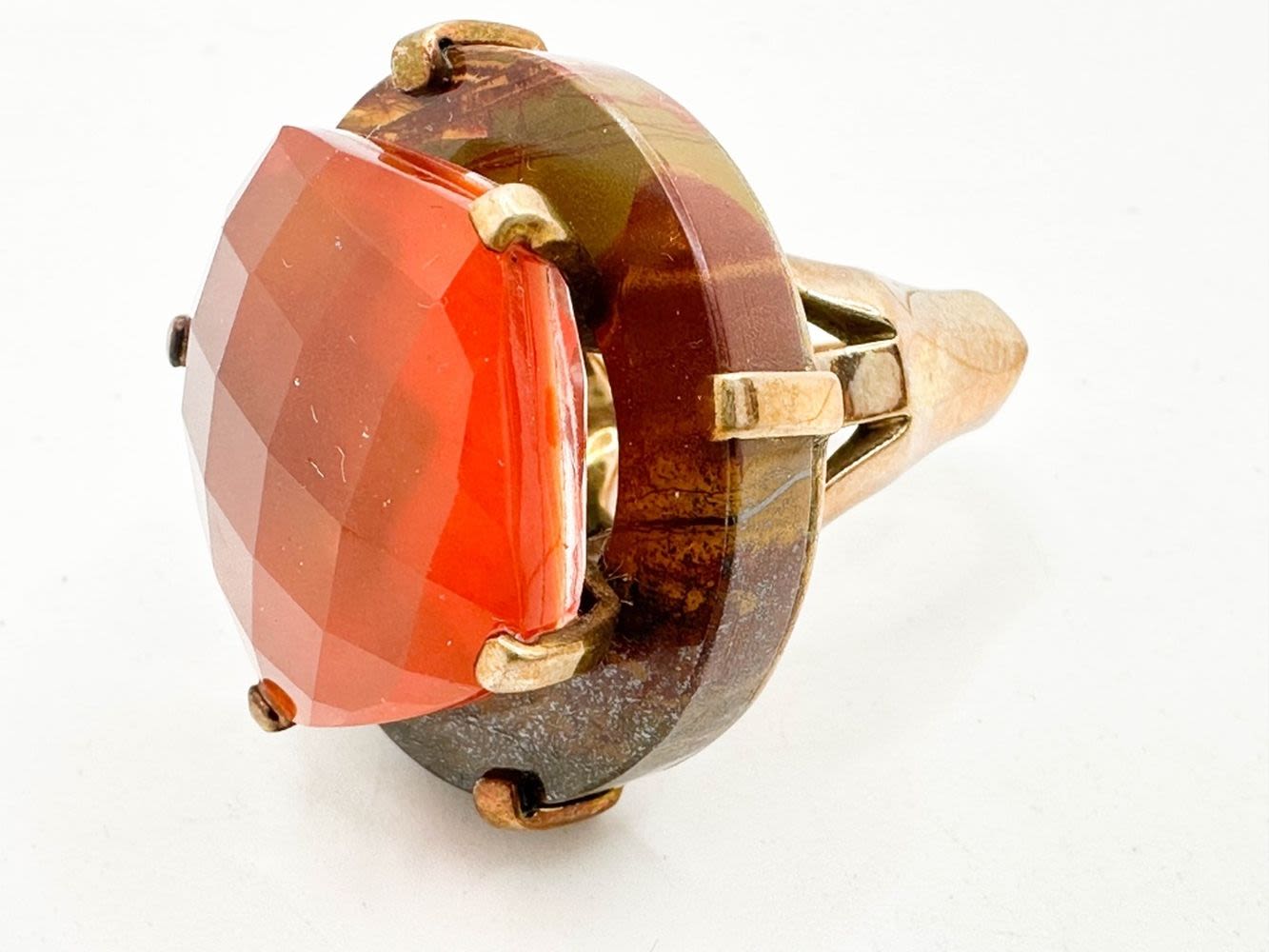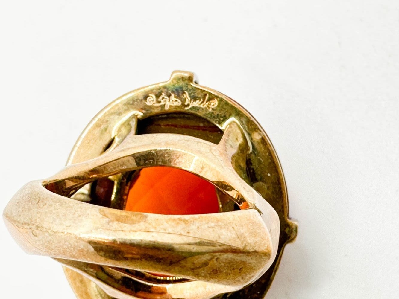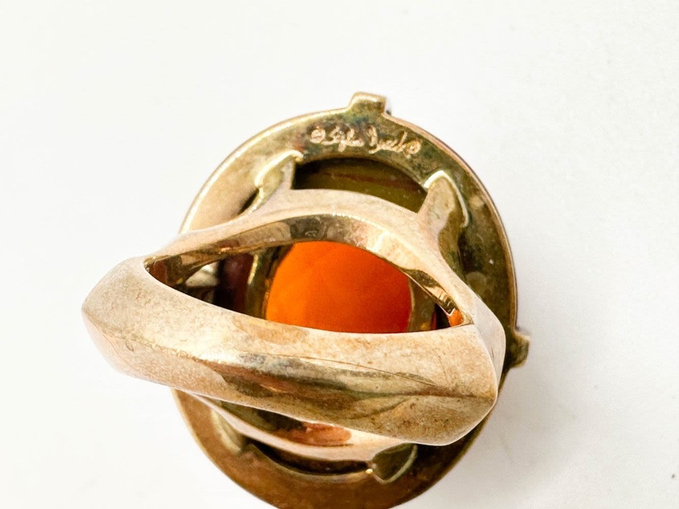 SIGNED LARGE FACETED STONE RING ON WOOD BASE, SYLVIA?