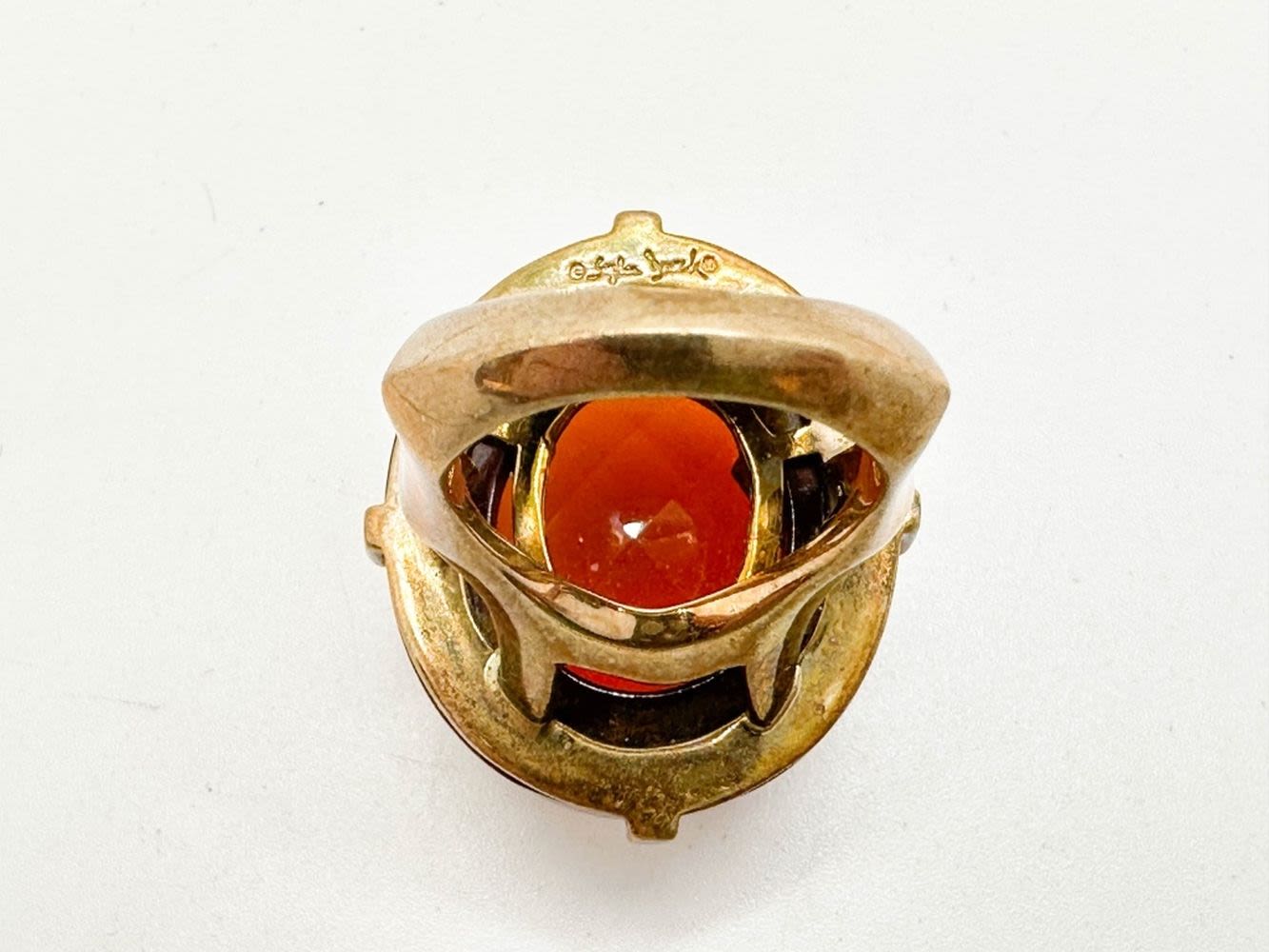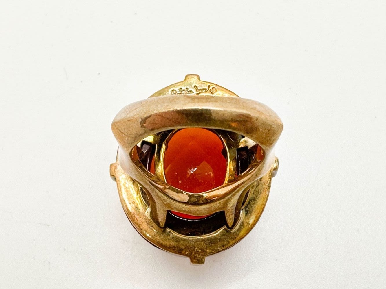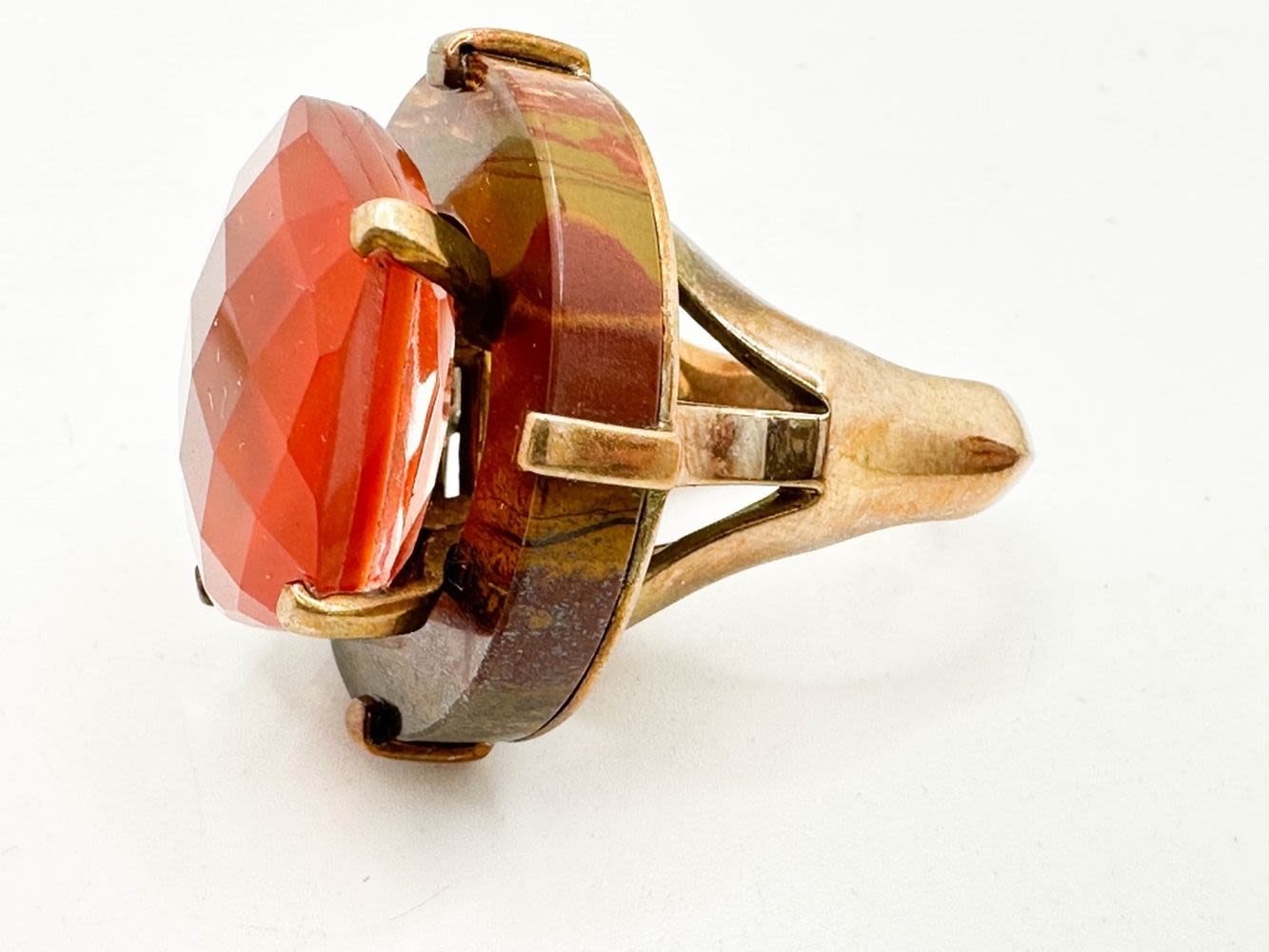 SIGNED LARGE FACETED STONE RING ON WOOD BASE, SYLVIA?