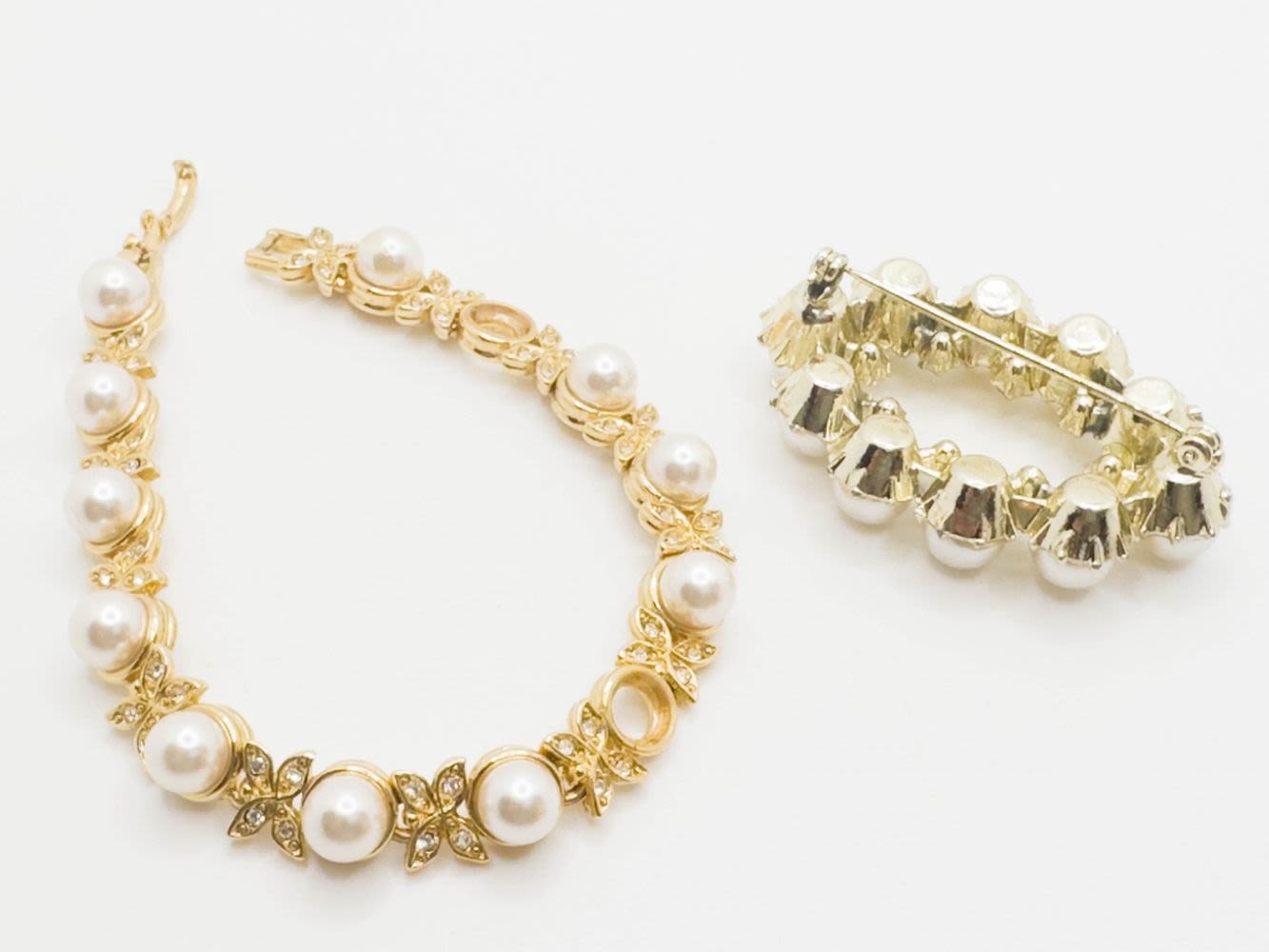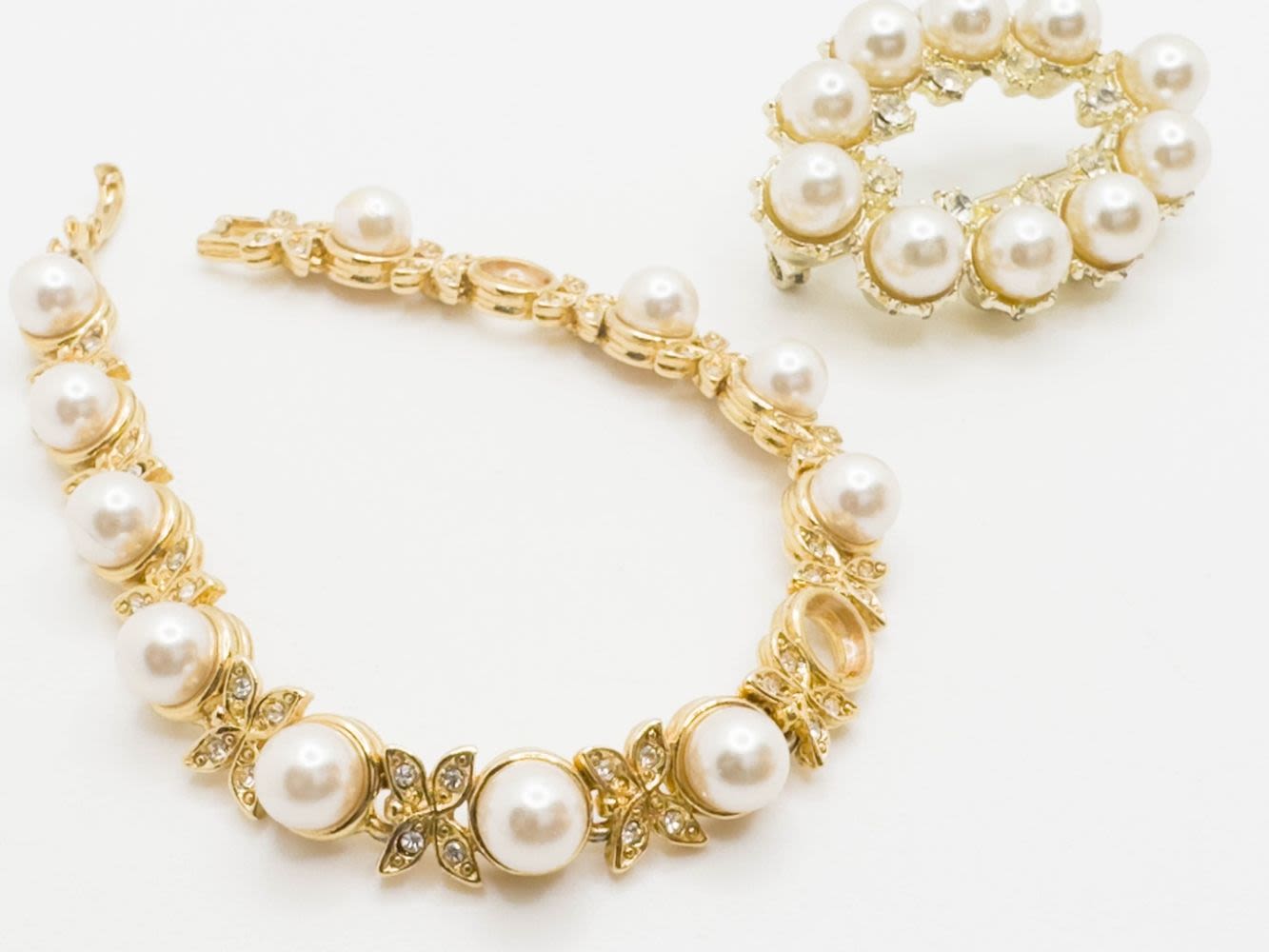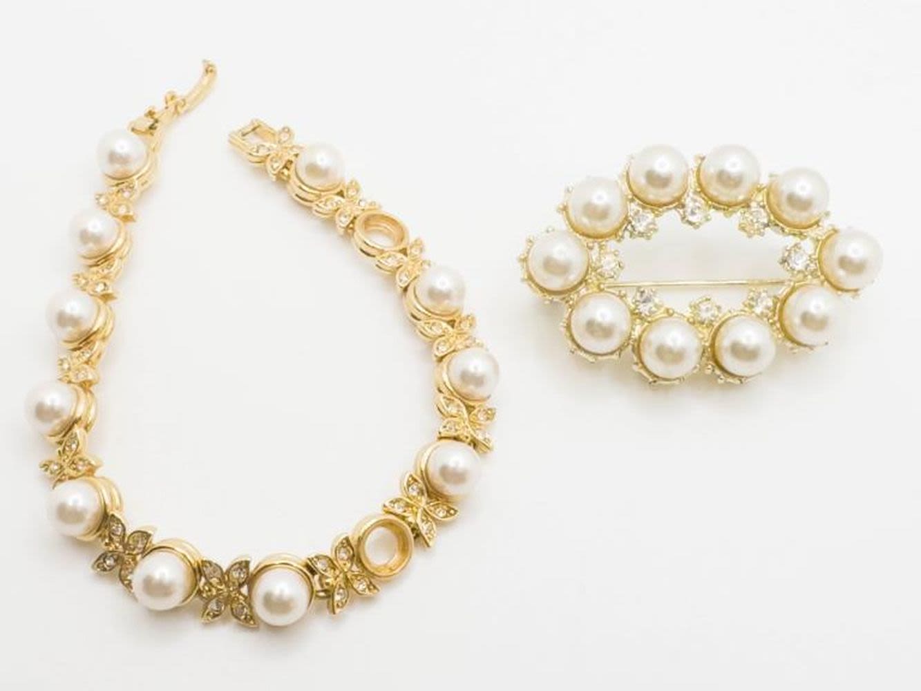 JOAN RIVERS BUTTERFLY BRACELET ,MISSING 2 FAUX PEARLS AND OTHER FAUX PEARL BROOCH WITH CLEAR STONE SURROUND