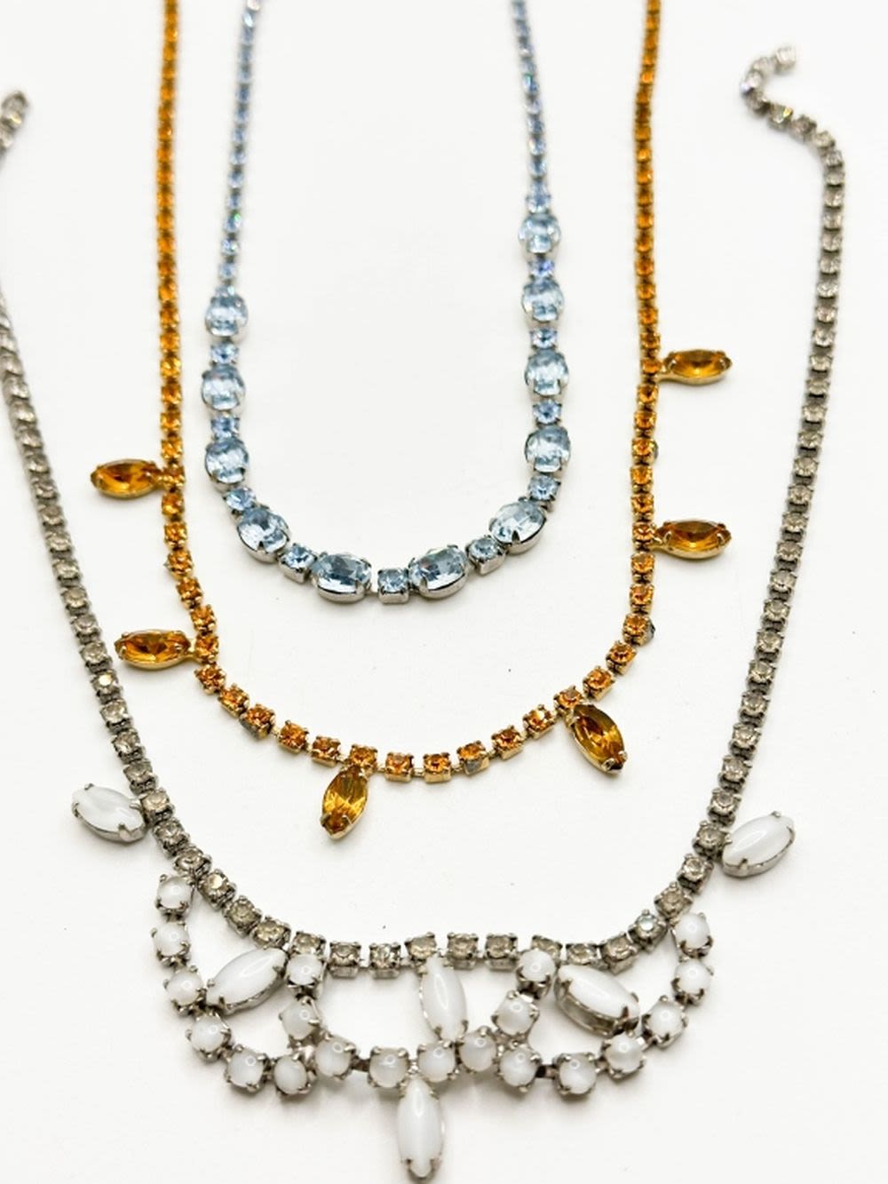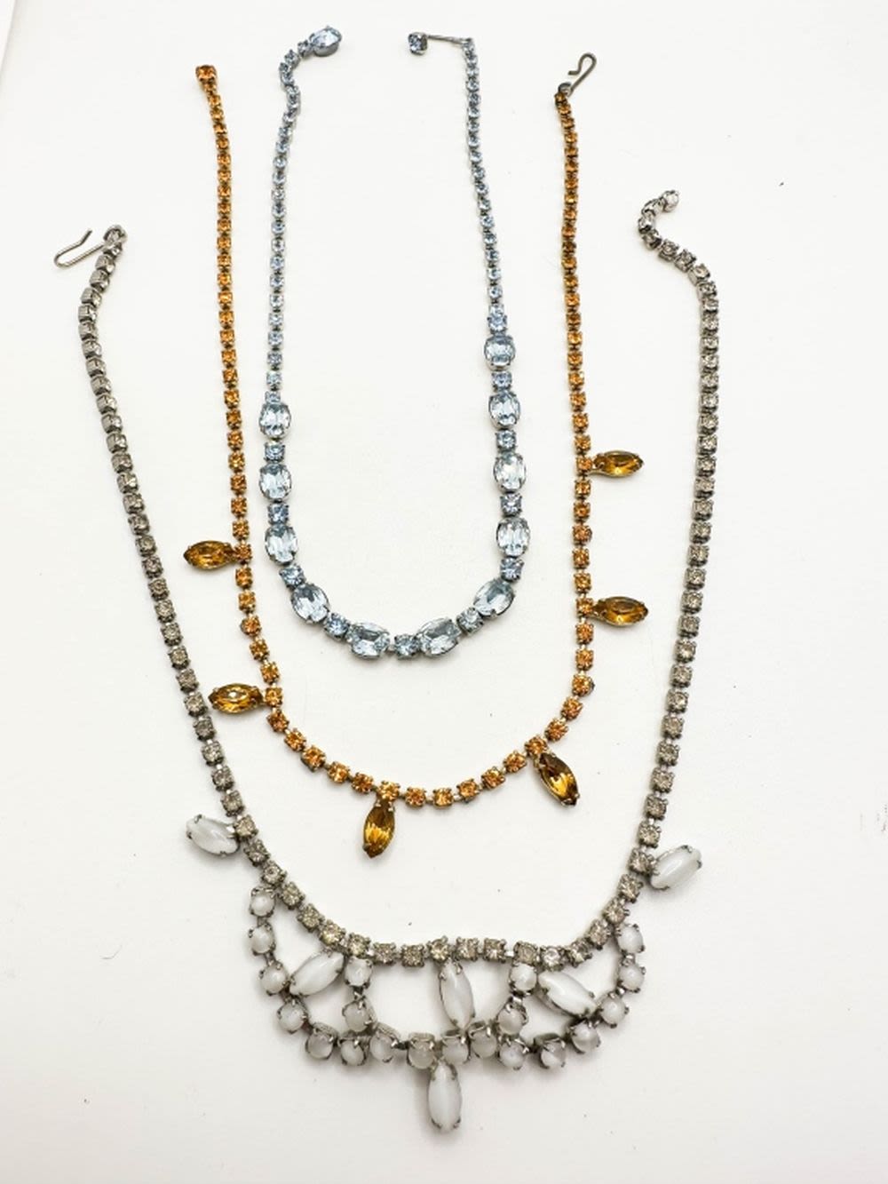 3 STONE NECKLACES, MILK GLASS? AMBER TONE AND SKY BLUE STONES