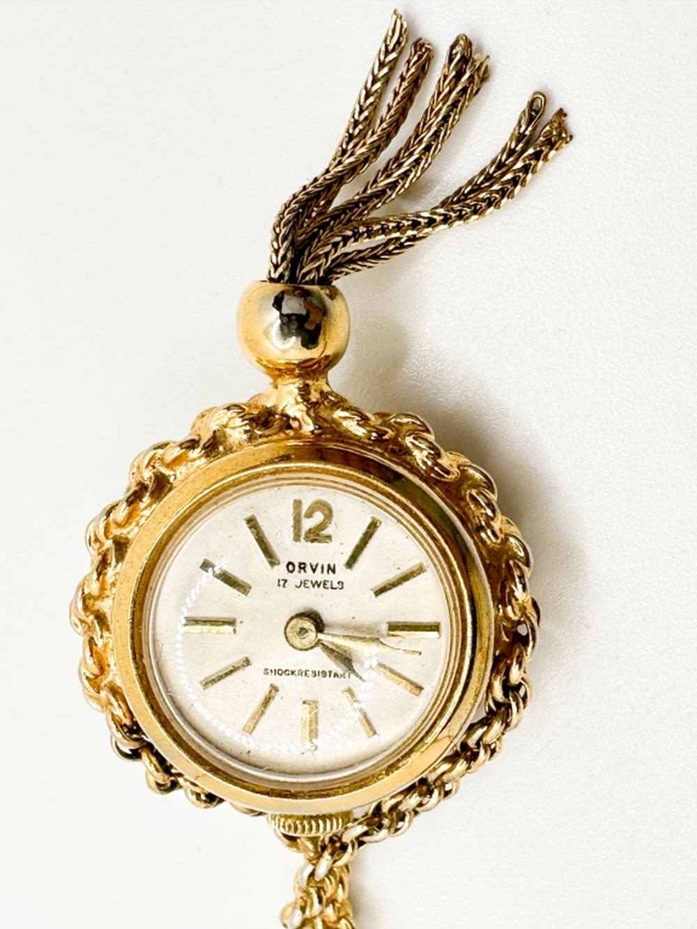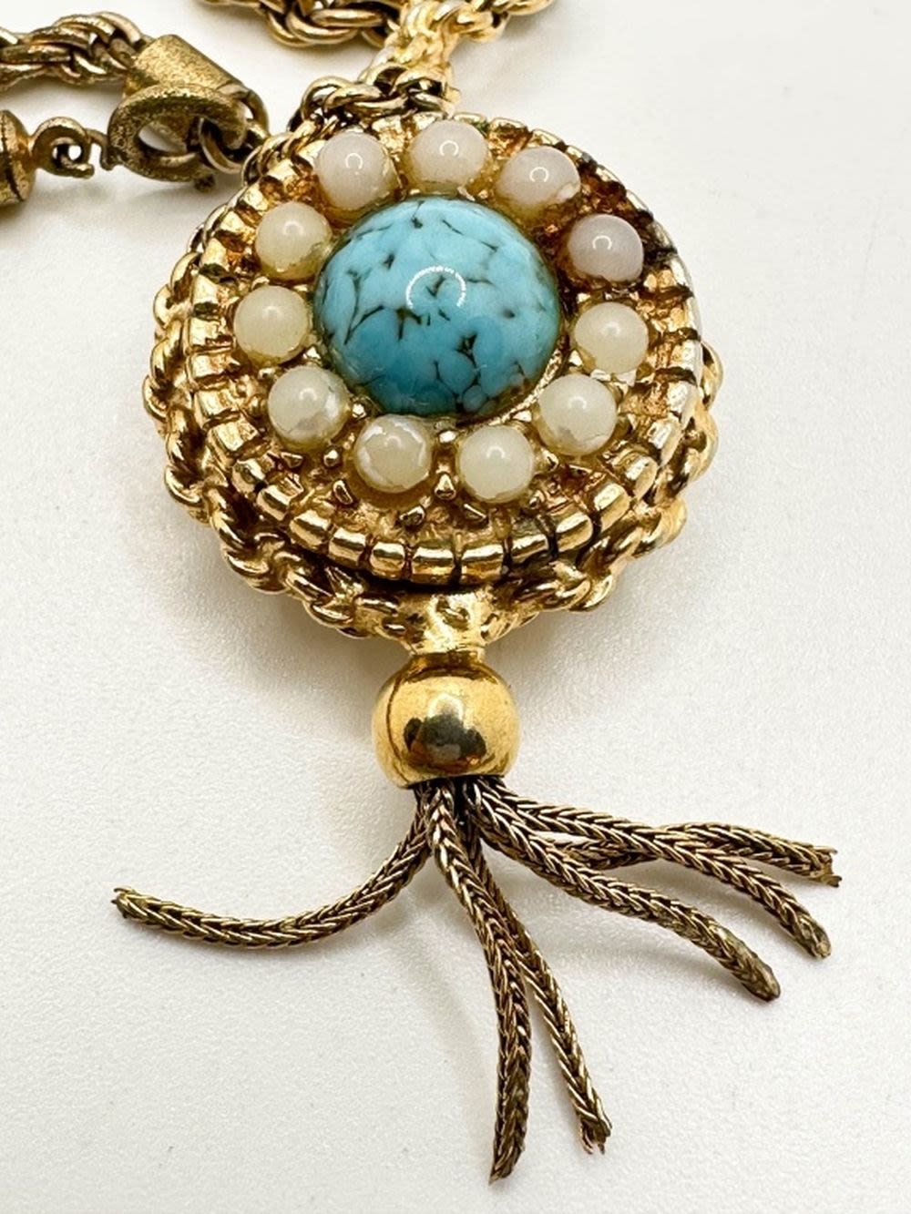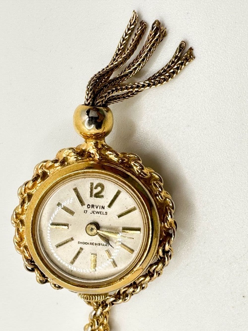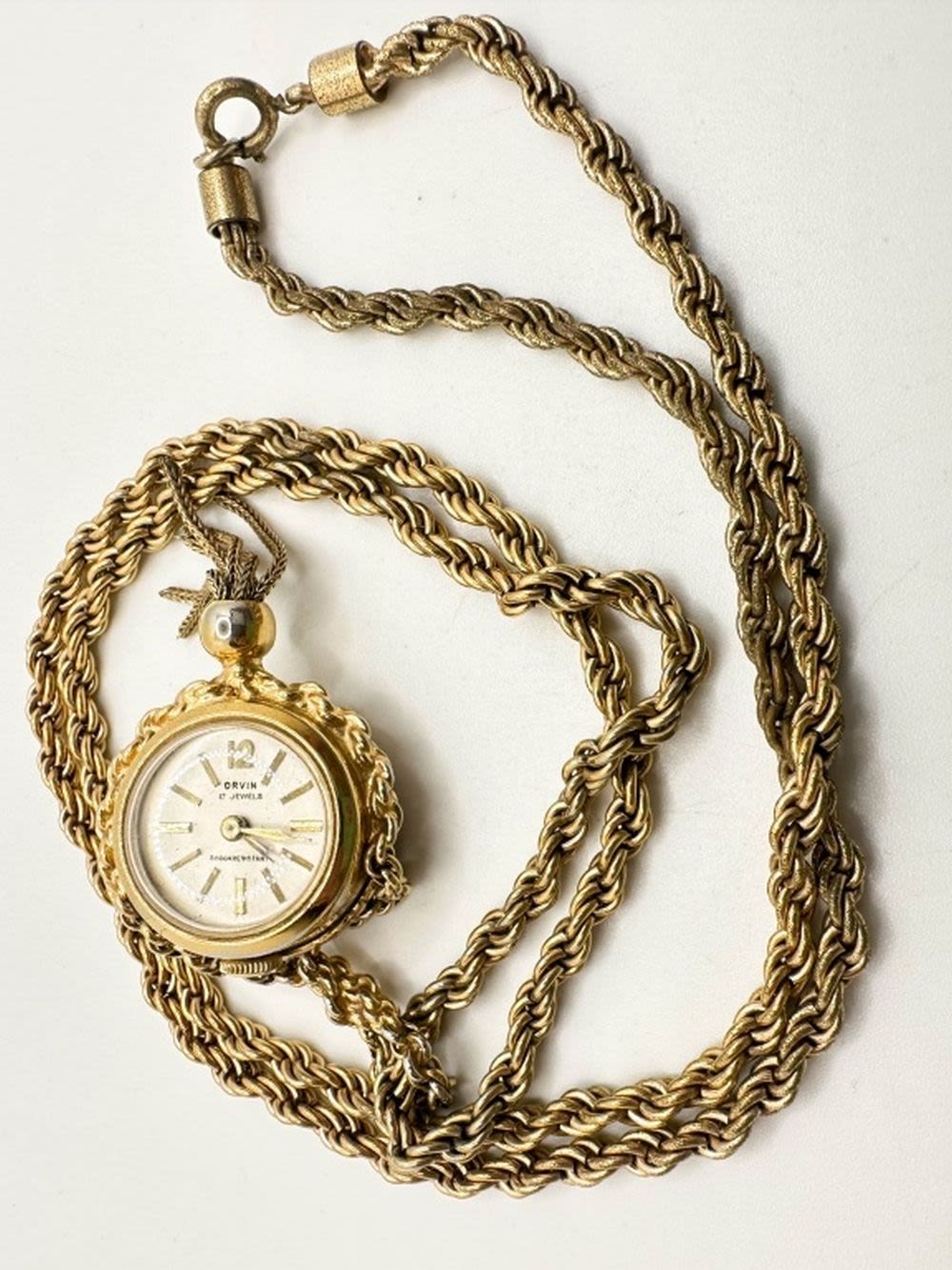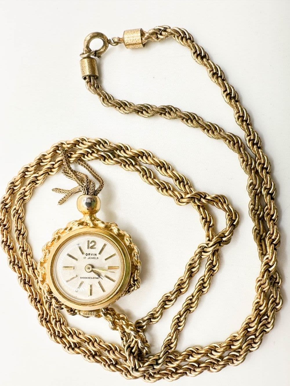 ORWIN 17 JEWEL WATCH ON GOLD TONE NECKLACE CHAIN WITH TURQUISE COLOR AND MILKY WHITE STONE SURROUND, SO PRETTY. NOT TESTED