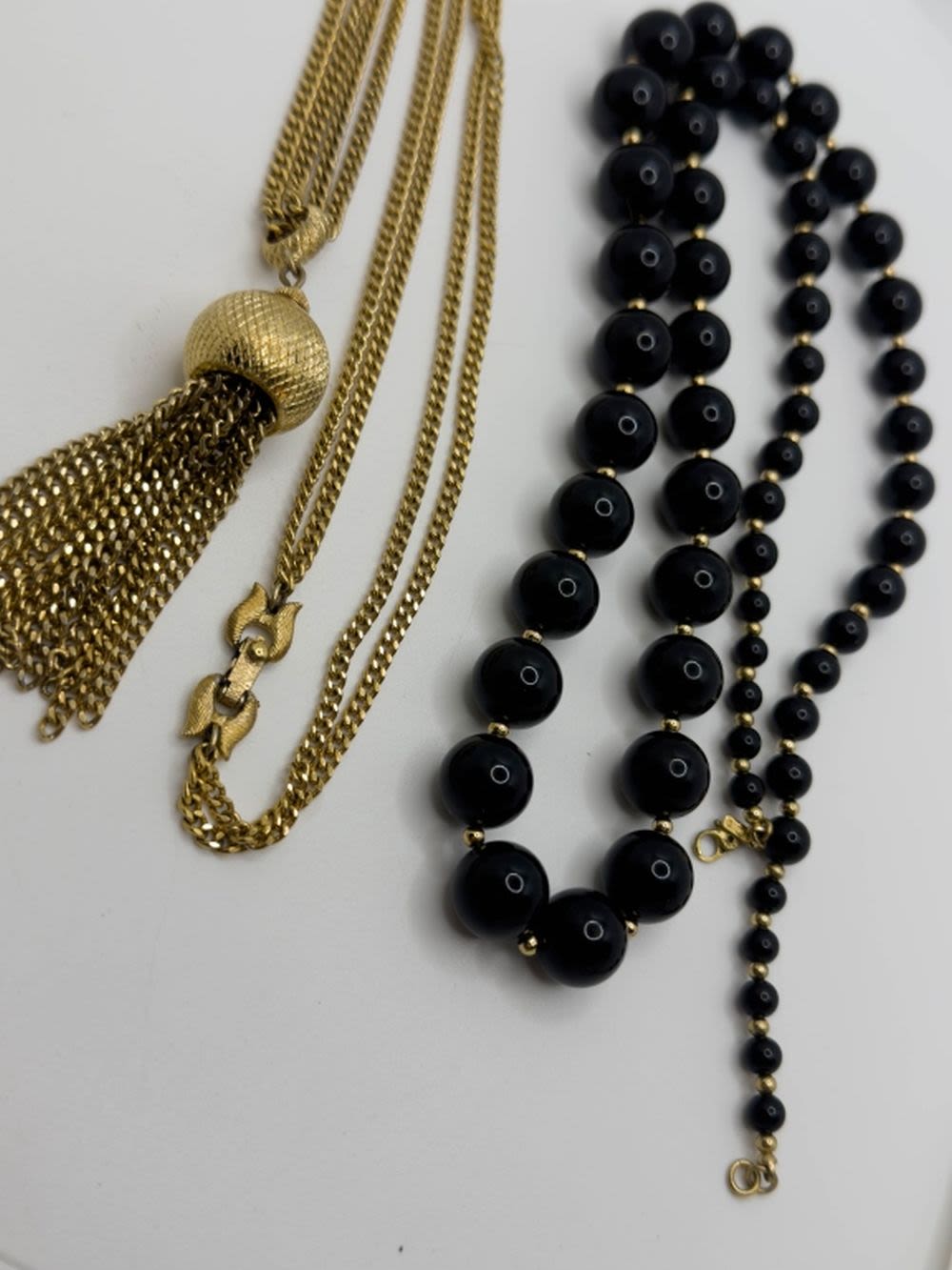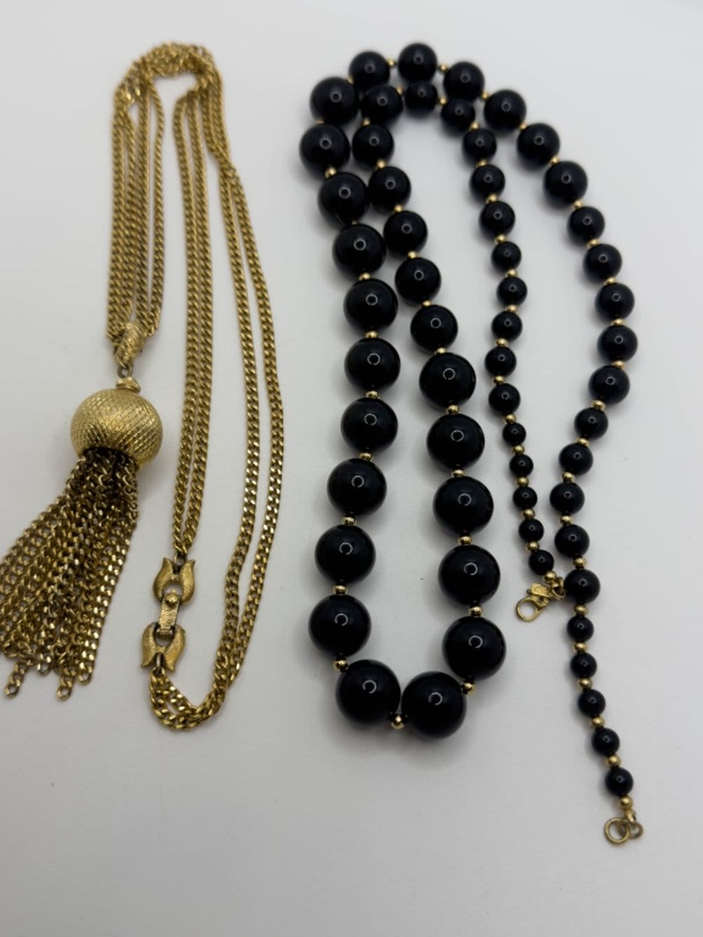 2 MONET SIGNED NECKLACES , BLACK BEAD AND DANGLE SIGNED MONETS