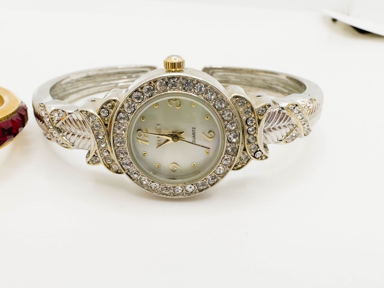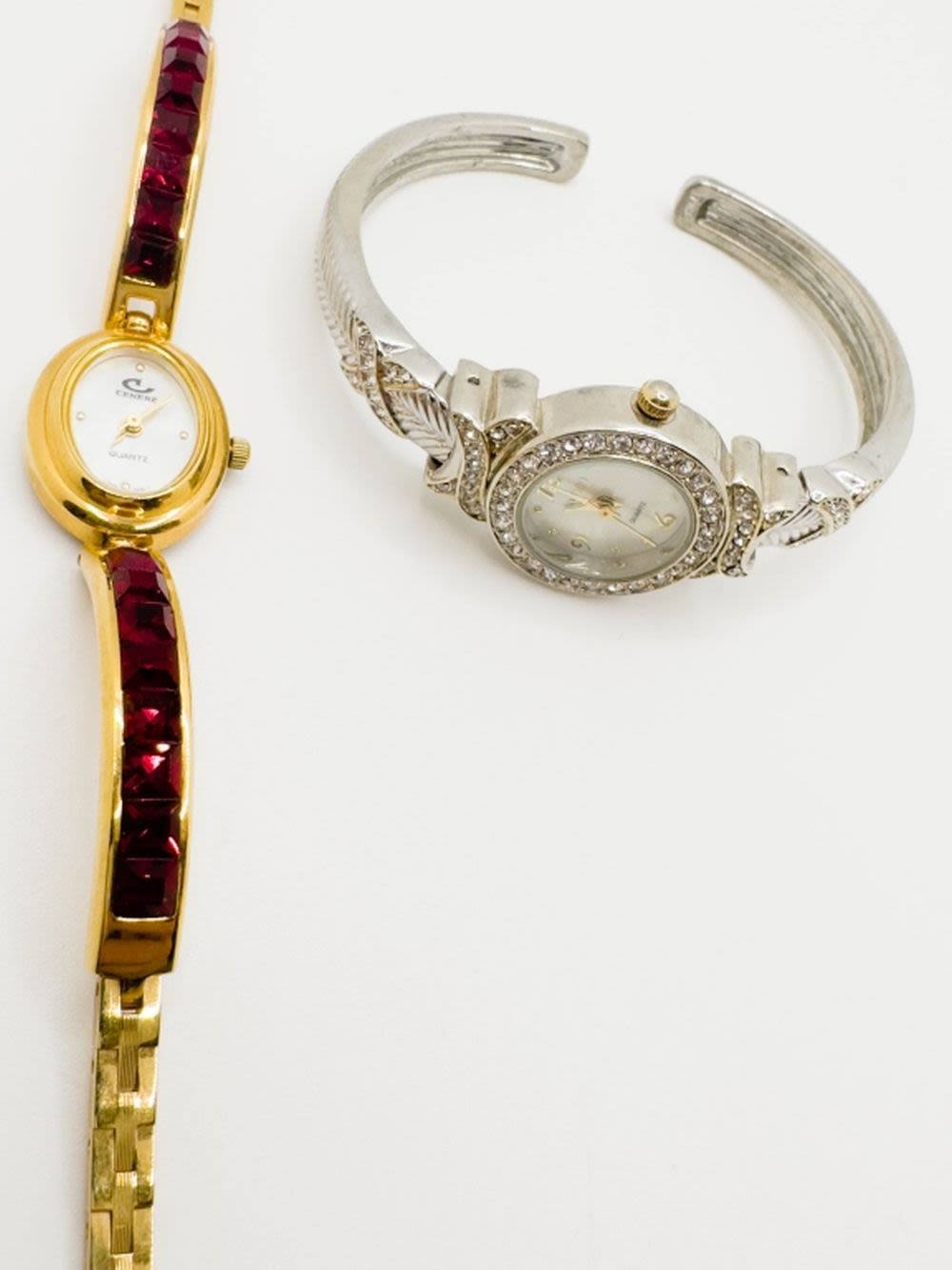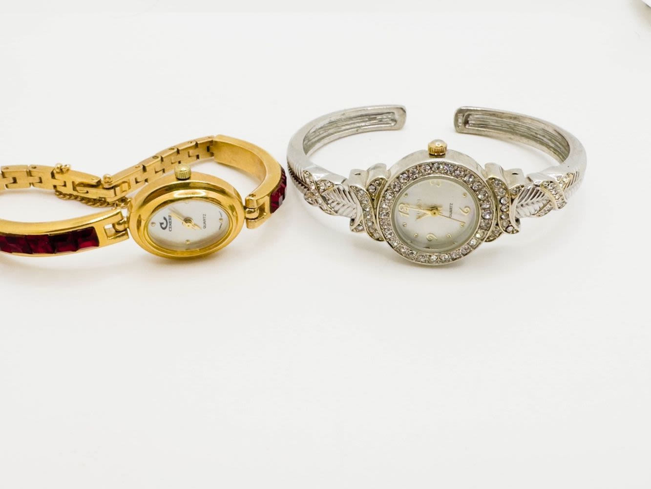 2 BEAUTIFUL STONE WATCHES, ONE CLEAR STONE, ONE RED STONE. NOT TESTED