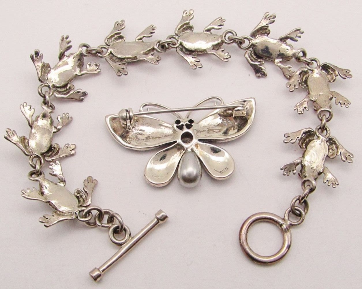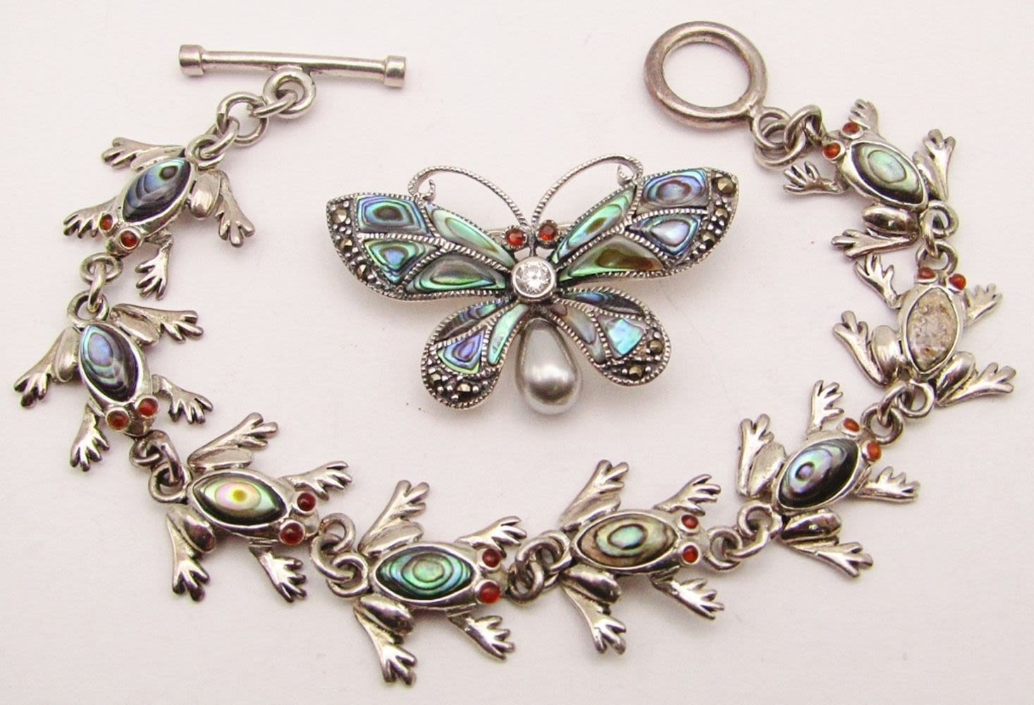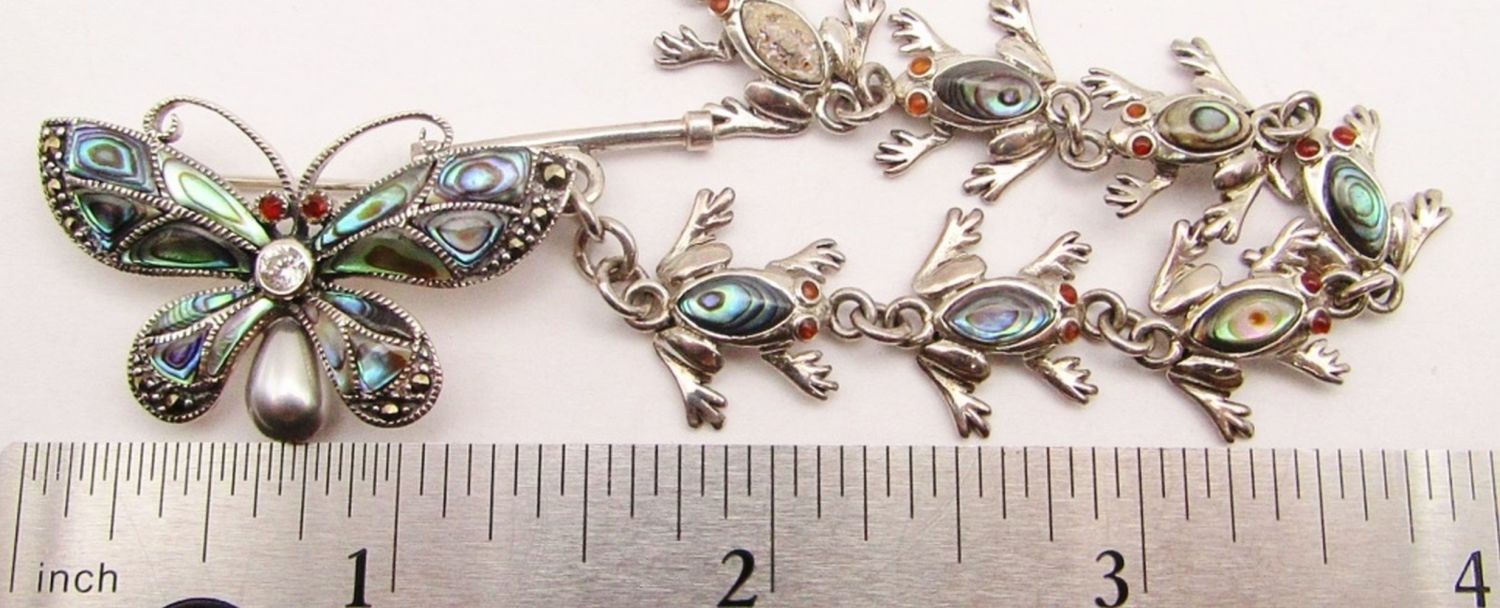 INLAY DESIGN PLUS BONUS BUTTERFLY MARCASITE BROOCH WITH ABILONE INLAY DESIGN-MEASURES 7 INCHES-TOTAL 13 DWT