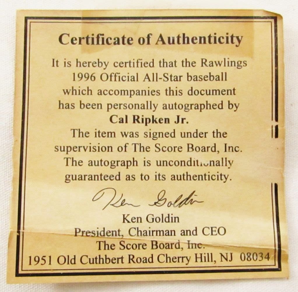 COA KEN GOLDIN – 1996 A.L. ALL-STAR – OFFICIAL BALL 1996 ALL-STAR GAME