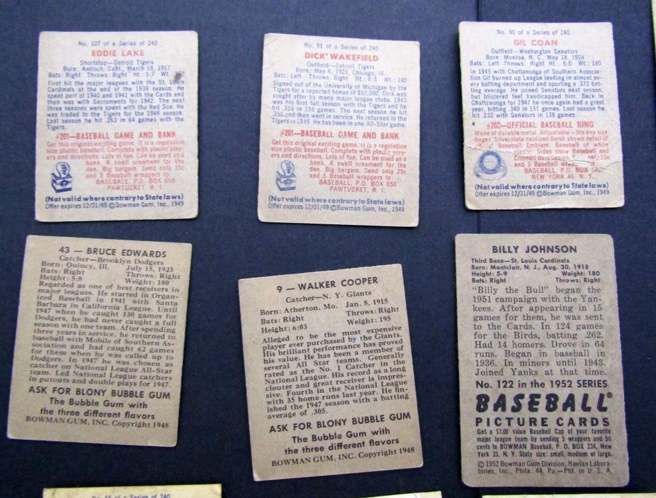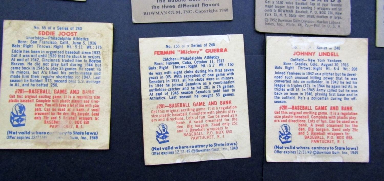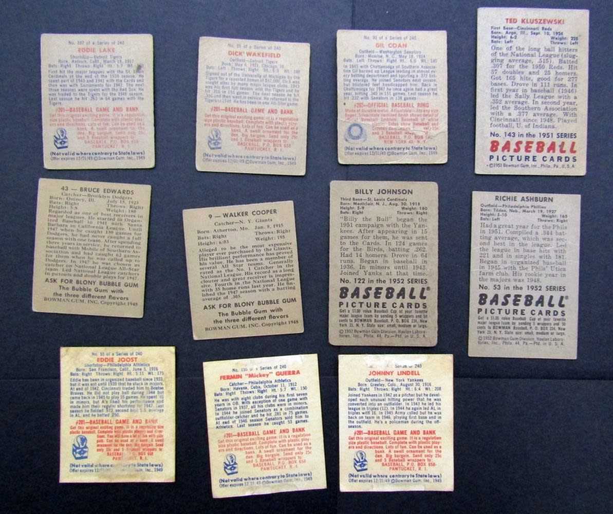 1948 BOWMAN #9 & 43 VGEX/EX; 1949 #55, 155, 197 glue residue on backs, 1949 #90, #91, #107 VG ; 1951 BOWMAN #143 KLUSZEWSKI GOOD, 1952 BOWMAN #53 ASHBURN VG & #122 JOHNSON GOOD
