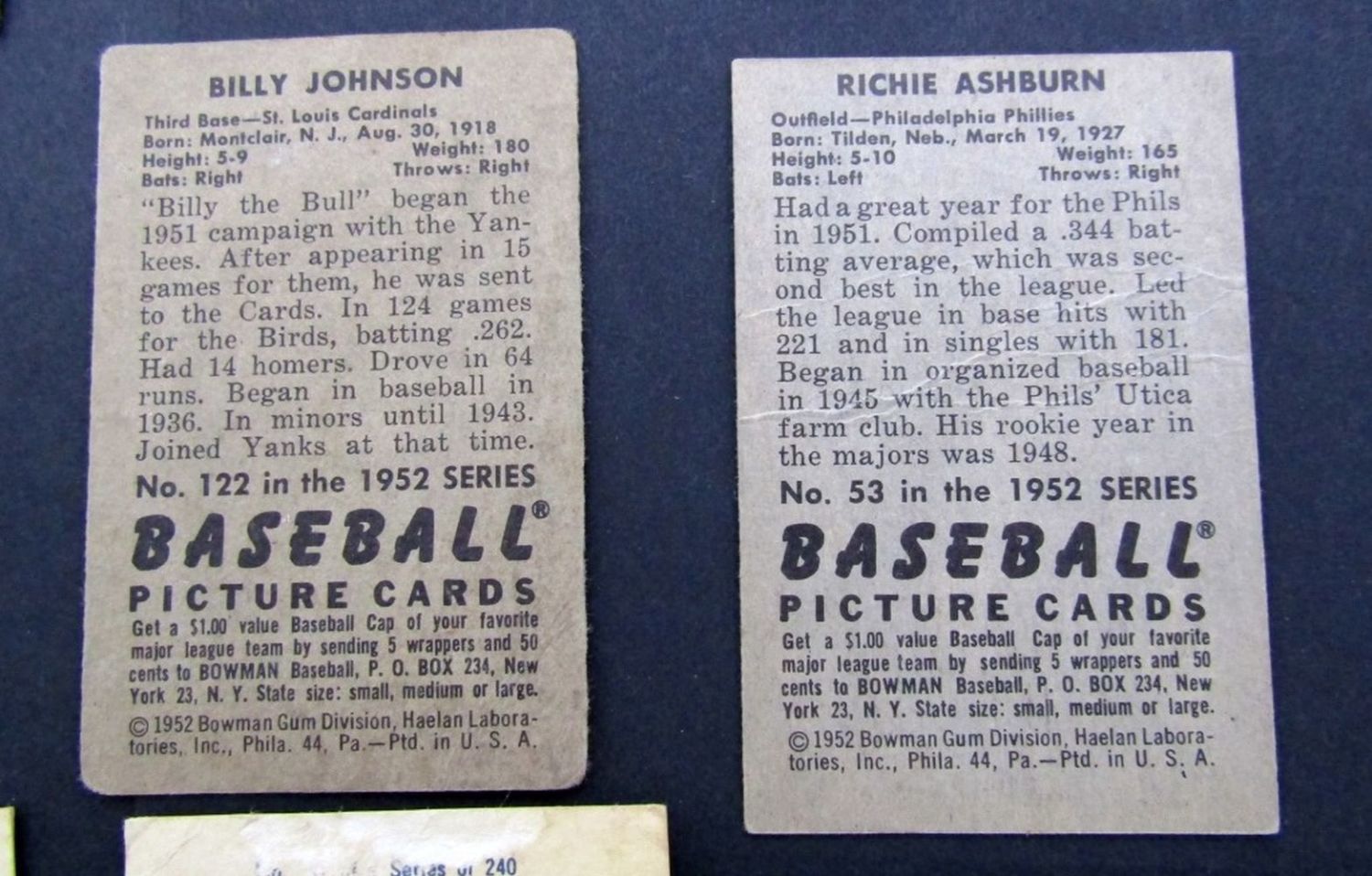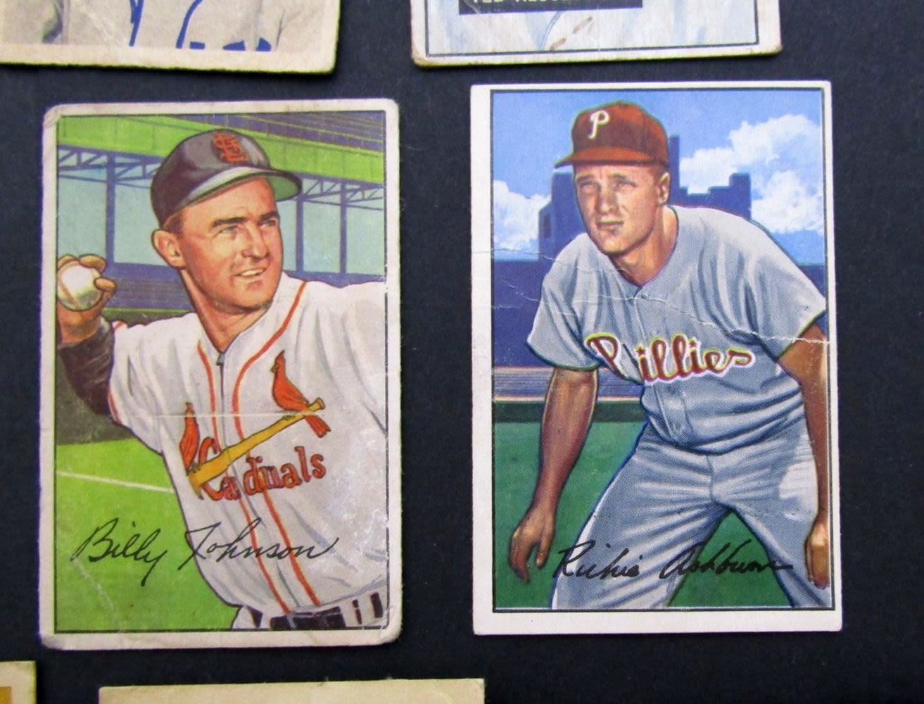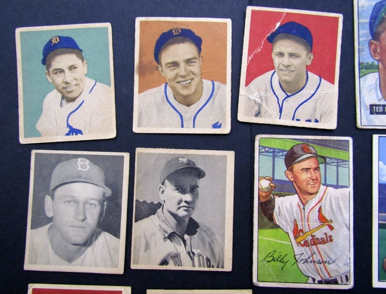 1948 BOWMAN #9 & 43 VGEX/EX; 1949 #55, 155, 197 glue residue on backs, 1949 #90, #91, #107 VG ; 1951 BOWMAN #143 KLUSZEWSKI GOOD, 1952 BOWMAN #53 ASHBURN VG & #122 JOHNSON GOOD