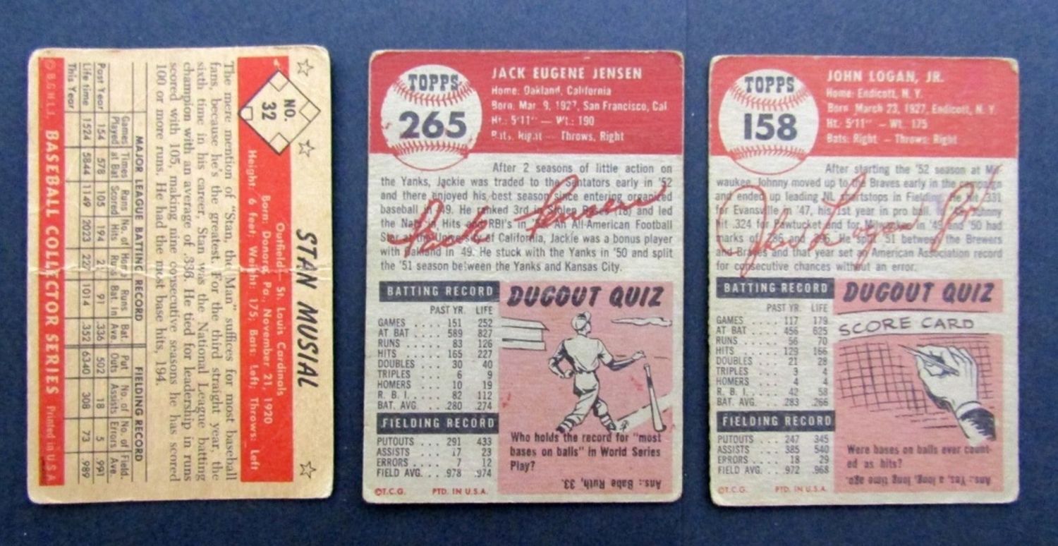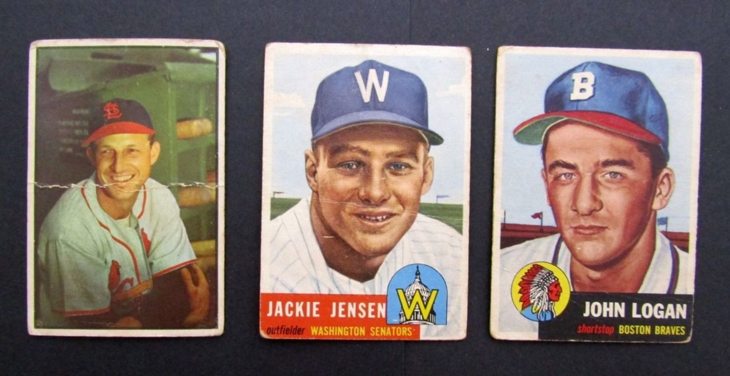 1953 BOWMAN COLOR #32 GOOD HEAVY CREASE; (2) 1953 TOPPS #158 LOGAN & #265 JENSEN VG/GOOD