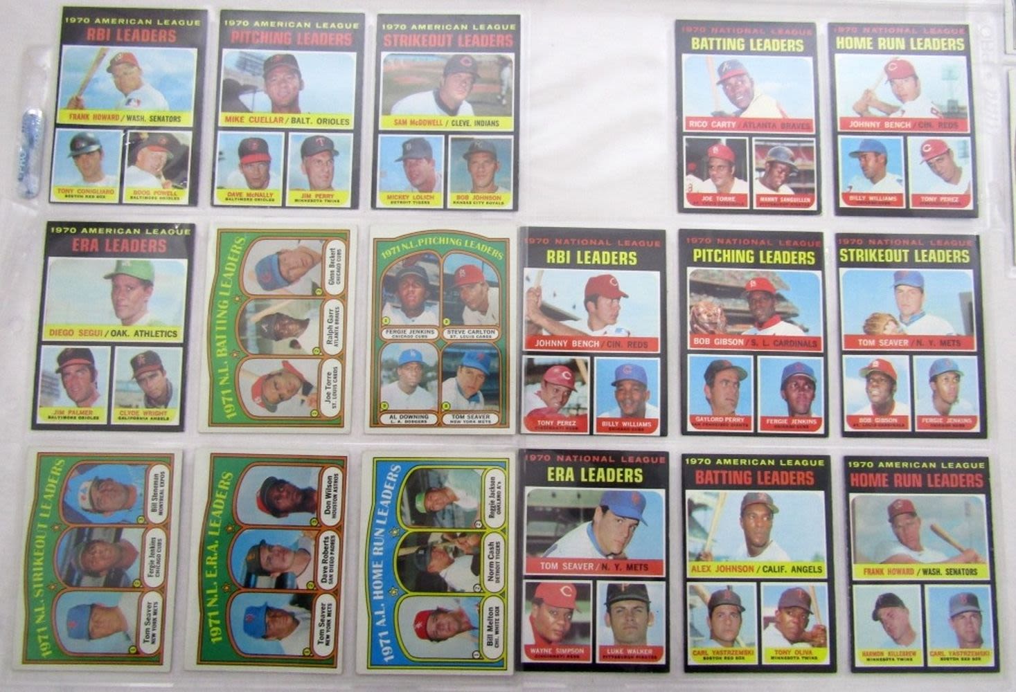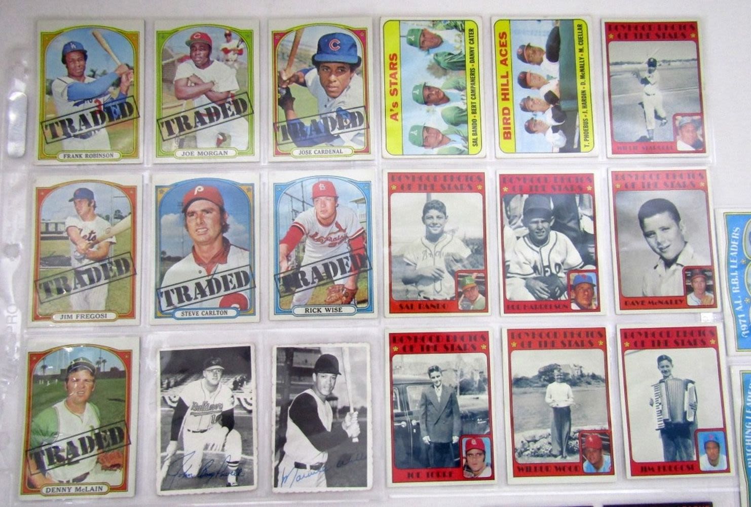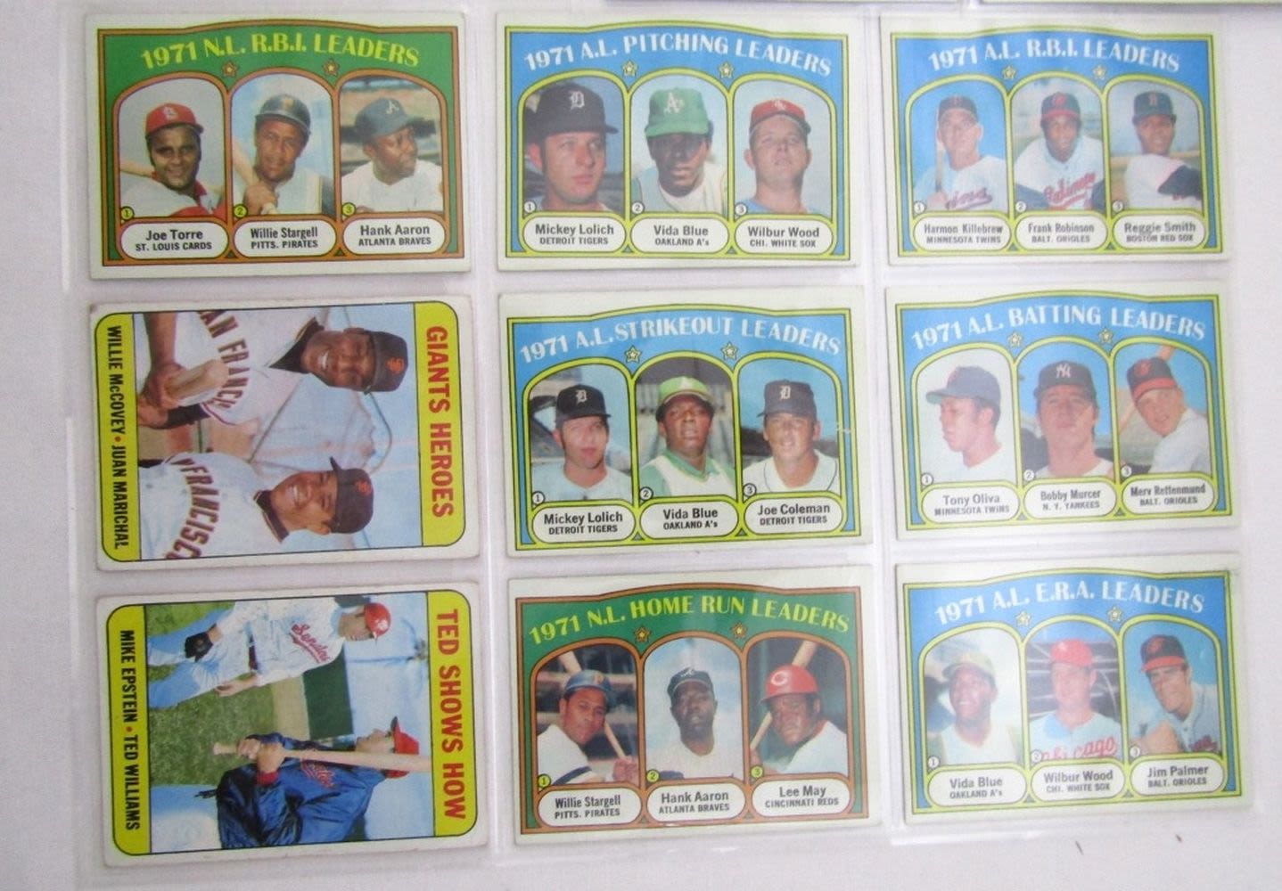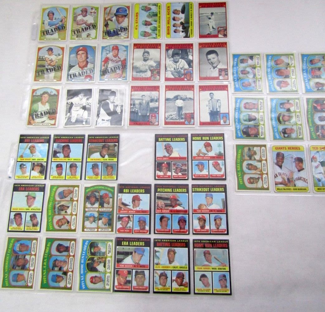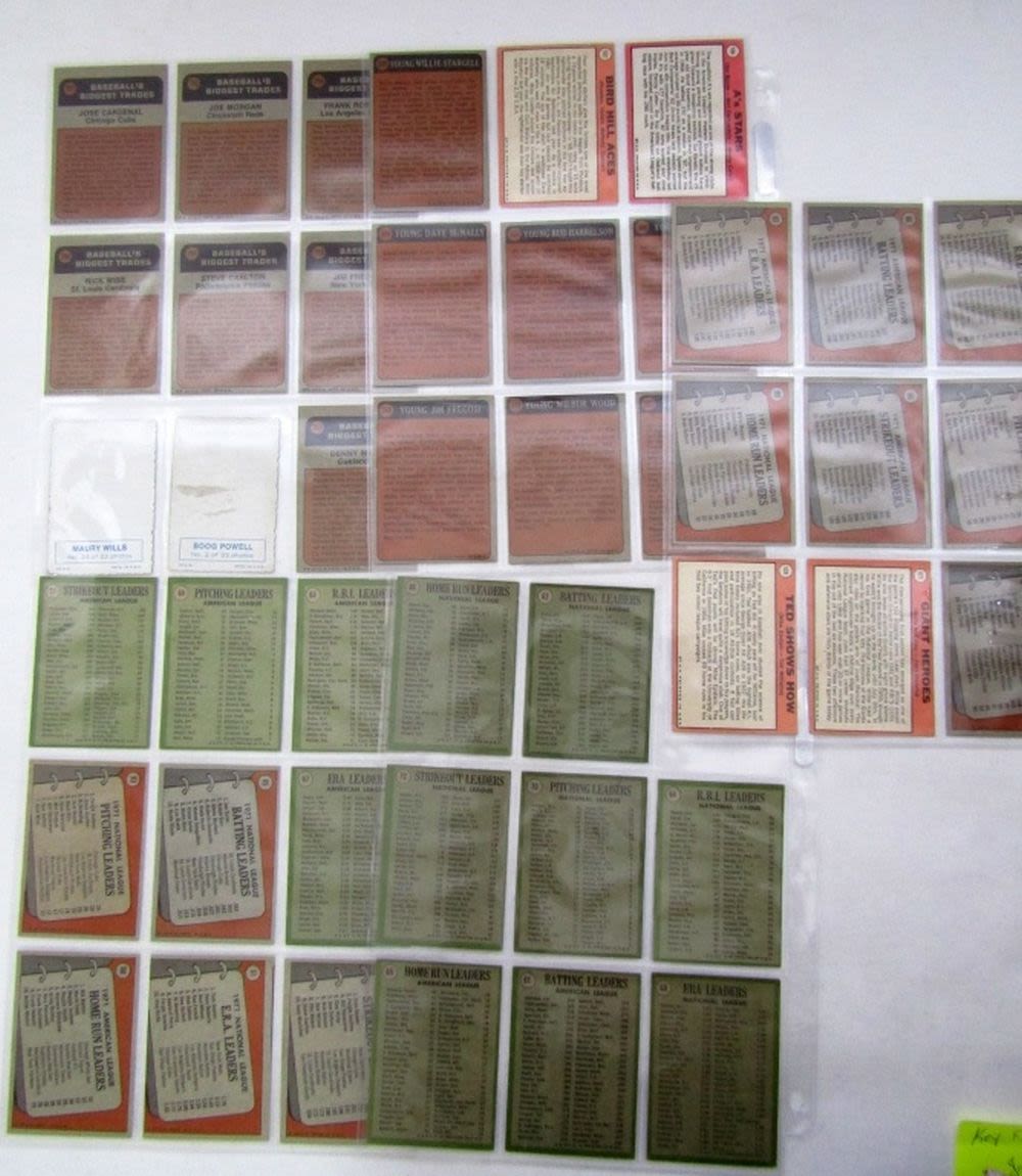 1969 TOPPS A’s STARS , BIRD HILL ACES, GIANTS HEROES, TED SHOWS HOW; (2) 1969 TOPPS DECKLE EDGE; (12) 1971 TOPPS LEAGUE LEADERS, (12) 1972 TOPPS LEAGUE LEADERS, (7) 1972 TOPPS BOYHOOD, (7) 1972 TOPPS TRADED MORGAN,