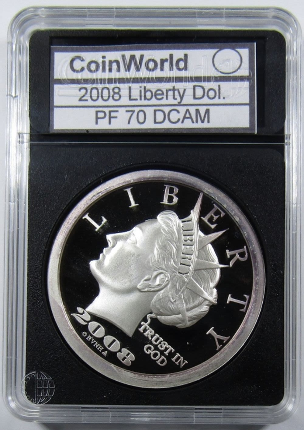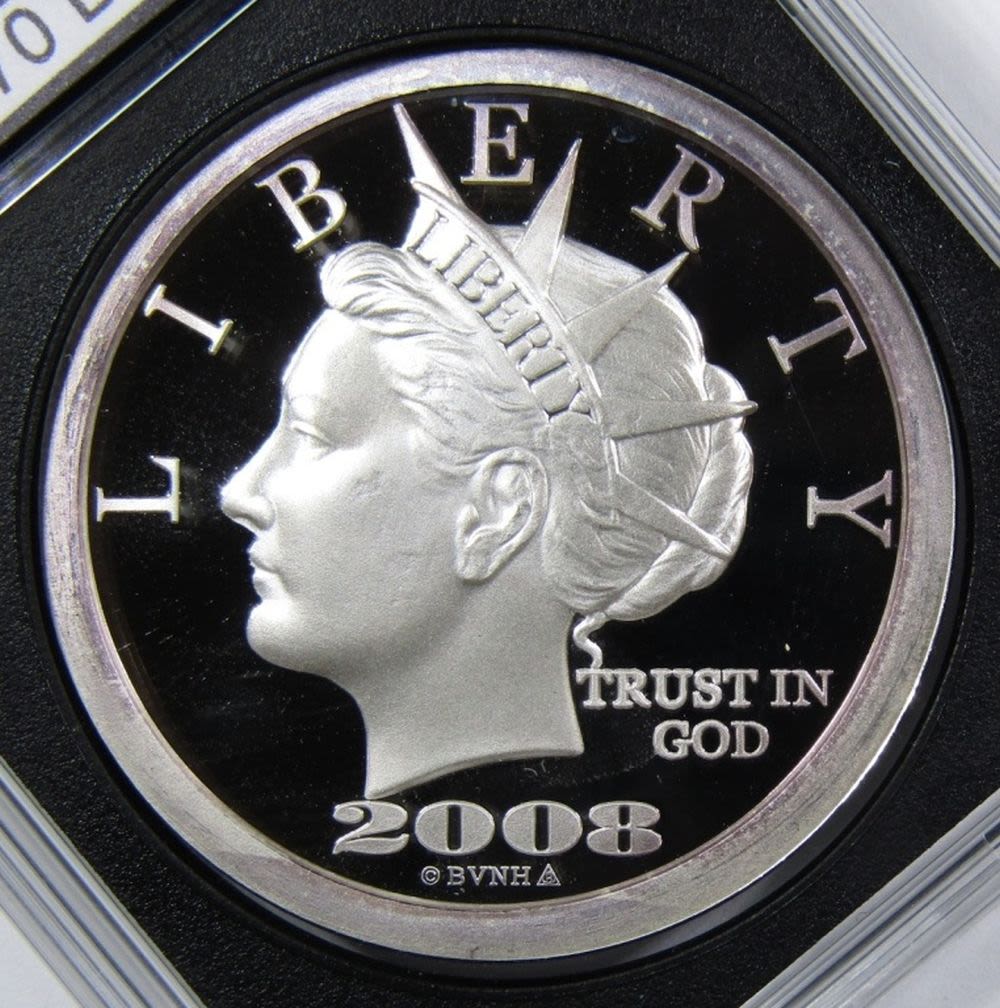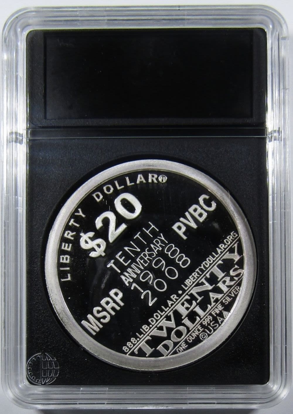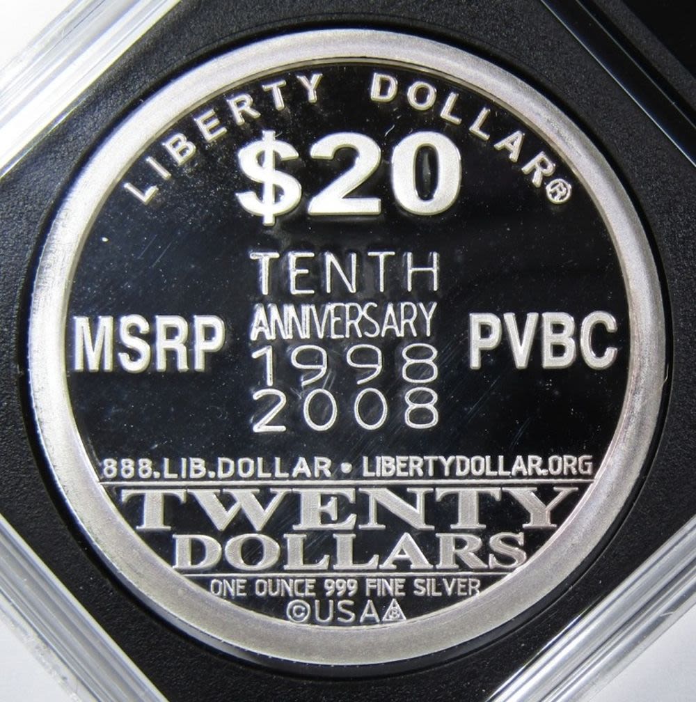 TENTH ANNIVERSARY “$20 LIBERTY DOLLAR” SILVER ROUND IN PLASTIC SLAB.