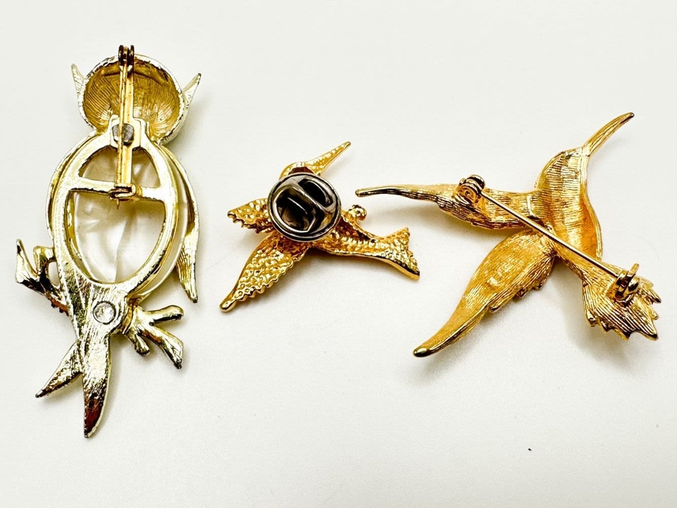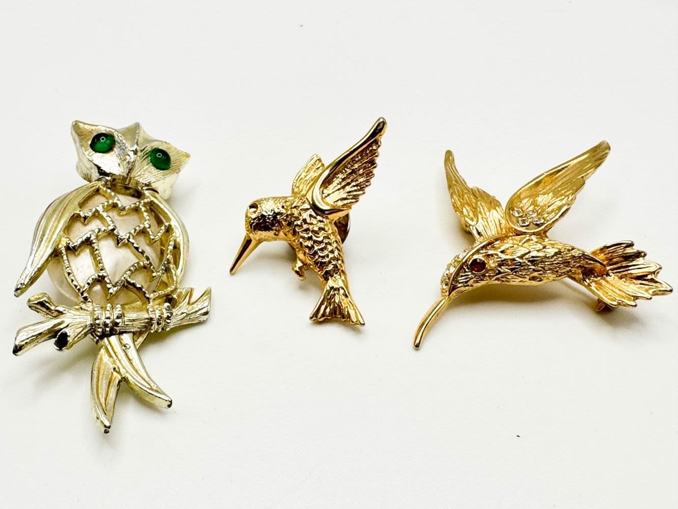HUMMINGBIRDS AND OWL BROOCHES , OWL HAS GREEN EYES