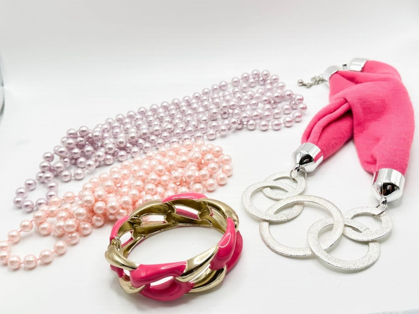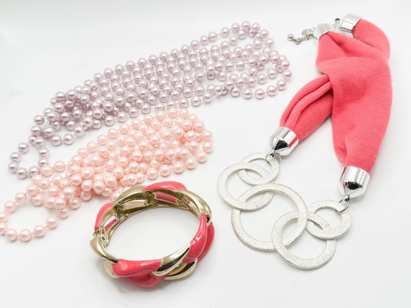 NECKLACES, NEW AND OLD FOR SPRING , ONE BRACELET WITH PRETTY PINK PAINT DETAIL