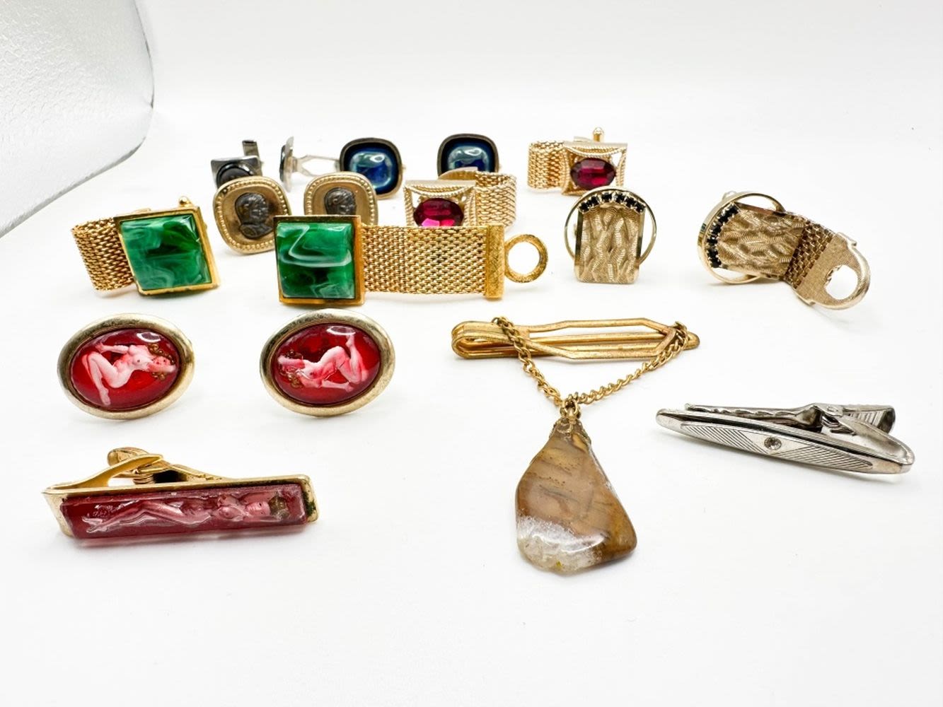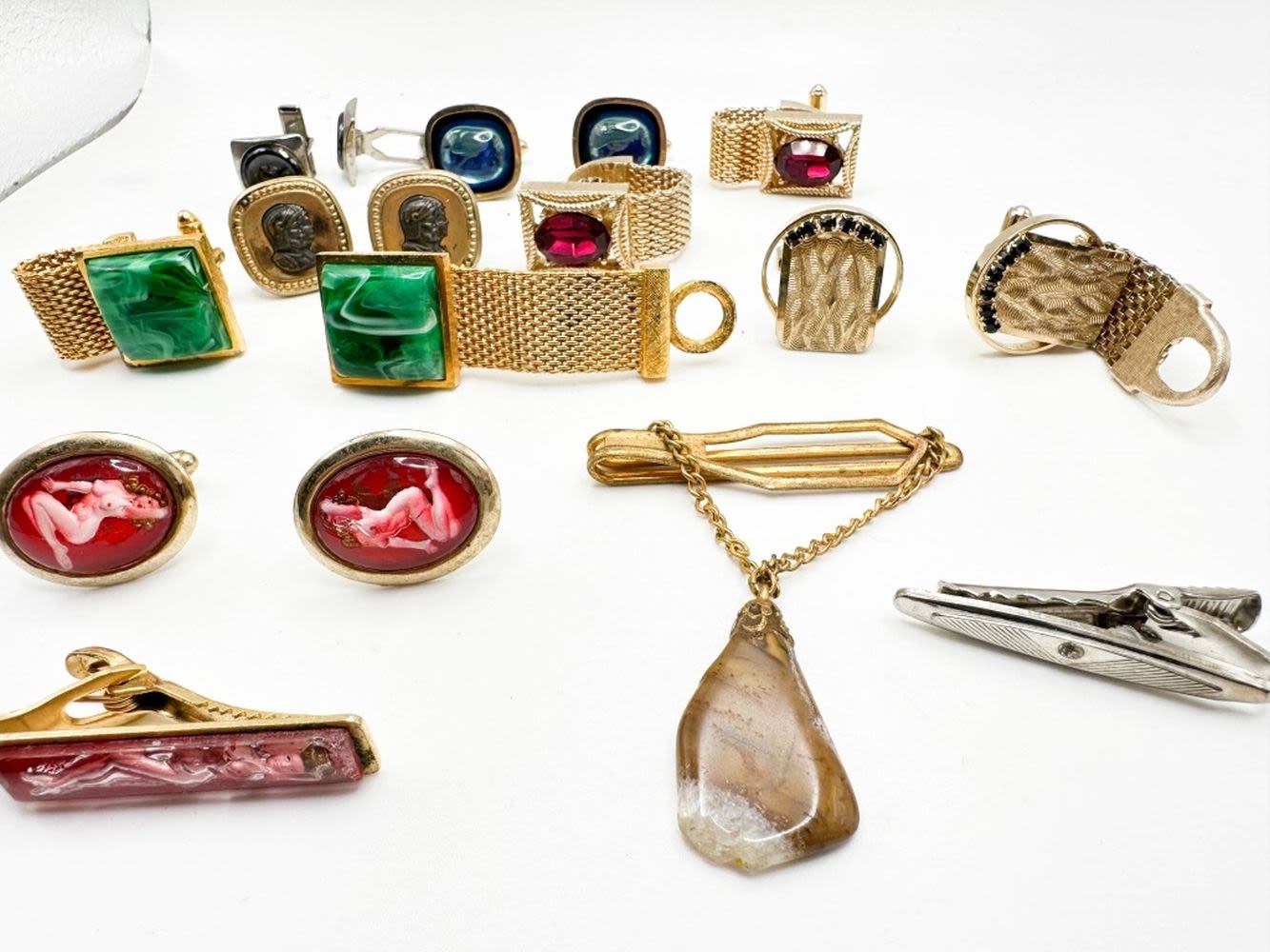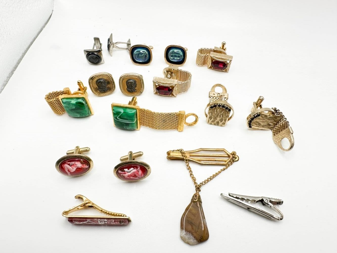 CUFF LINKS WITH STONES AND TIE CLIPS