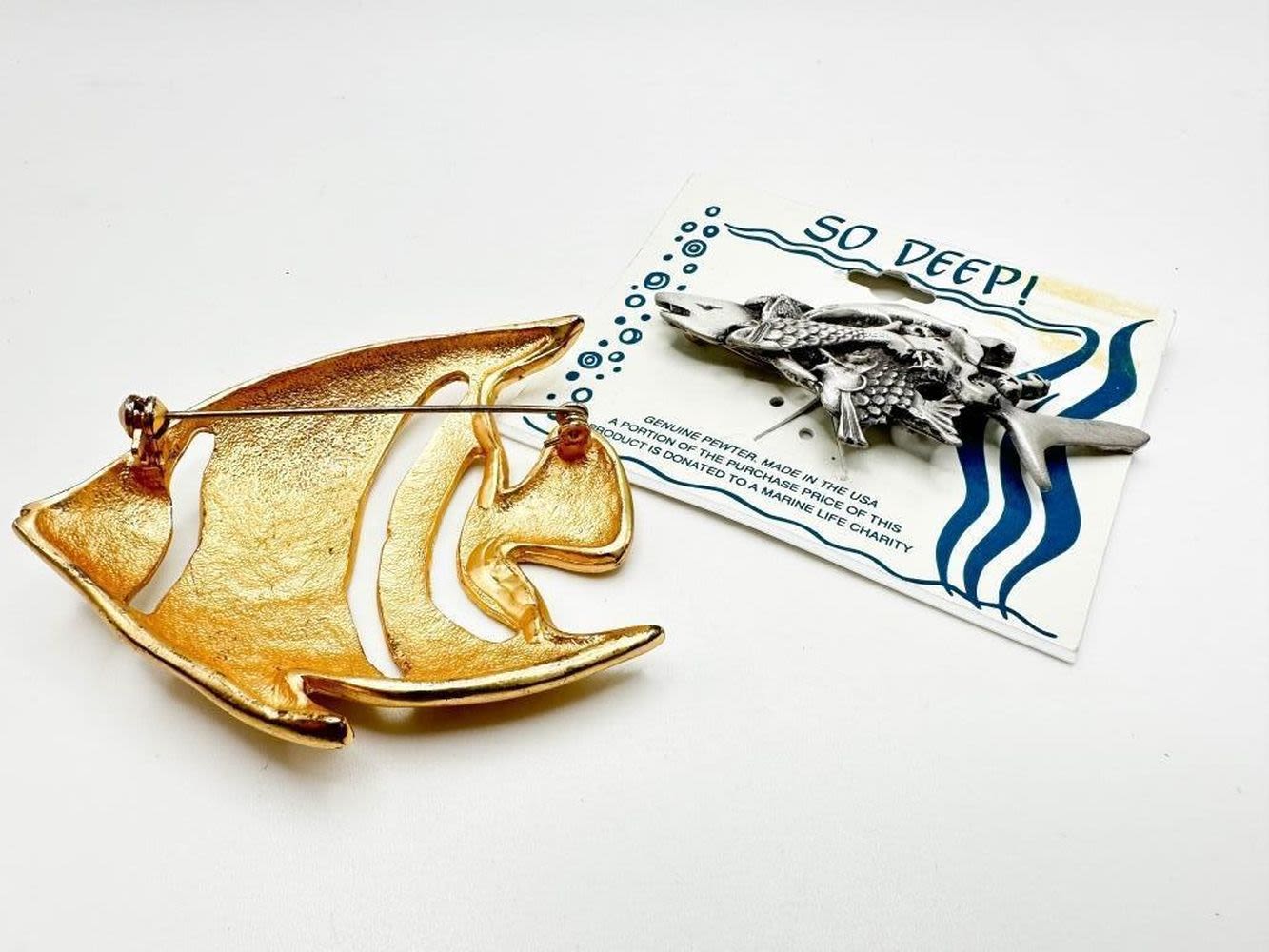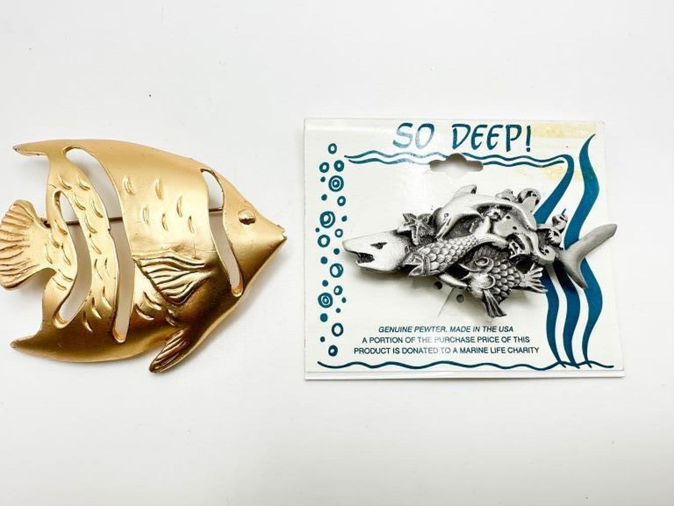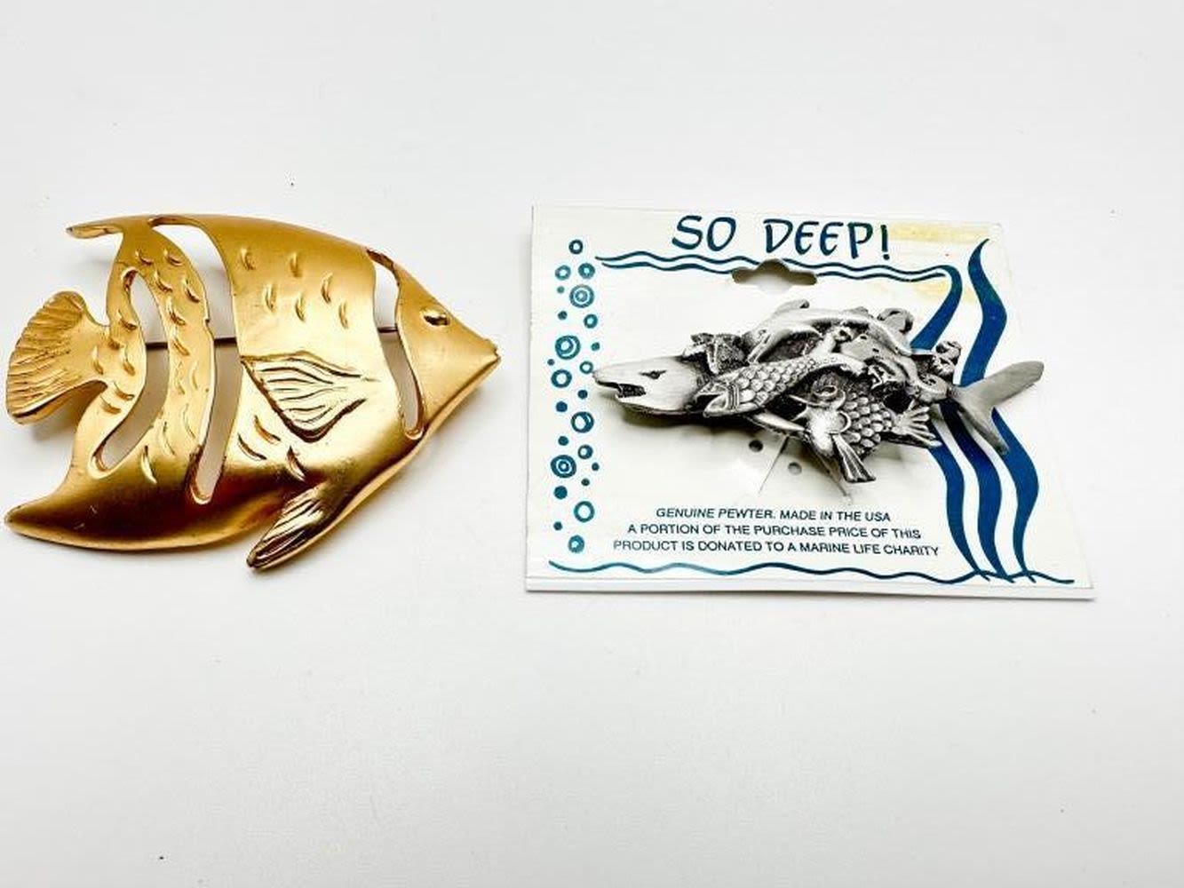 FISH BROOCHES 1 PEWTER, 1 GOLD TONE